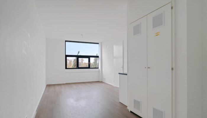 Het appartement beschikt over een aparte slaapkamer. Deze ligt aan de binnenzijde van het gebouw en biedt voldoende ruimte voor een tweepersoonsbed en kledingkast.