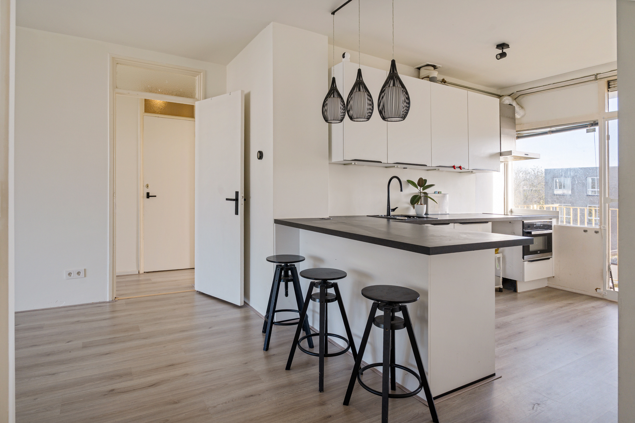 Aan de voorzijde ligt de lichte woonkamer met vrij uitzicht en toegang tot het oostelijk balkon, waar je in de ochtend geniet van de eerste zonnestralen. De moderne keuken (vernieuwd in 2020) bevindt zich aan de achterzijde en biedt toegang tot het tweede, westelijk gelegen balkon, perfect voor een drankje in de avondzon.