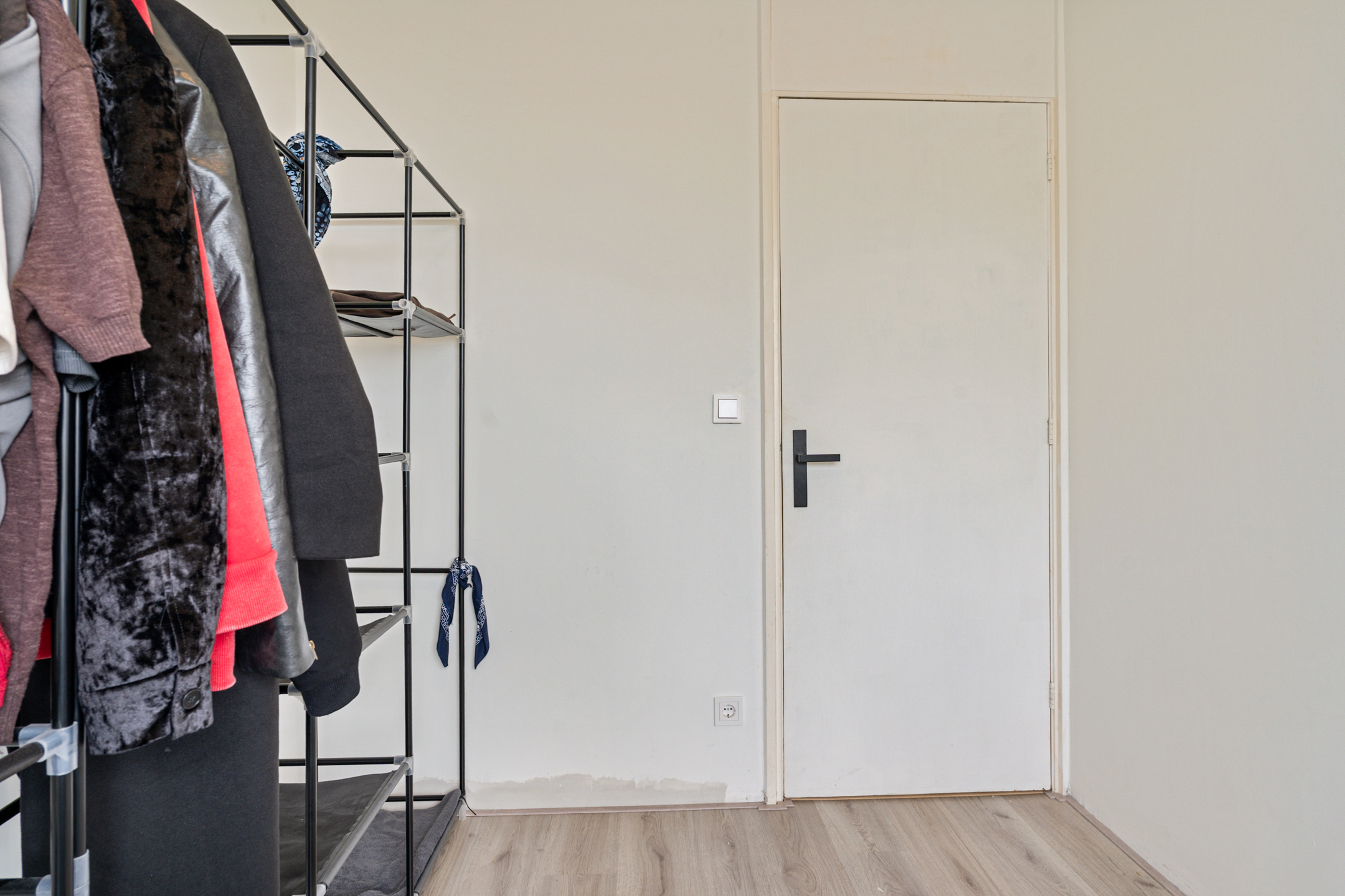 Via het gezamenlijke portiek bereik je de woning op de tweede verdieping. De hal geeft toegang tot alle vertrekken.