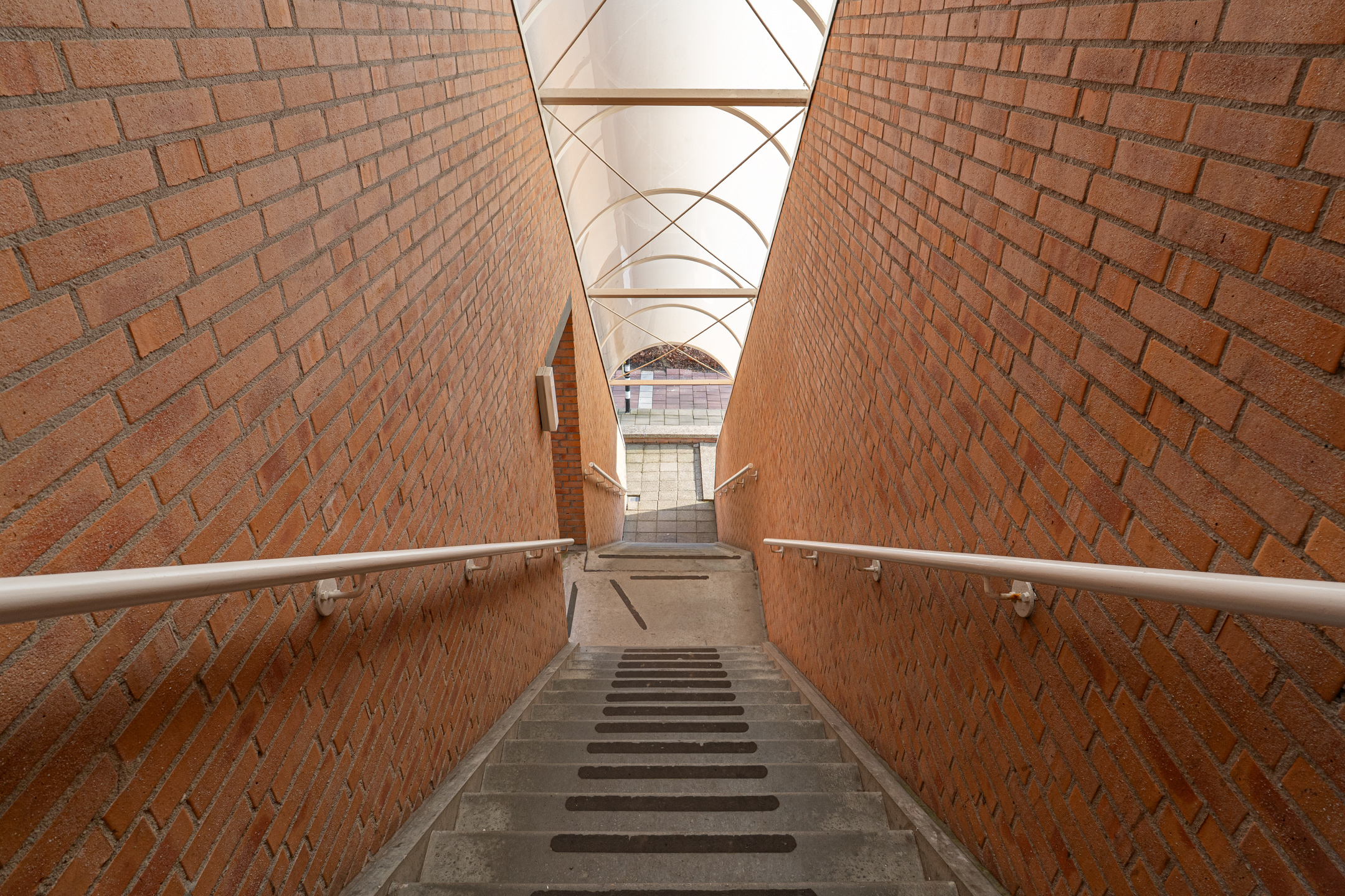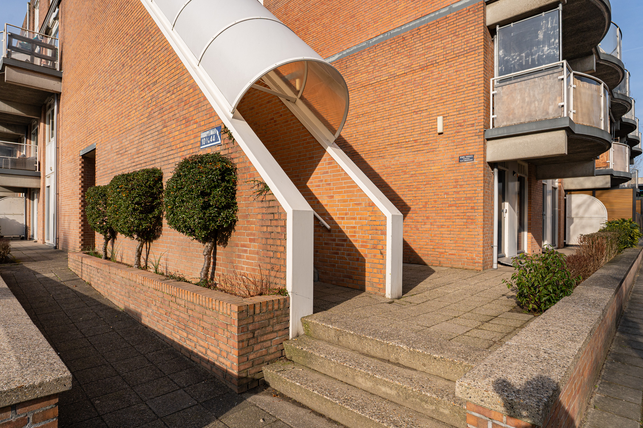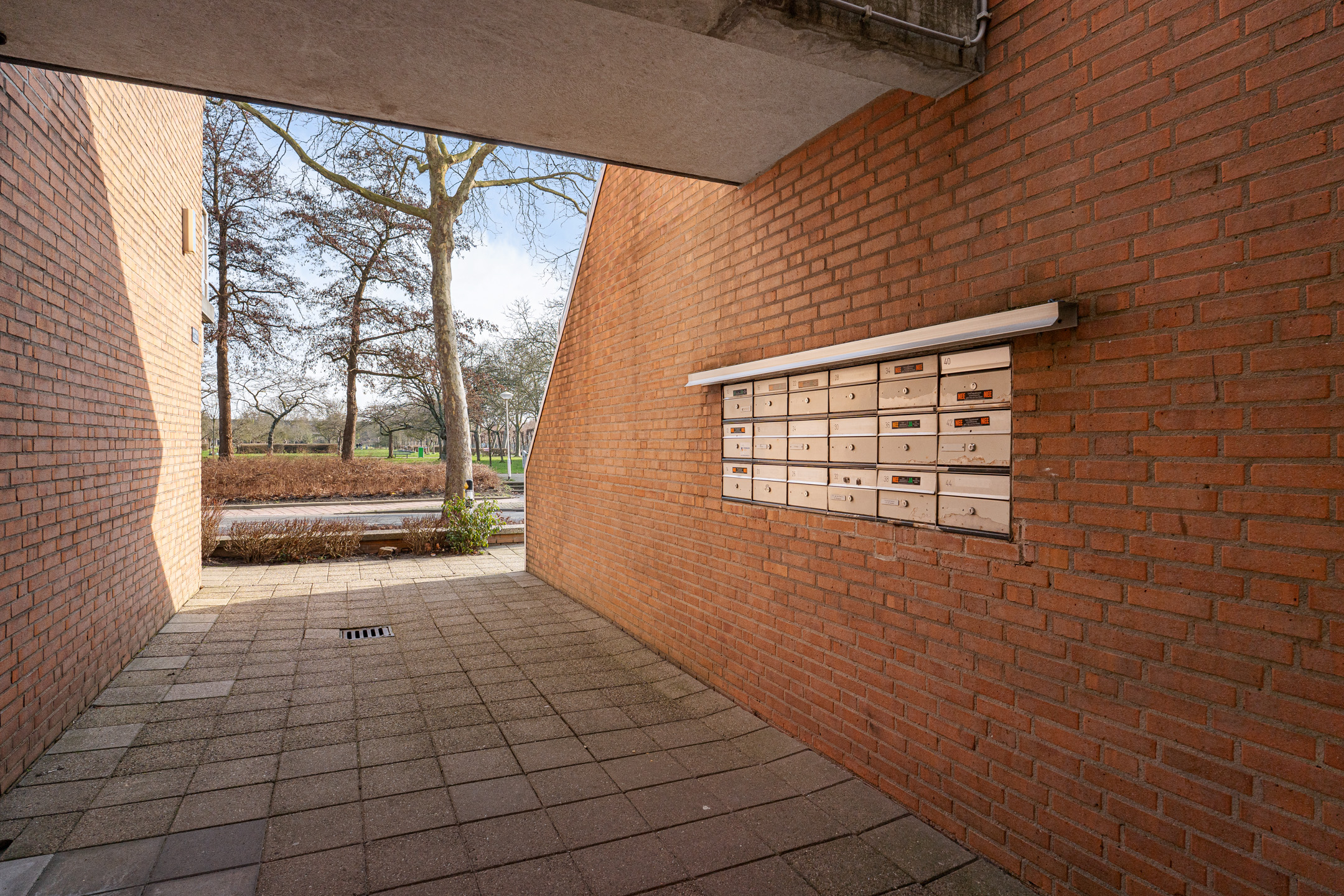 Afgesloten entree met brievenbussen en toegang tot de bergingen in de onderbouw.