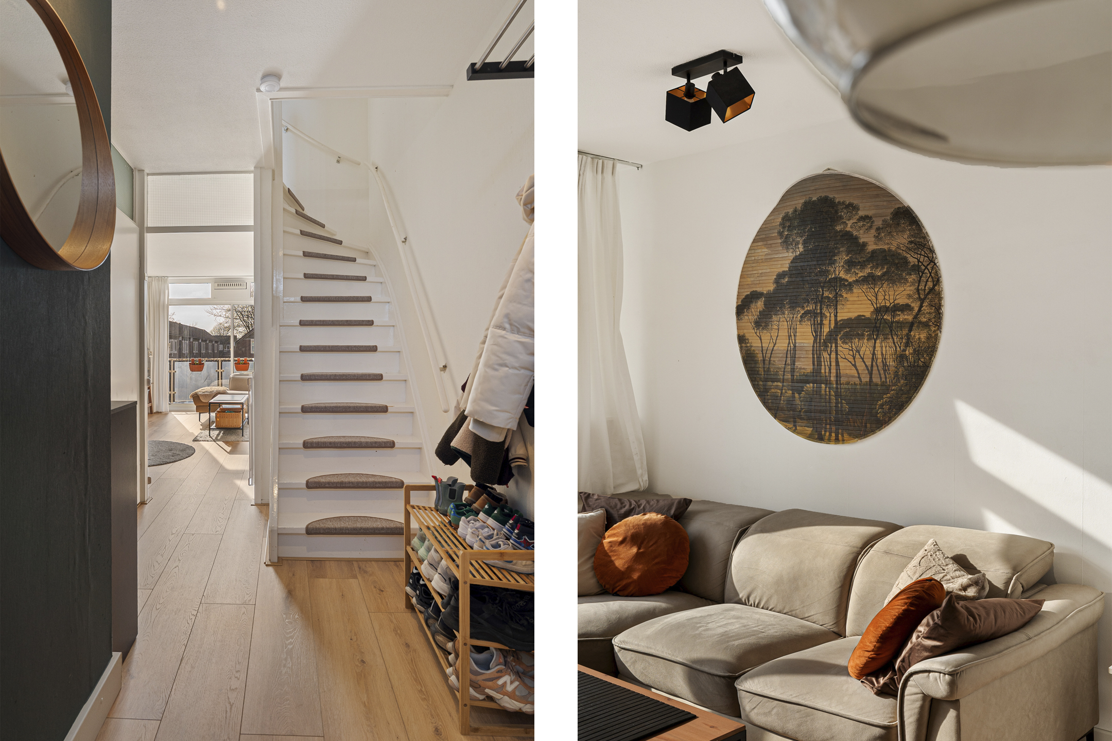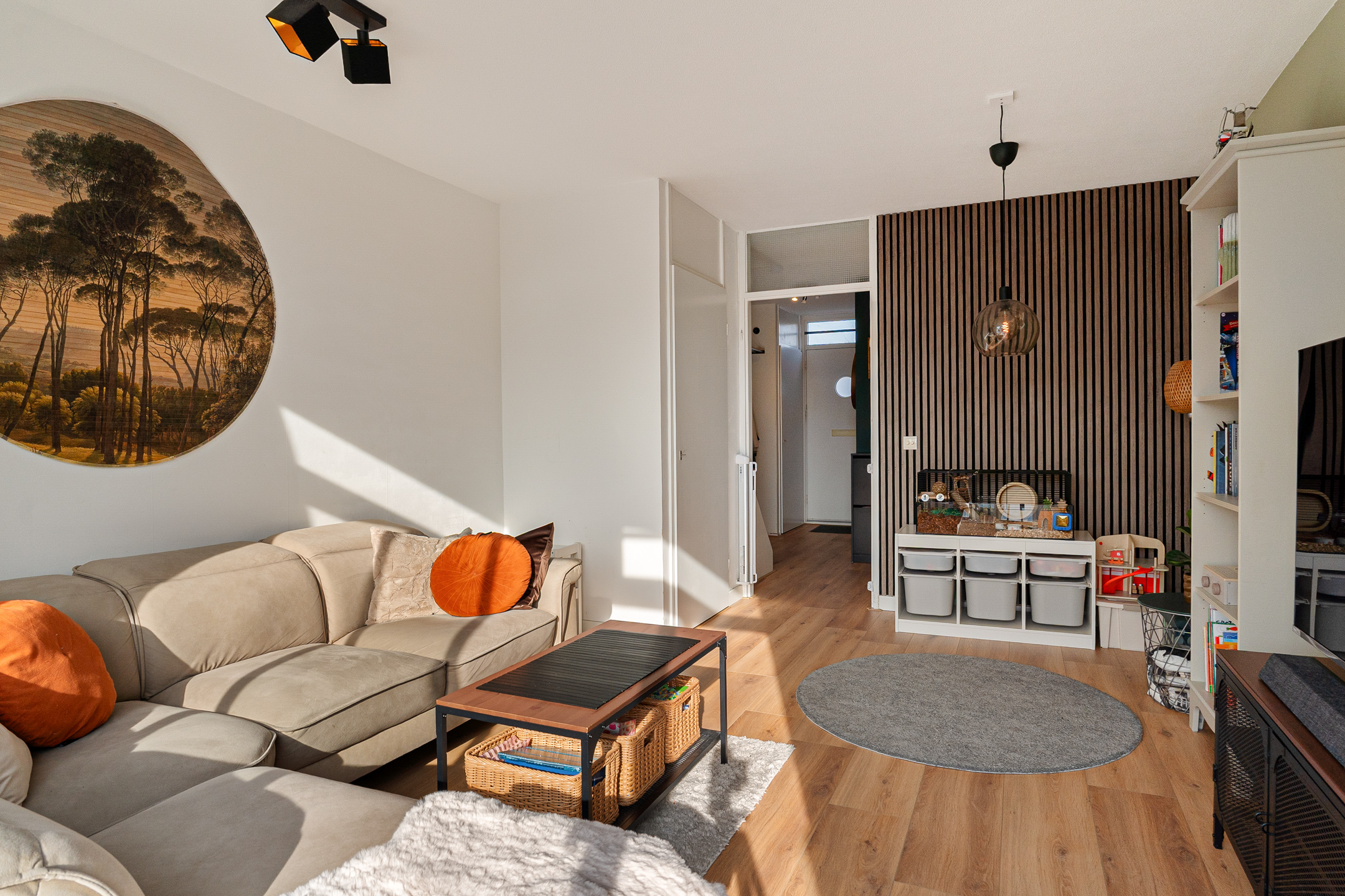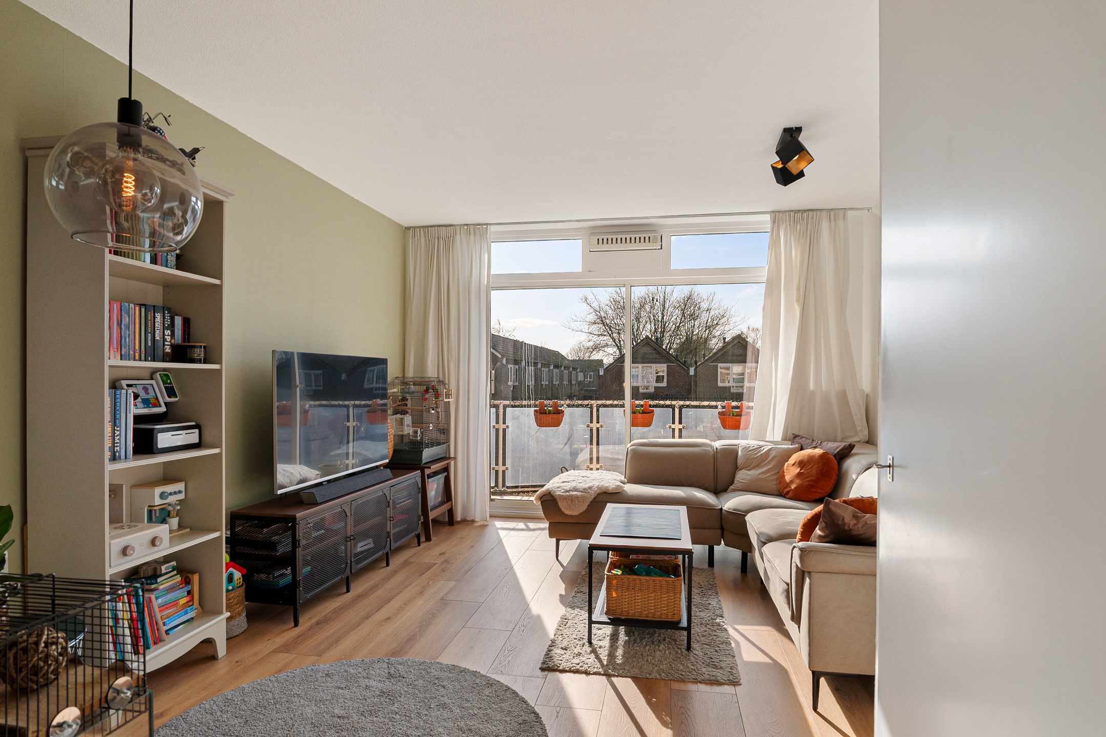 Aan de achterzijde ligt de lichte woonkamer met moderne laminaatvloer, praktische trapkast en schuifpui naar het zonnige balkon op het zuidwesten. Hier geniet u van middag- en avondzon.