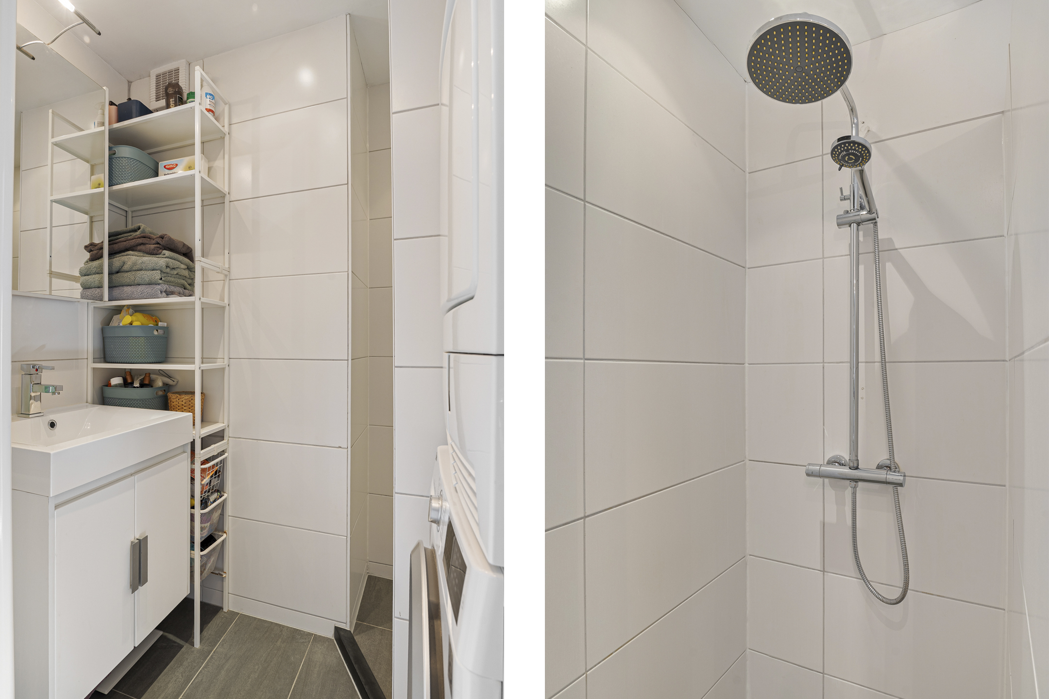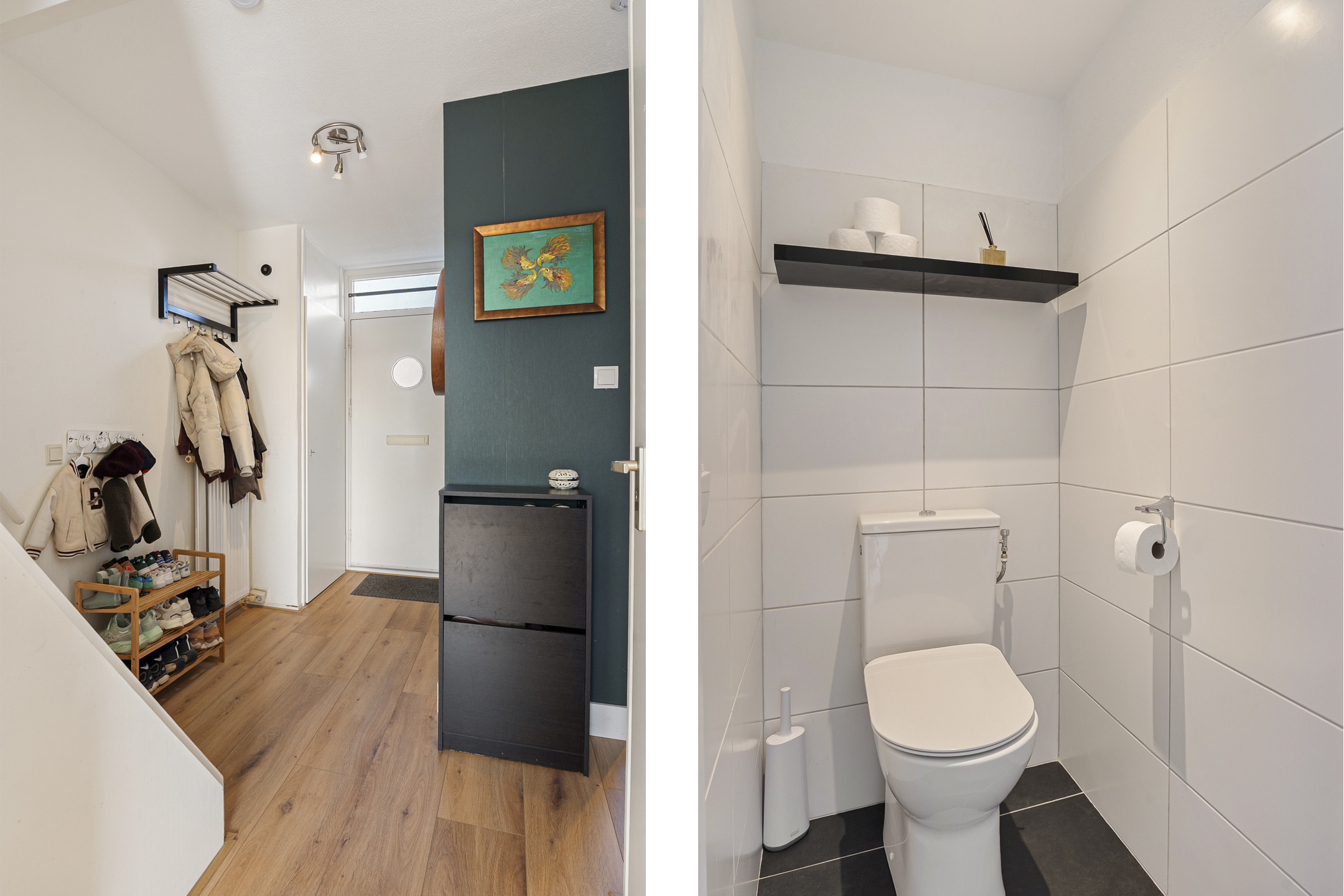 Entree op de tweede verdieping met hal en meterkast. Moderne toiletruimte met antracietgrijze vloertegels, witte wandtegels en duoblok.