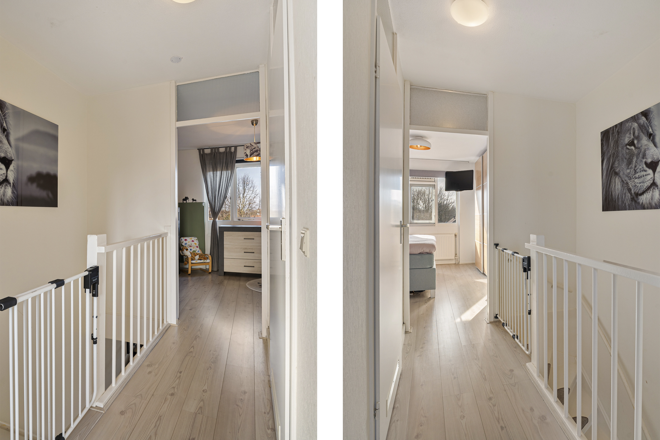 Via de trap bereikt u de slaapverdieping. De overloop geeft toegang tot twee goed bemeten slaapkamers van circa 13 m² en 10 m². De moderne badkamer is uitgerust met een inloopdouche, wastafelmeubel en opstelplaats voor de wasmachine.