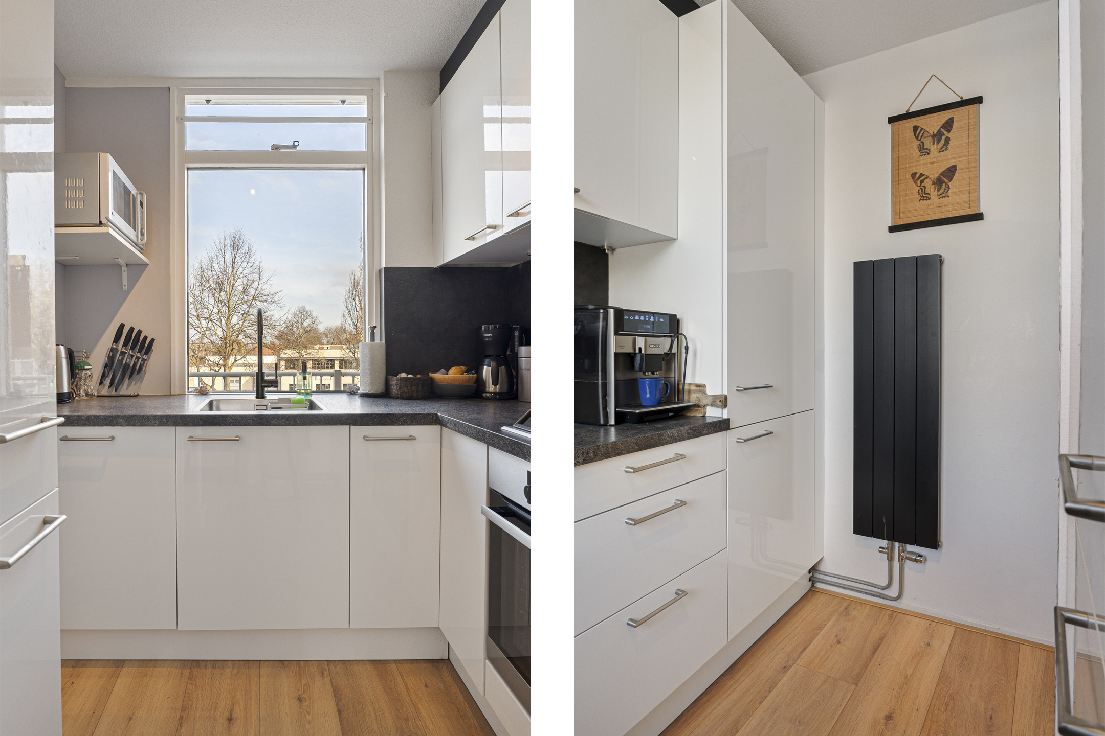 Direct te betrekken driekamer top-maisonnette met zonnig balkon op het zuidwesten. Moderne keuken met AEG inbouwapparatuur. Lichte woonkamer met schuifpui naar het balkon.