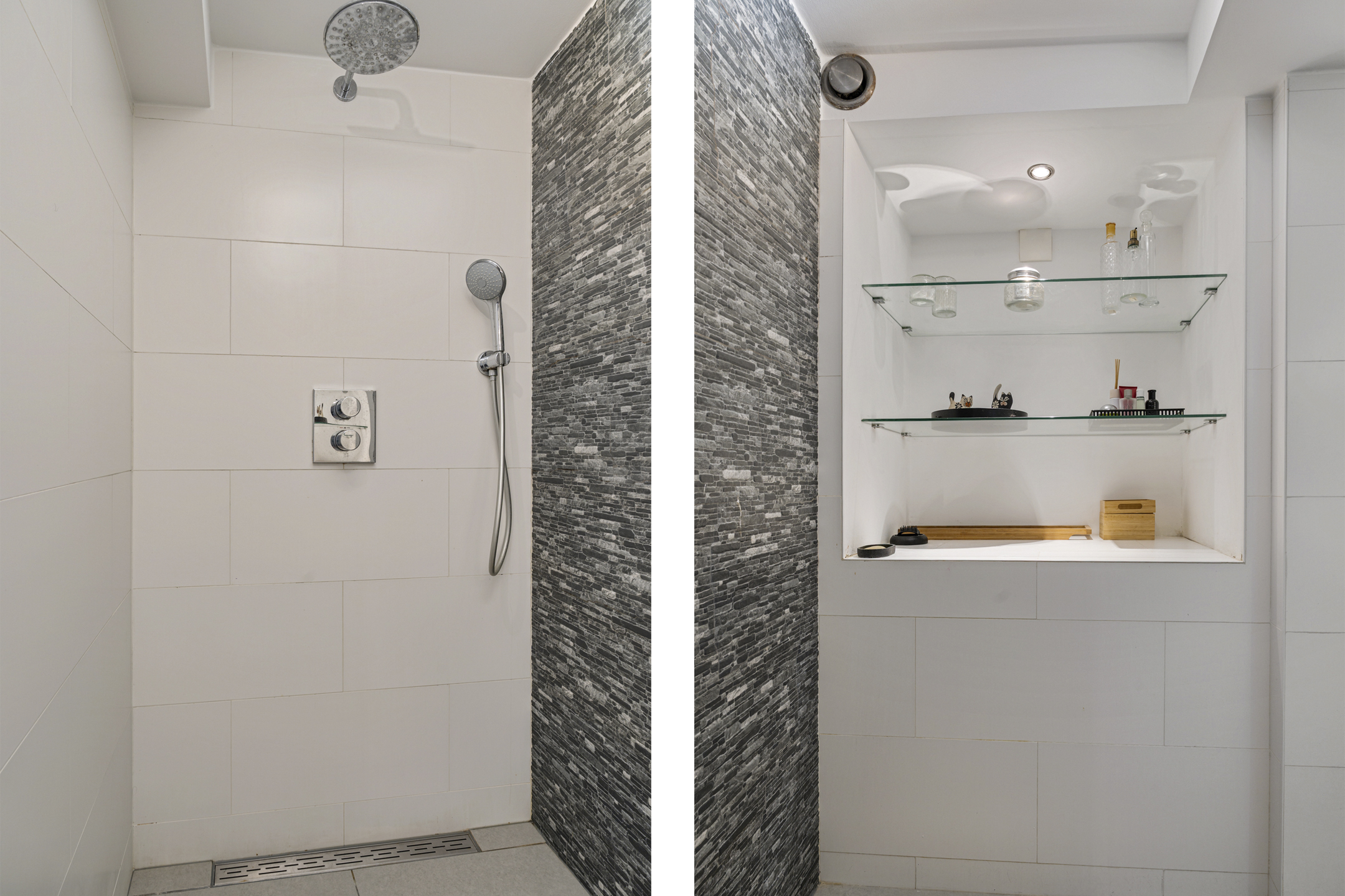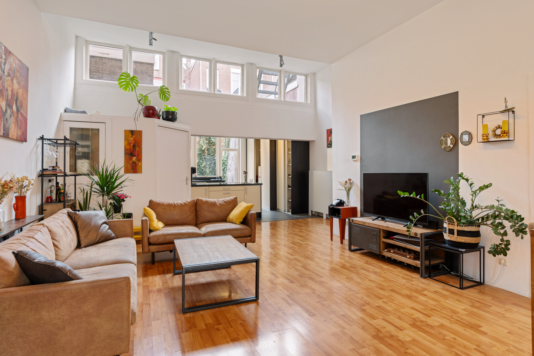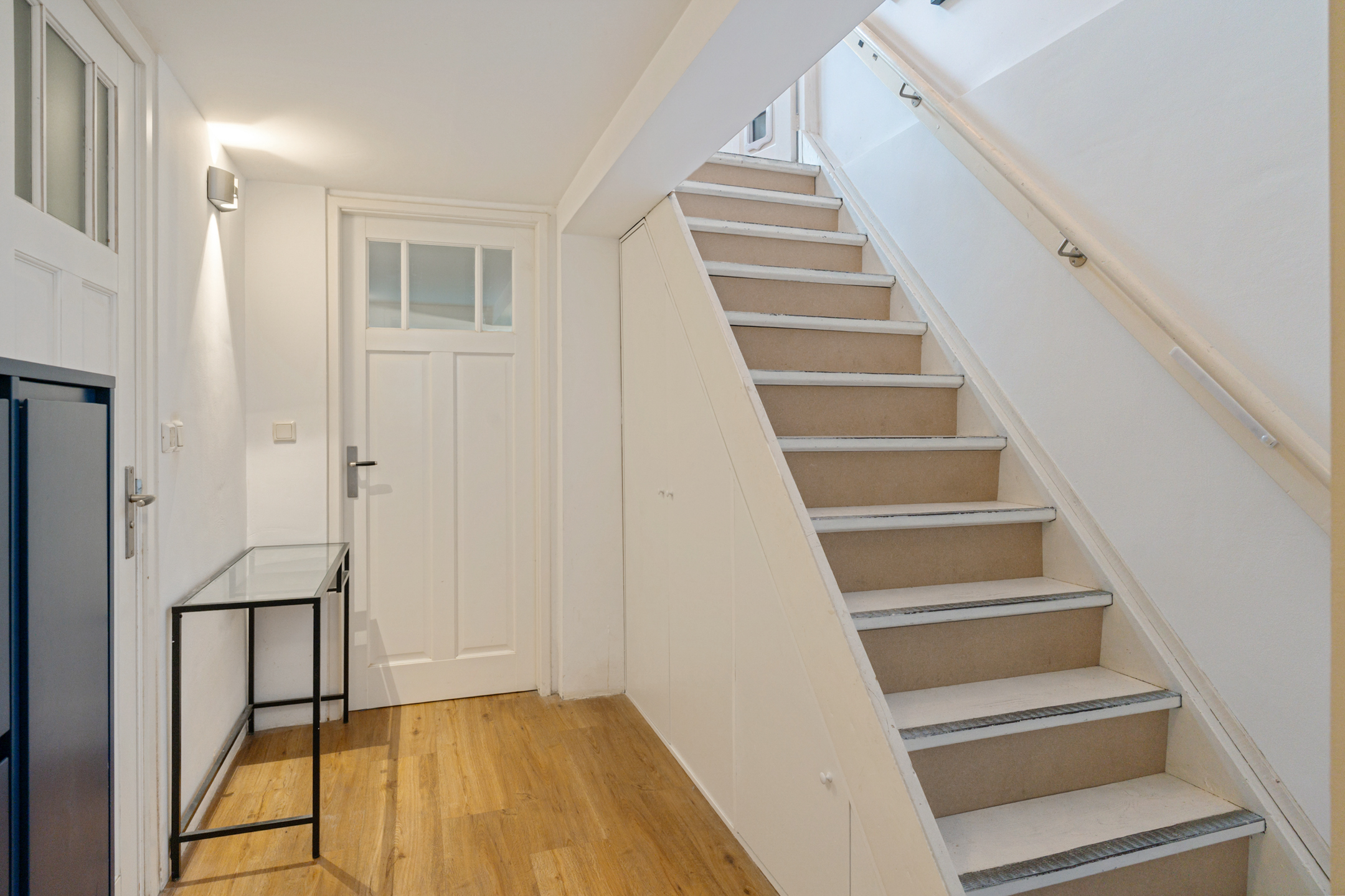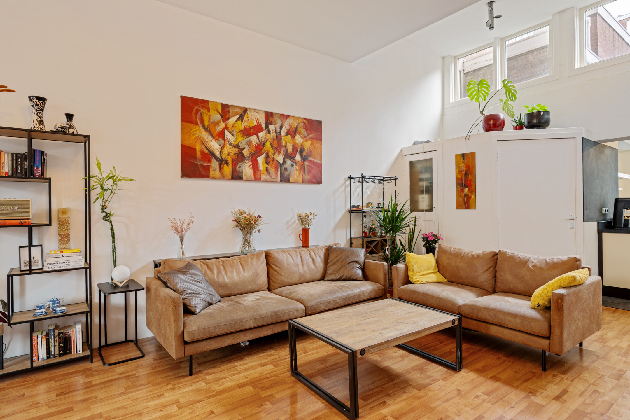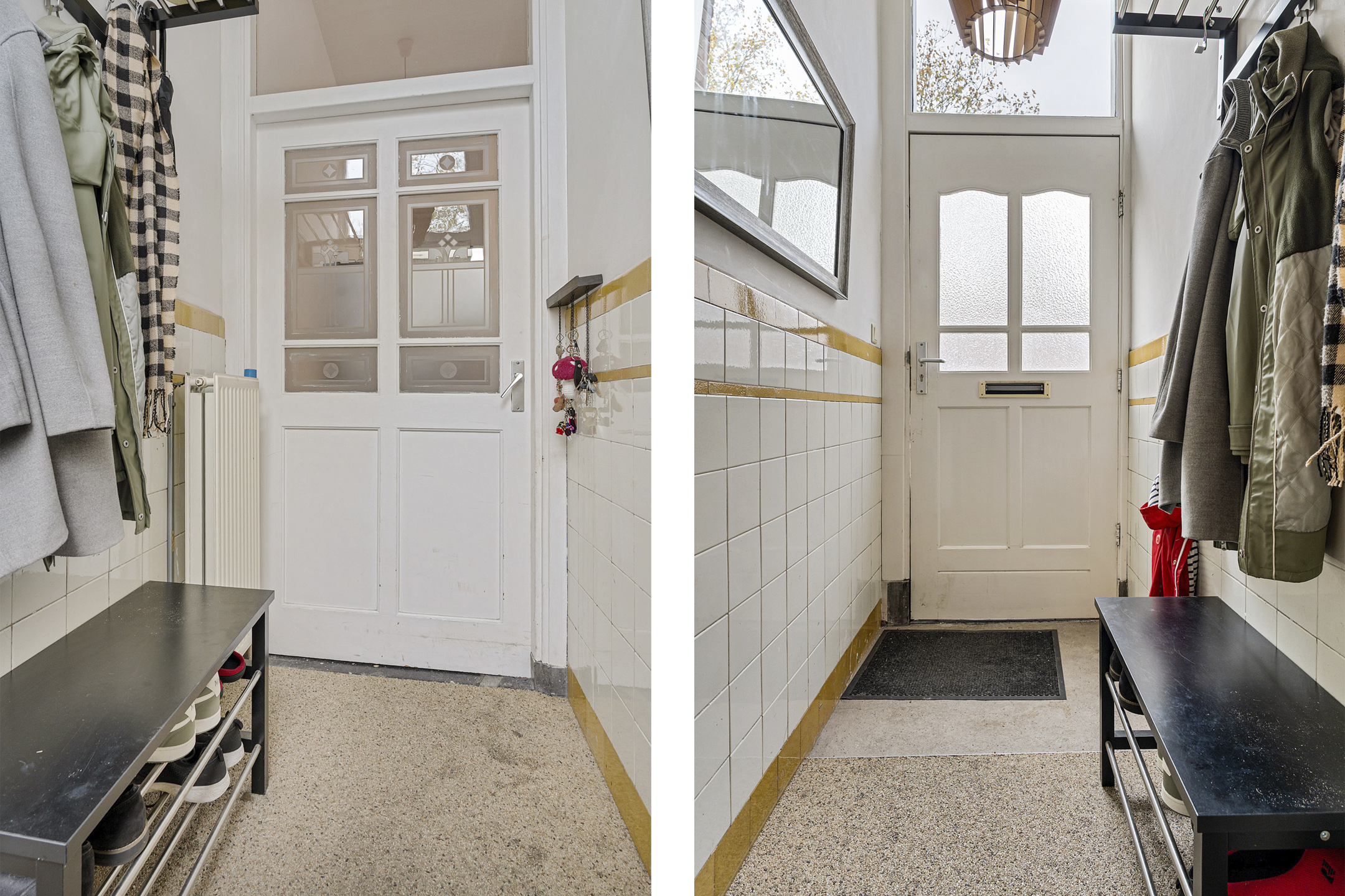 Via de entree kom je in de hal die toegang biedt tot de woonkamer. De woon- en eetkamer vallen direct op door de hoge plafonds en de hoeveelheid licht die binnenkomt via de hoge ramen en de raampartijen aan de voor- en achterzijde. De ruimte is royaal en flexibel in te delen, met een praktische bergkast voor extra opbergruimte.