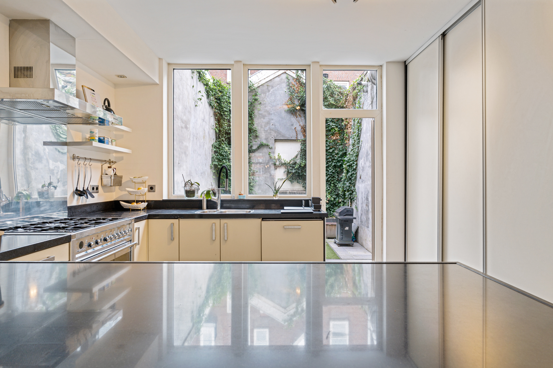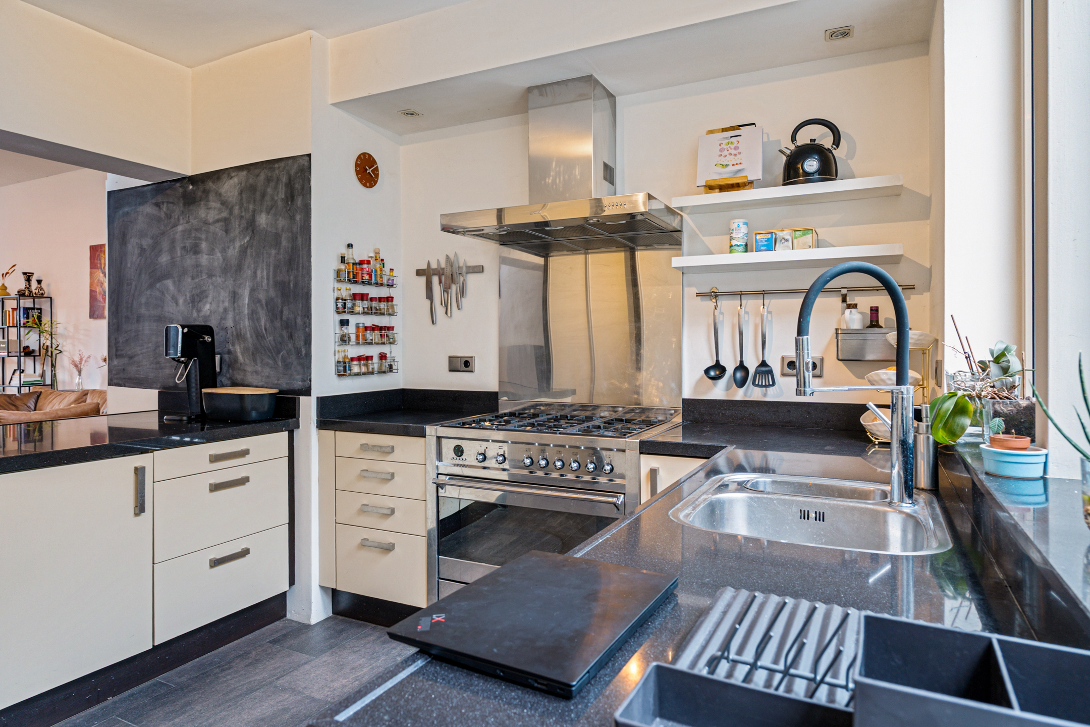 De open keuken in U-opstelling is uitgevoerd met een 6-pitsgasfornuis, vaatwasser, oven, afzuigkap en koelkast. In de kastenwand zijn aansluitingen voor de wasmachine en droger netjes weggewerkt. Vanuit de keuken loop je door naar de achtertuin (ca. 32 m²).