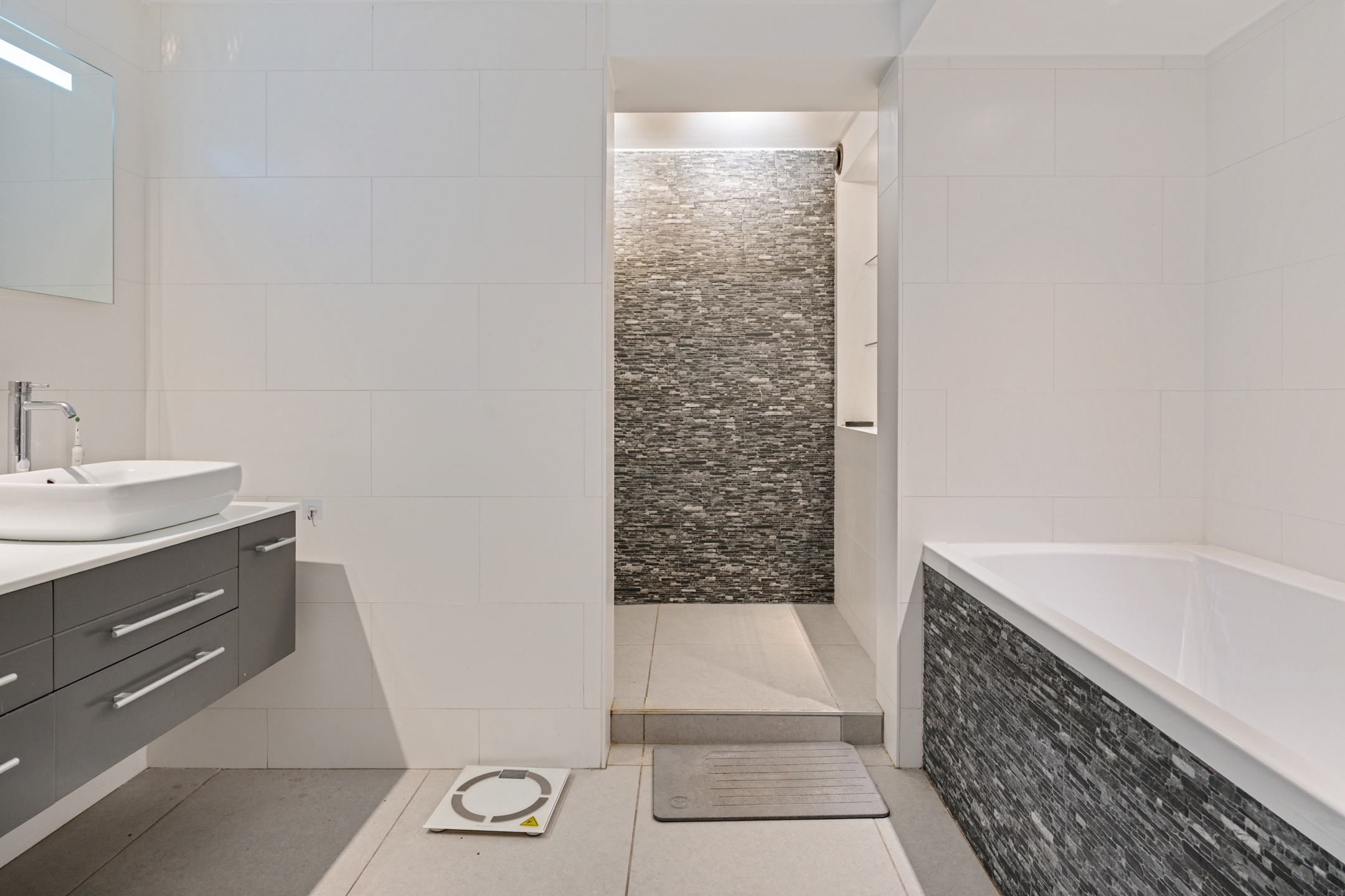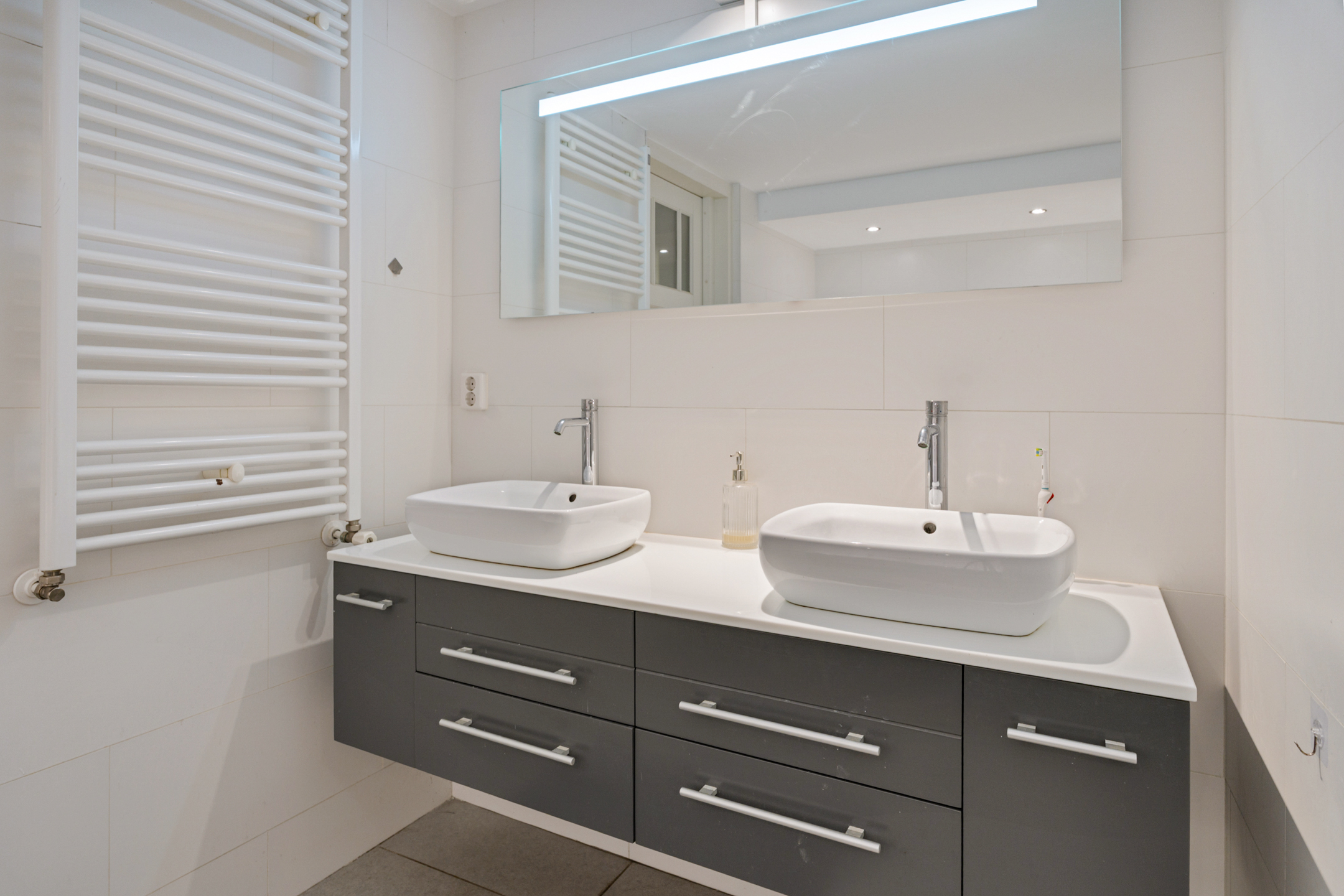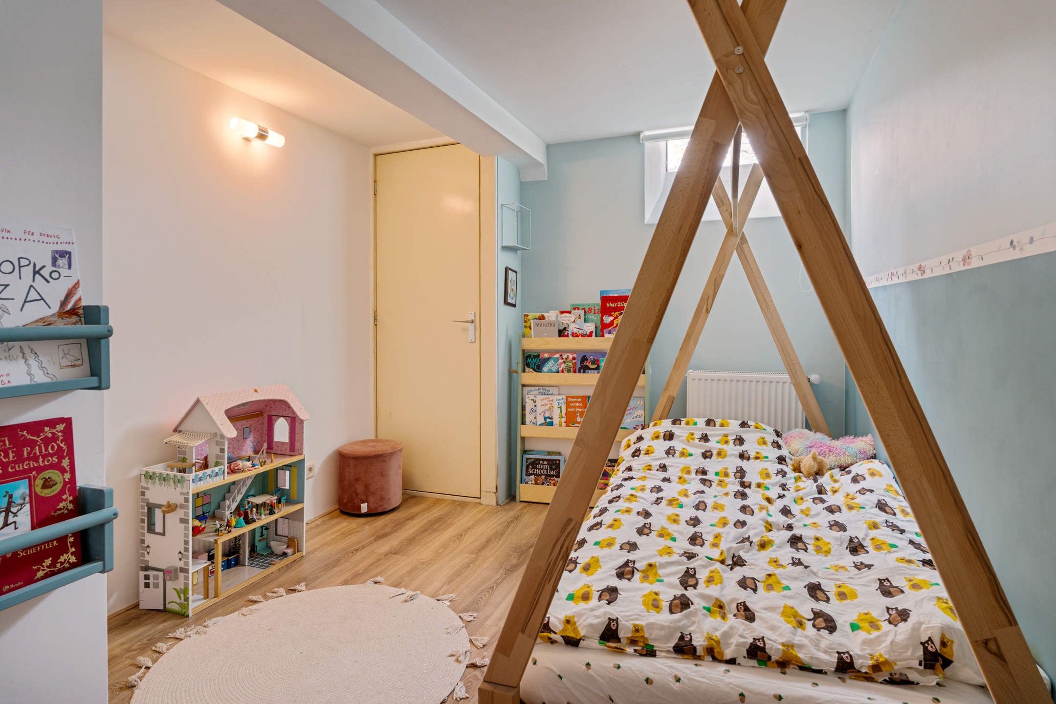 De overloop geeft toegang tot alle kamers. Aan de achterzijde ligt de huidige hoofdslaapkamer, afgewerkt met een PVC-vloer en voorzien van een walk-in-closet van circa 5 m² met inbouwkast. Aan de voorzijde liggen twee extra slaapkamers, ideaal als kinder-, werk- of logeerkamer. De badkamer is volledig betegeld en uitgerust met een grote inloopdouche, ligbad en dubbele wastafel.