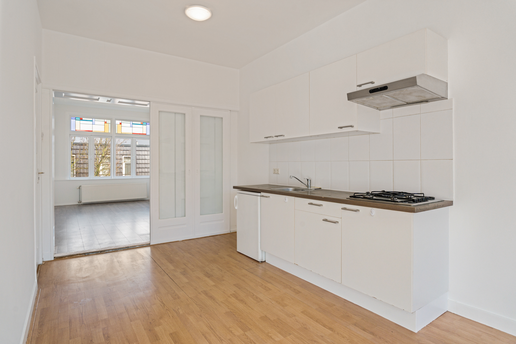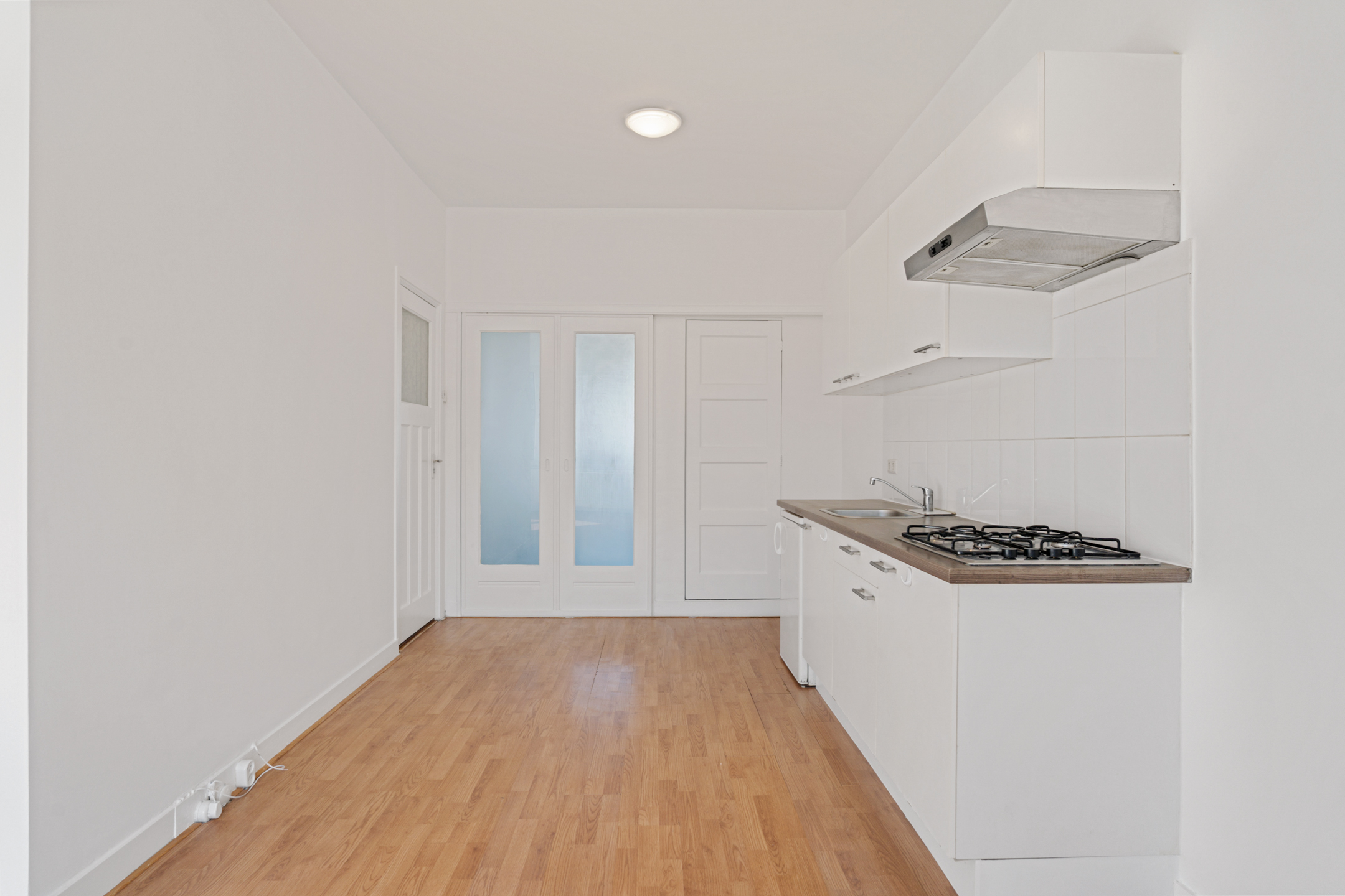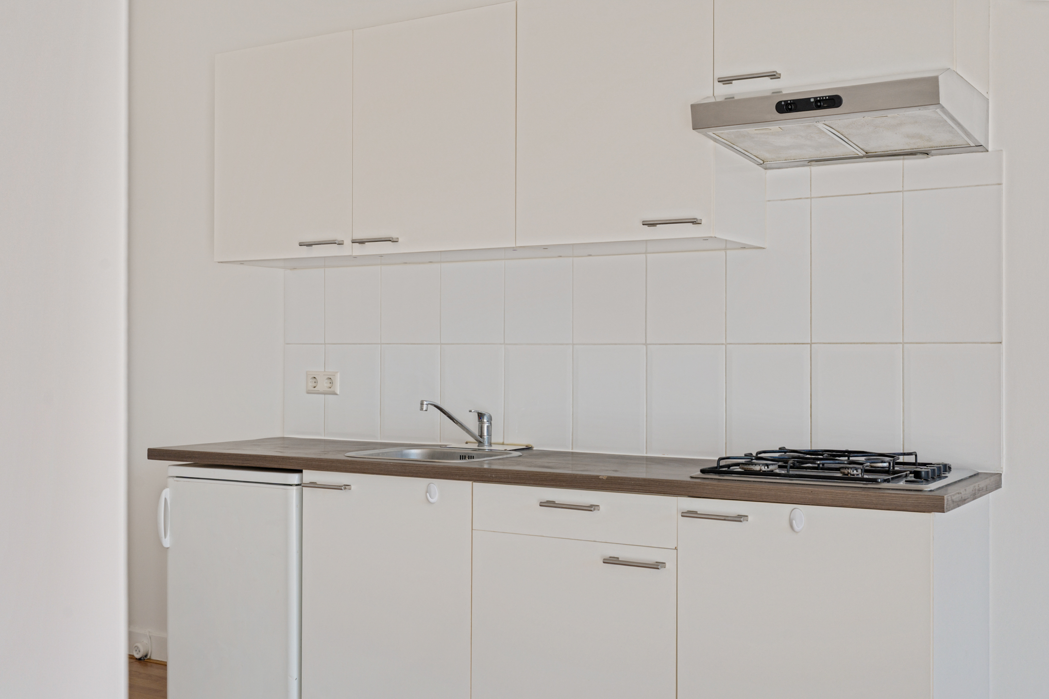 Aan de achterzijde van de woning bevindt zich de keuken met toegang tot het balkon, gelegen aan de rustige achterzijde van het pand. De keuken is voorzien van een koelkast, vierpits gasfornuis, wasbak en veel werkruimte. Via een schuifdeur is vanuit de keuken de slaapkamer aan de achterzijde bereikbaar.