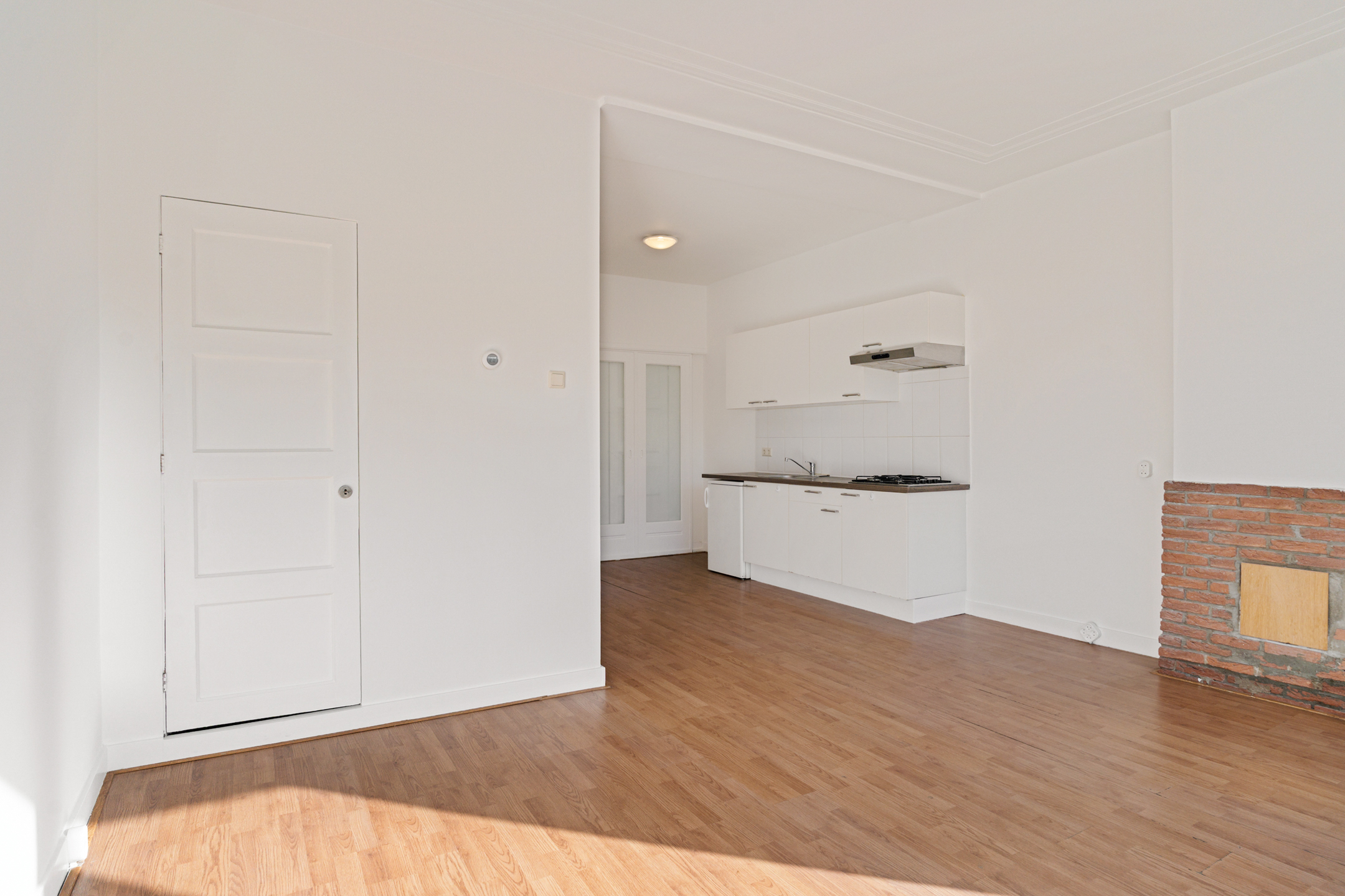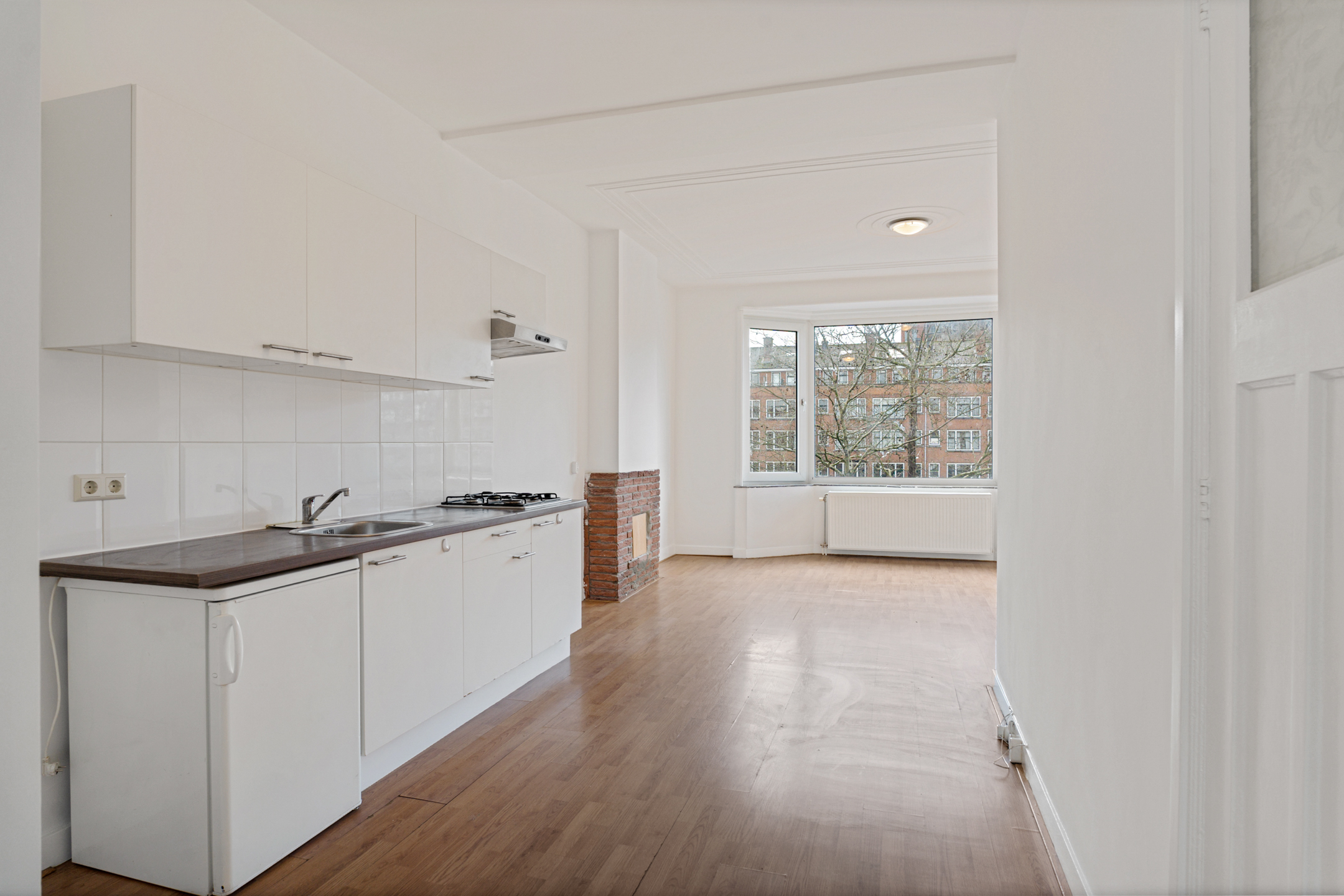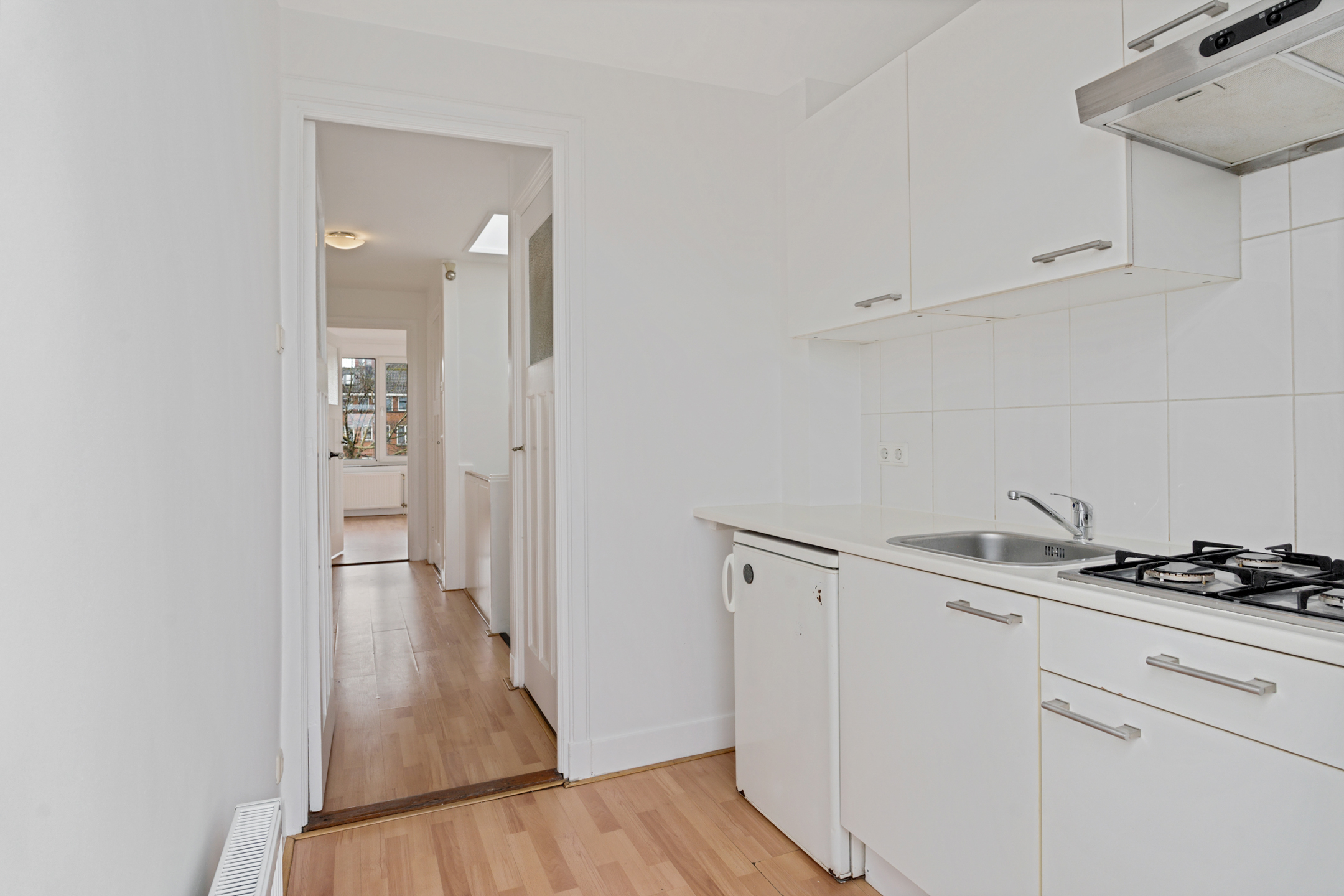Aan de achterzijde van de woning bevindt zich de keuken met toegang tot het balkon, gelegen aan de rustige achterzijde van het pand. De keuken is voorzien van een koelkast, vierpits gasfornuis, wasbak en veel werkruimte. Via een schuifdeur is vanuit de keuken de slaapkamer aan de achterzijde bereikbaar.