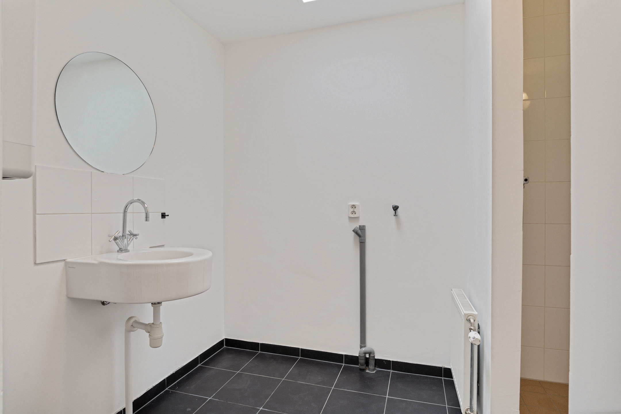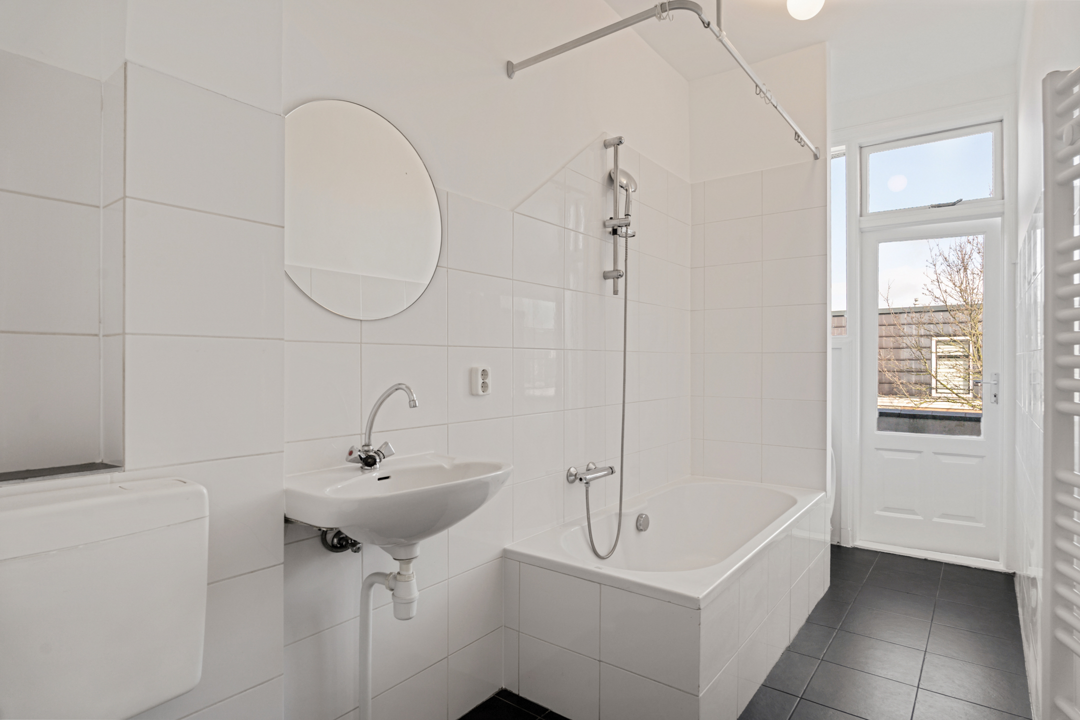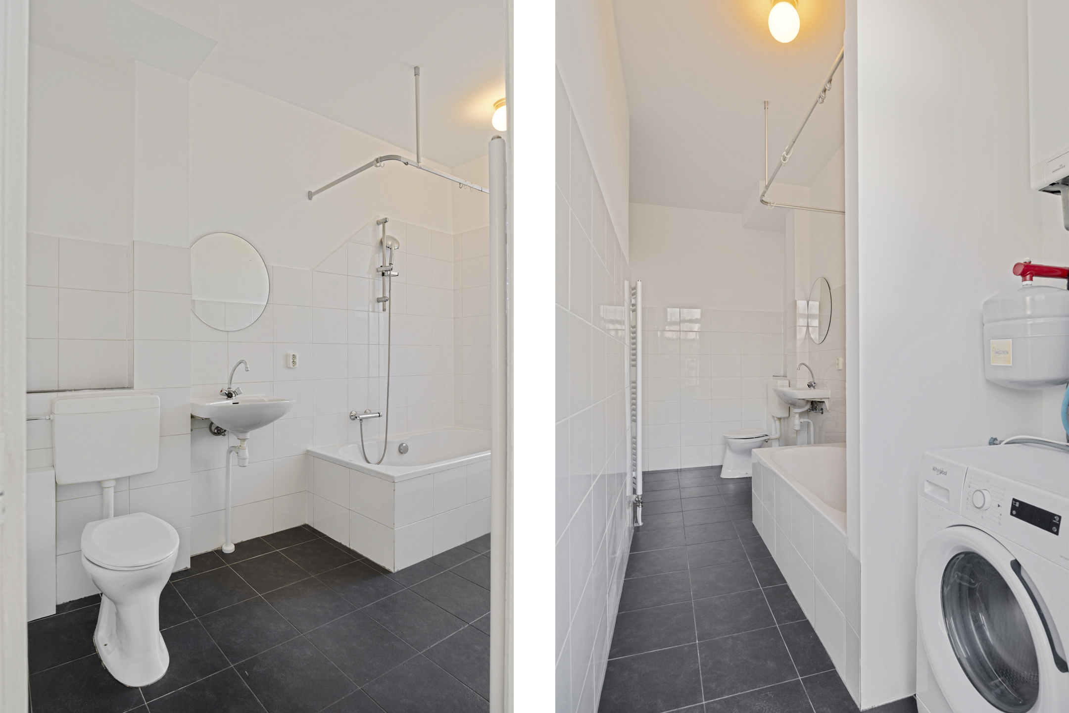 Direct naast de slaapkamer, eveneens aan de achterzijde gelegen, bevindt zich de badkamer. Deze ruime badkamer is voorzien van een bad met douchegarnituur, wastafel met spiegel, toilet, handdoekradiator en een wasmachineaansluiting. Via de badkamer is het balkon aan de achterzijde te bereiken.