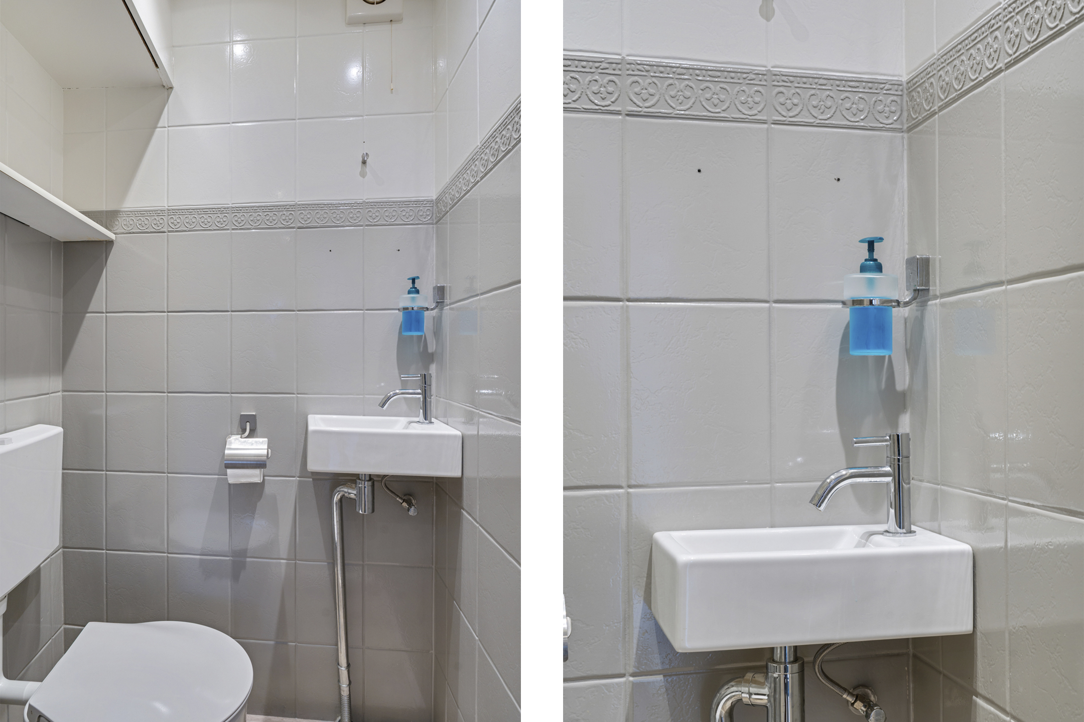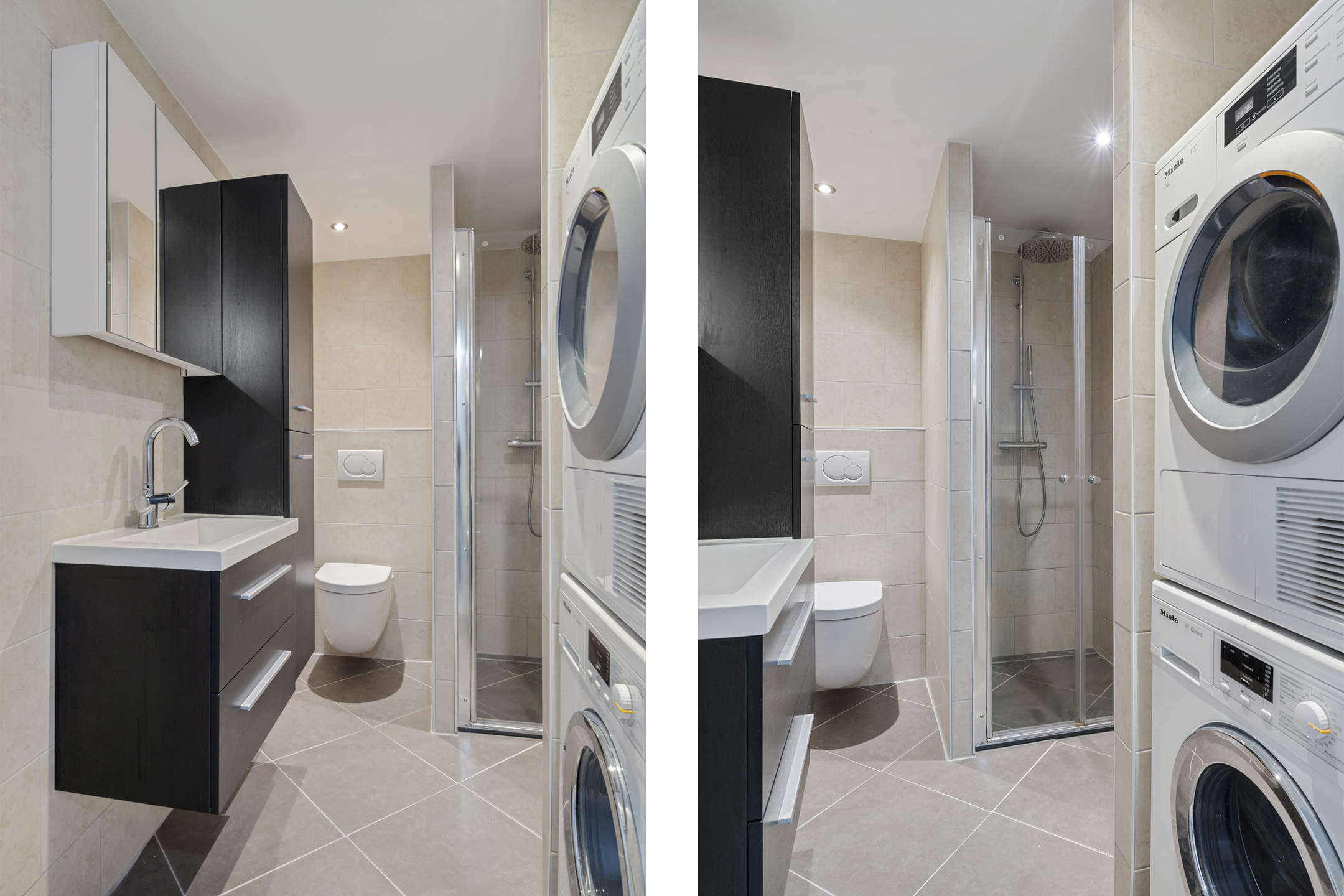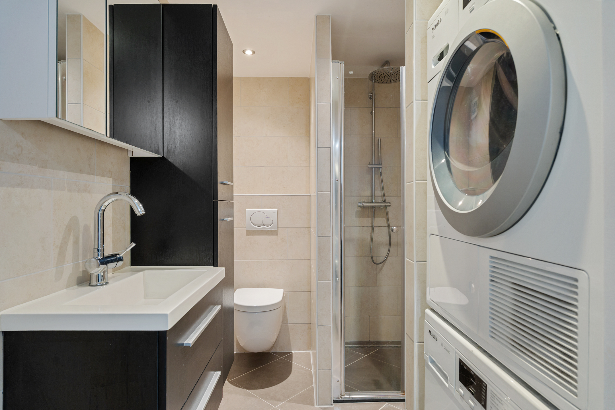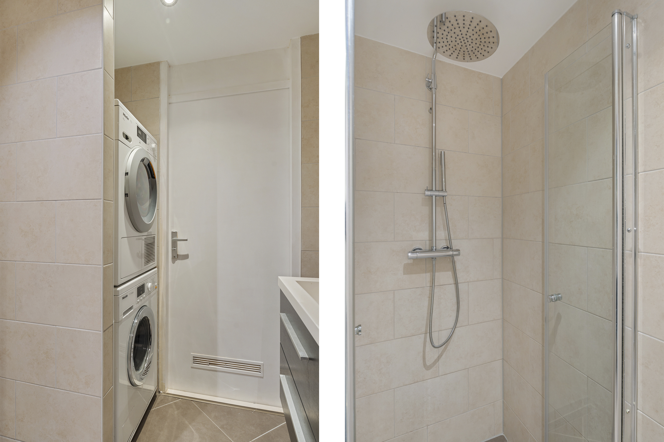 De badkamer is modern afgewerkt en slim ingedeeld. Je beschikt hier over een douche, een wastafelmeubel en een toilet. Daarnaast is er ruimte voor de wasmachine en droger, netjes opgesteld zodat alles efficiënt bij elkaar zit. De lichte tegels geven de ruimte een frisse en verzorgde uitstraling.