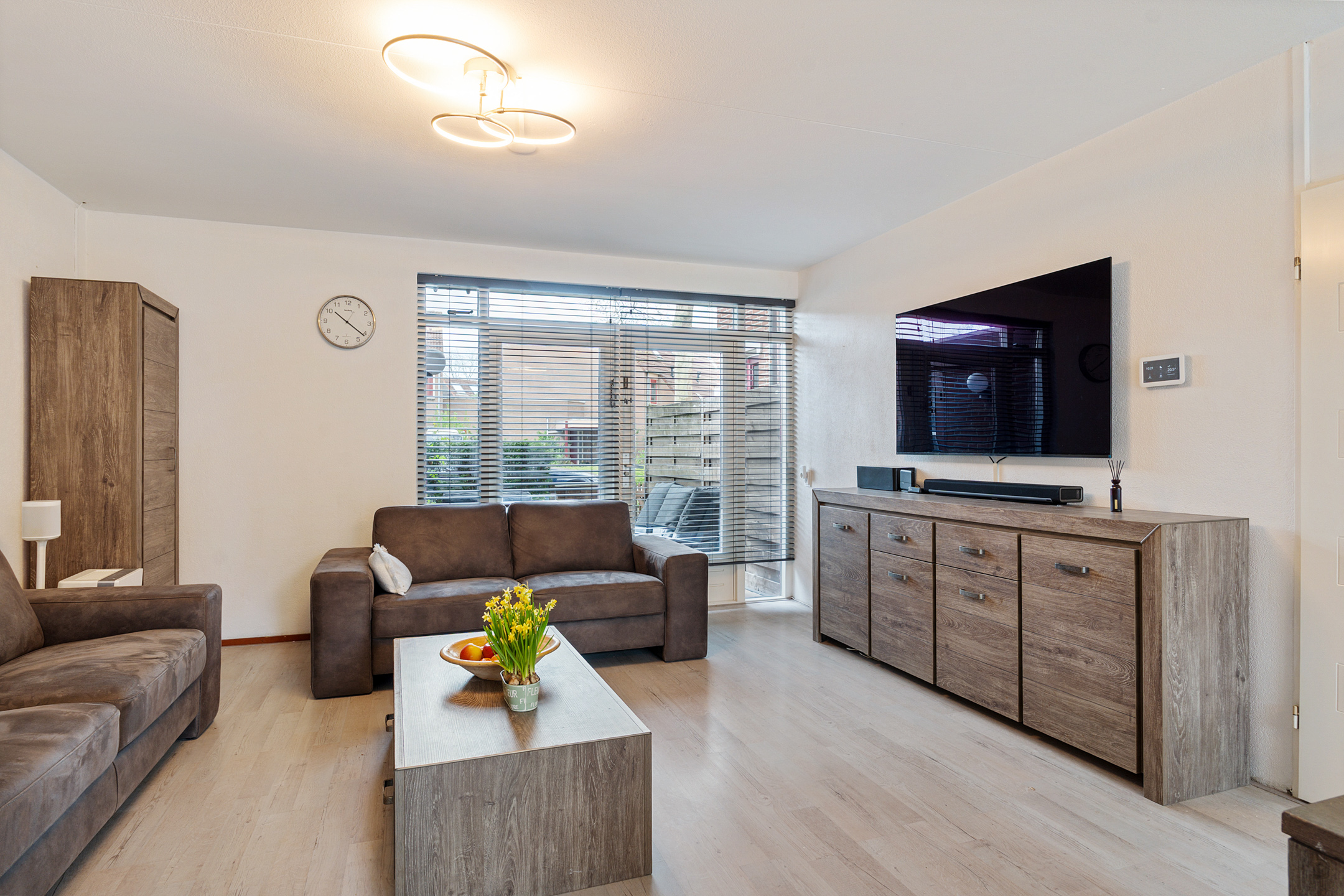 De woonkamer is heerlijk licht dankzij de grote raampartijen aan de achterzijde. De ruimte is strak afgewerkt en biedt volop mogelijkheden om een gezellige zithoek en eethoek te creëren. Vanuit de woonkamer heb je direct toegang tot de tuin, wat zorgt voor een fijne verbinding tussen binnen en buiten.