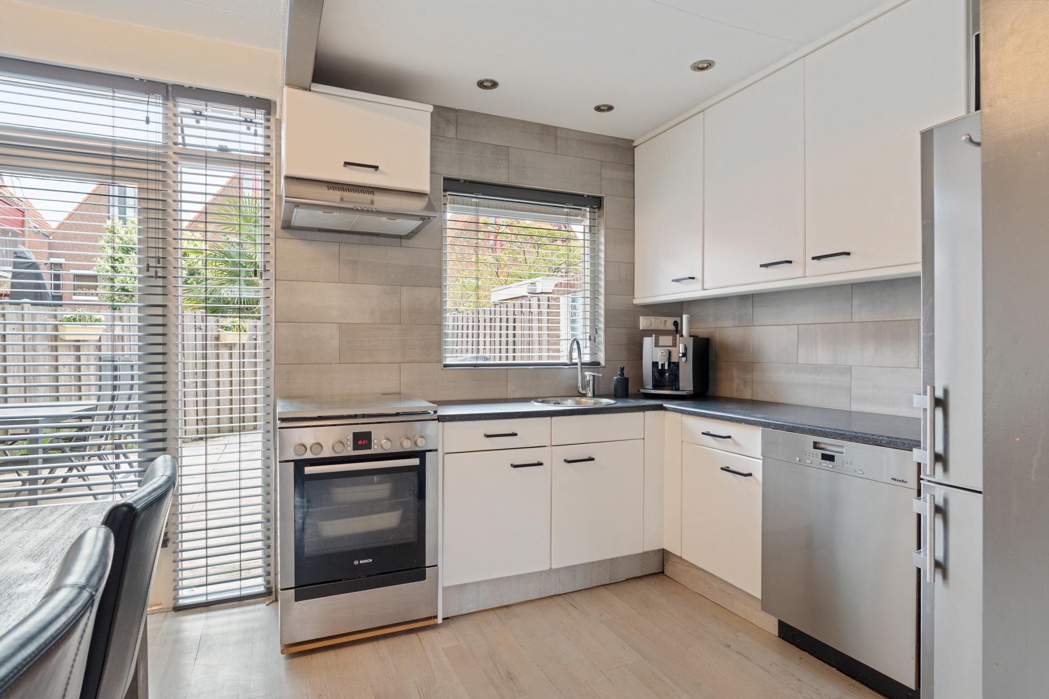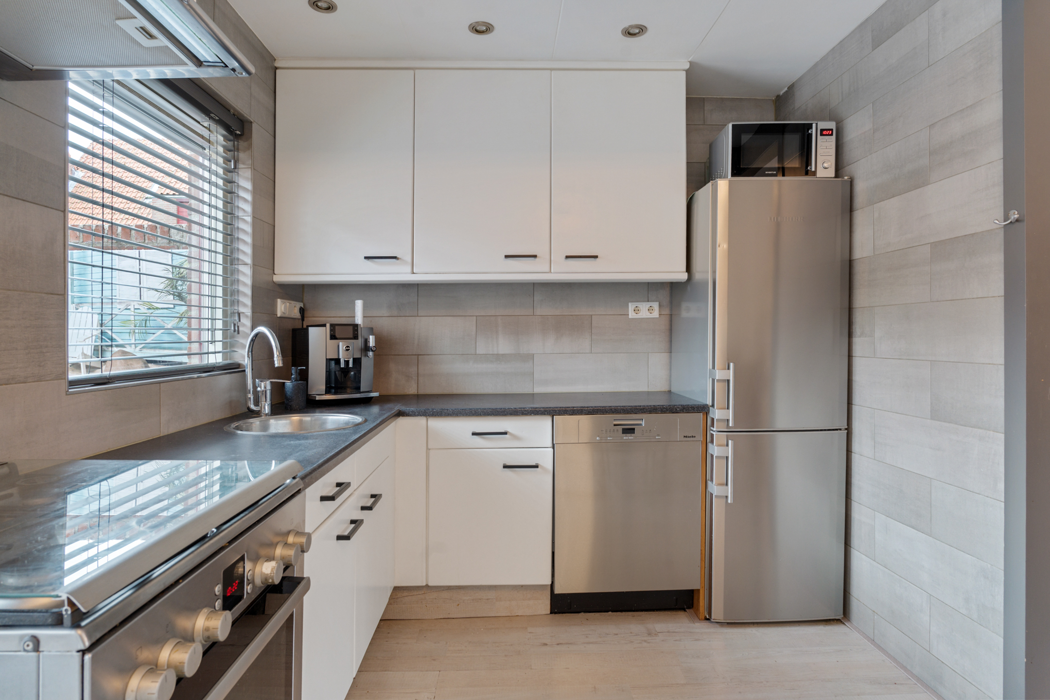 De keuken is praktisch ingericht in een hoekopstelling en sluit naadloos aan op de eethoek. Je beschikt hier over voldoende werkblad en kastruimte, waardoor koken prettig en overzichtelijk blijft. Dankzij de ramen komt er veel daglicht binnen, wat zorgt voor een frisse en open sfeer.