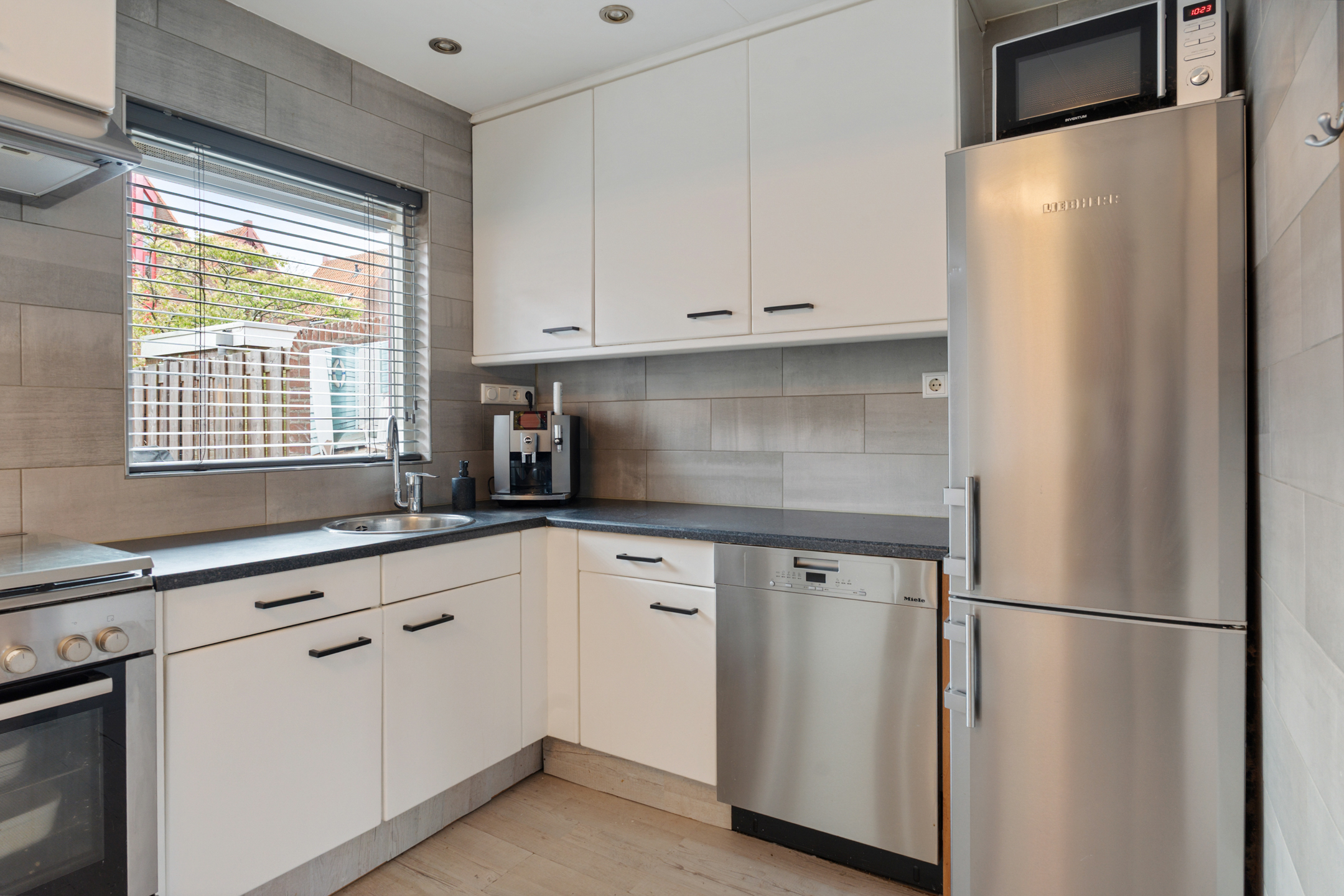 De keuken is voorzien van diverse keuken apparatuur, waaronder een oven, afzuigkap en vaatwasser. De vrijstaande koelkast biedt extra opbergruimte voor je boodschappen. Vanuit de keuken heb je direct toegang tot de tuin, ideaal wanneer je op warme dagen binnen en buiten met elkaar wilt verbinden.