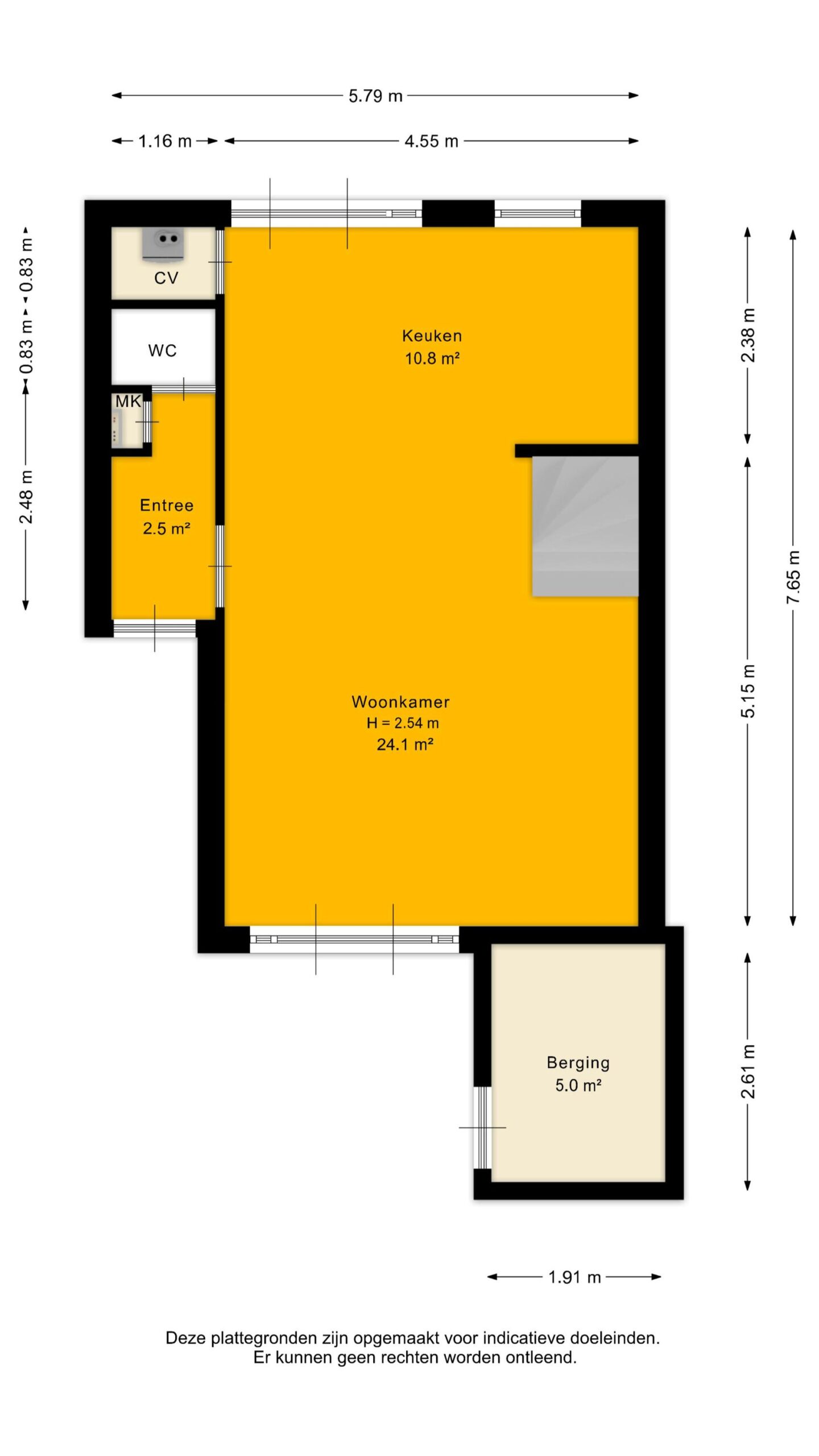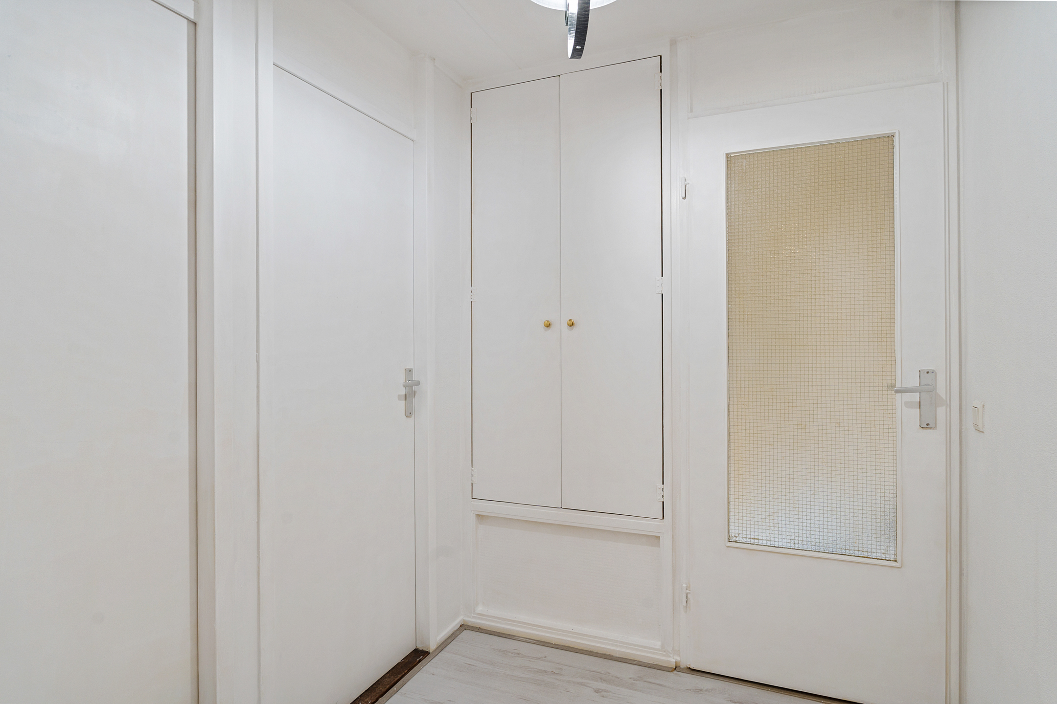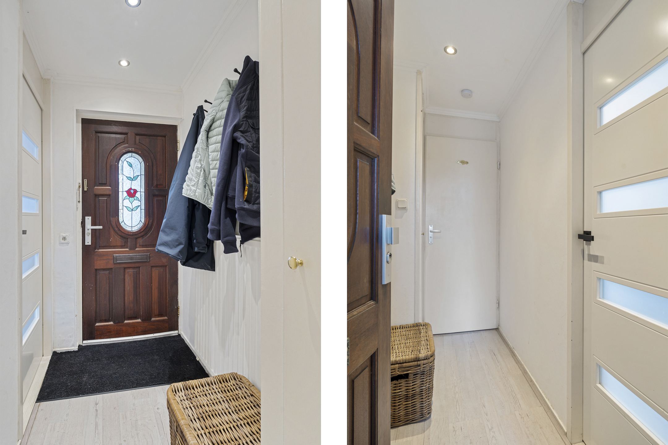 Bij binnenkomst stap je in een nette hal met voldoende ruimte voor de garderobe. Hier vind je ook de meterkast en het toilet. Vanuit de hal heb je toegang tot de woonkamer.