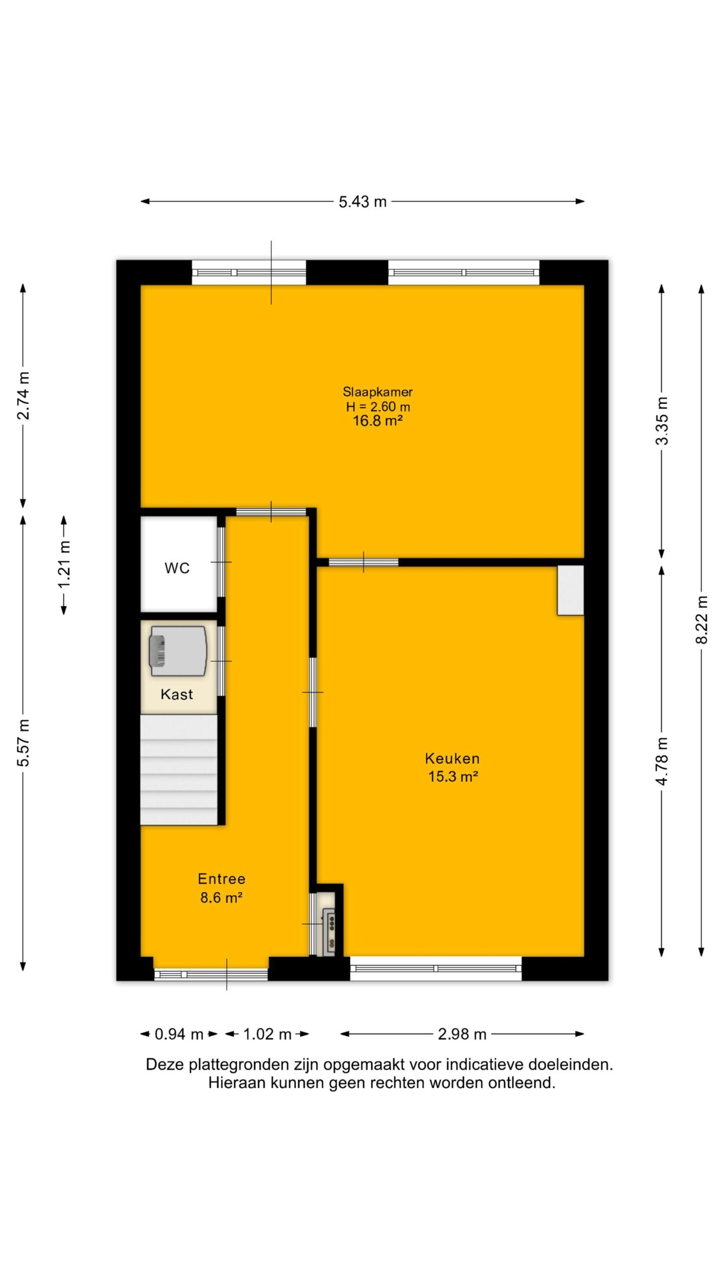 Via de entree kom je in de hal met toilet, meterkast en trapopgang. Aan de voorzijde bevindt zich de ruime keuken (ca. 15 m²), opgesteld in een praktische L-vorm en voorzien van diverse inbouwapparatuur. Aan de achterzijde ligt een royale slaapkamer met directe toegang tot de tuin.