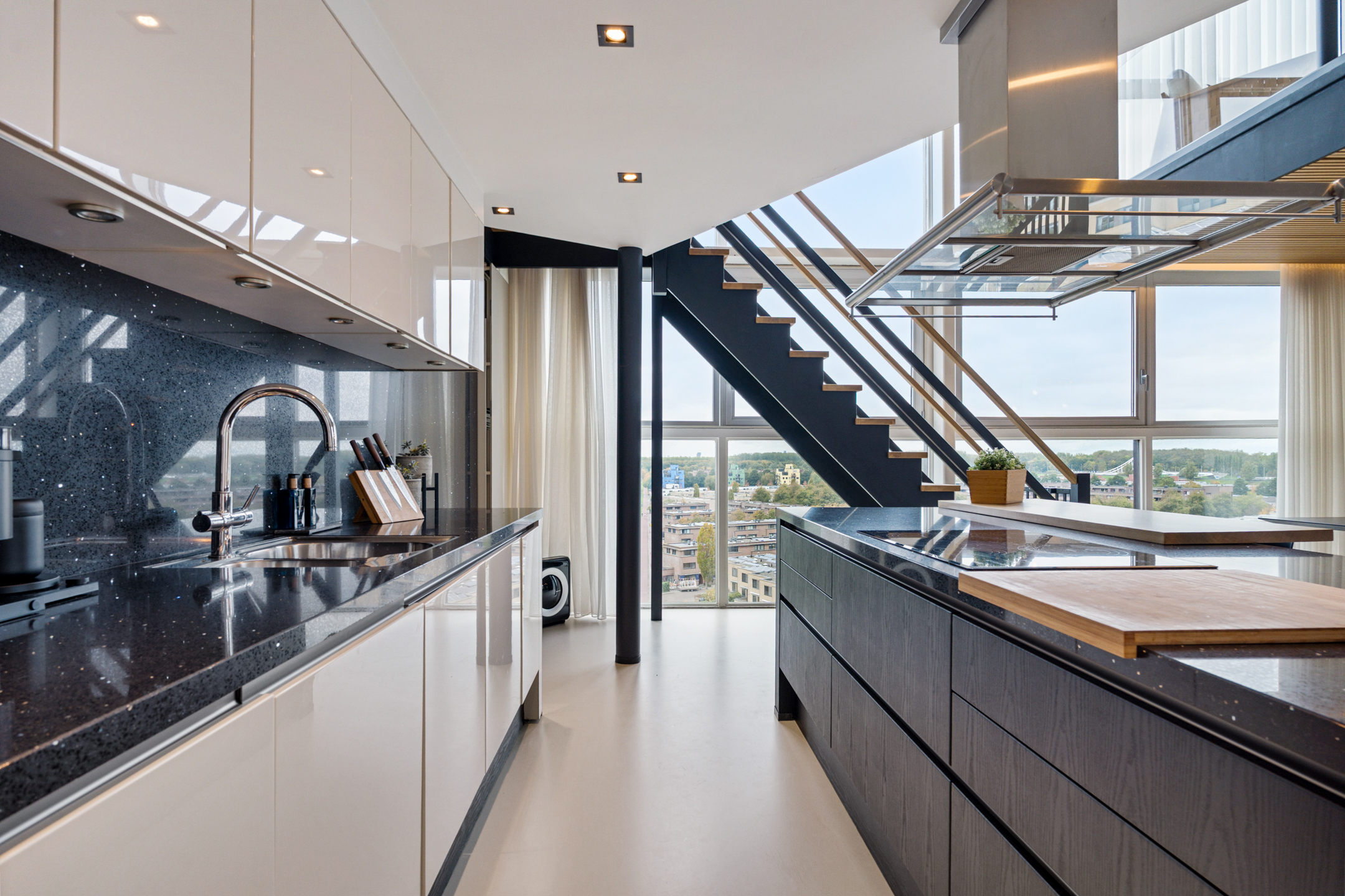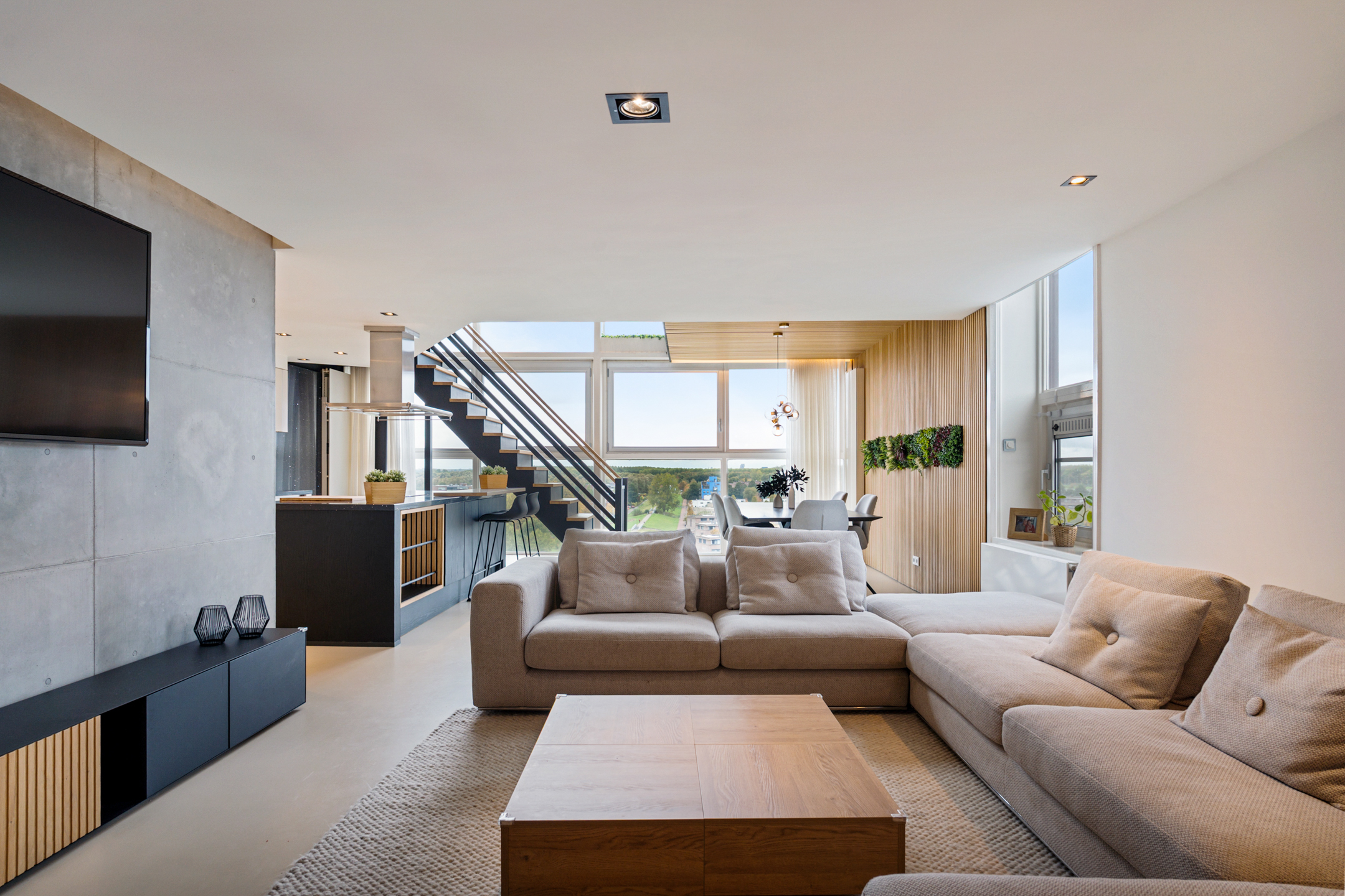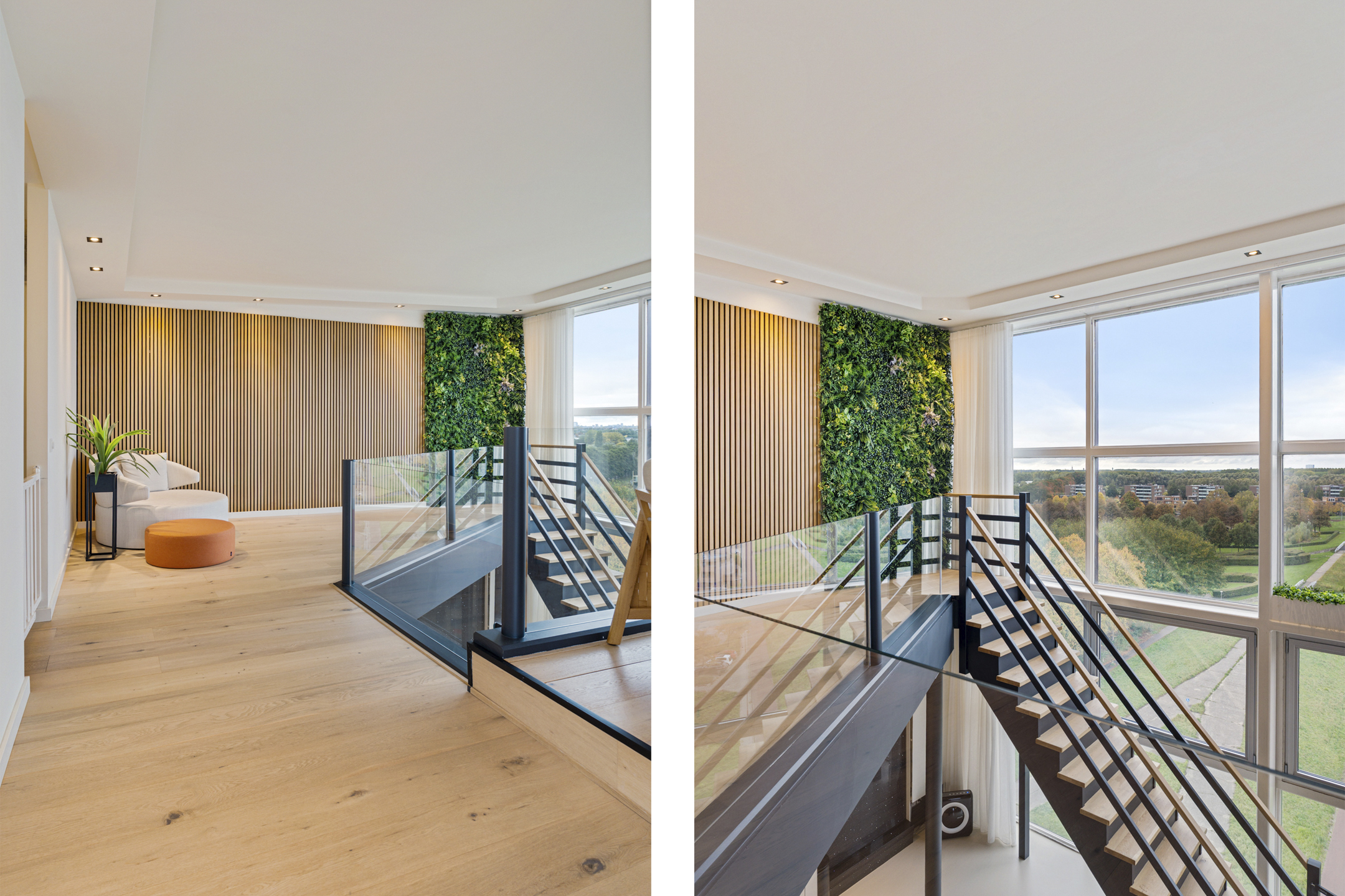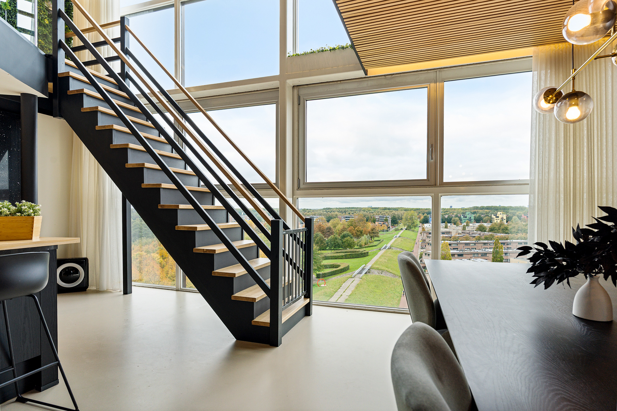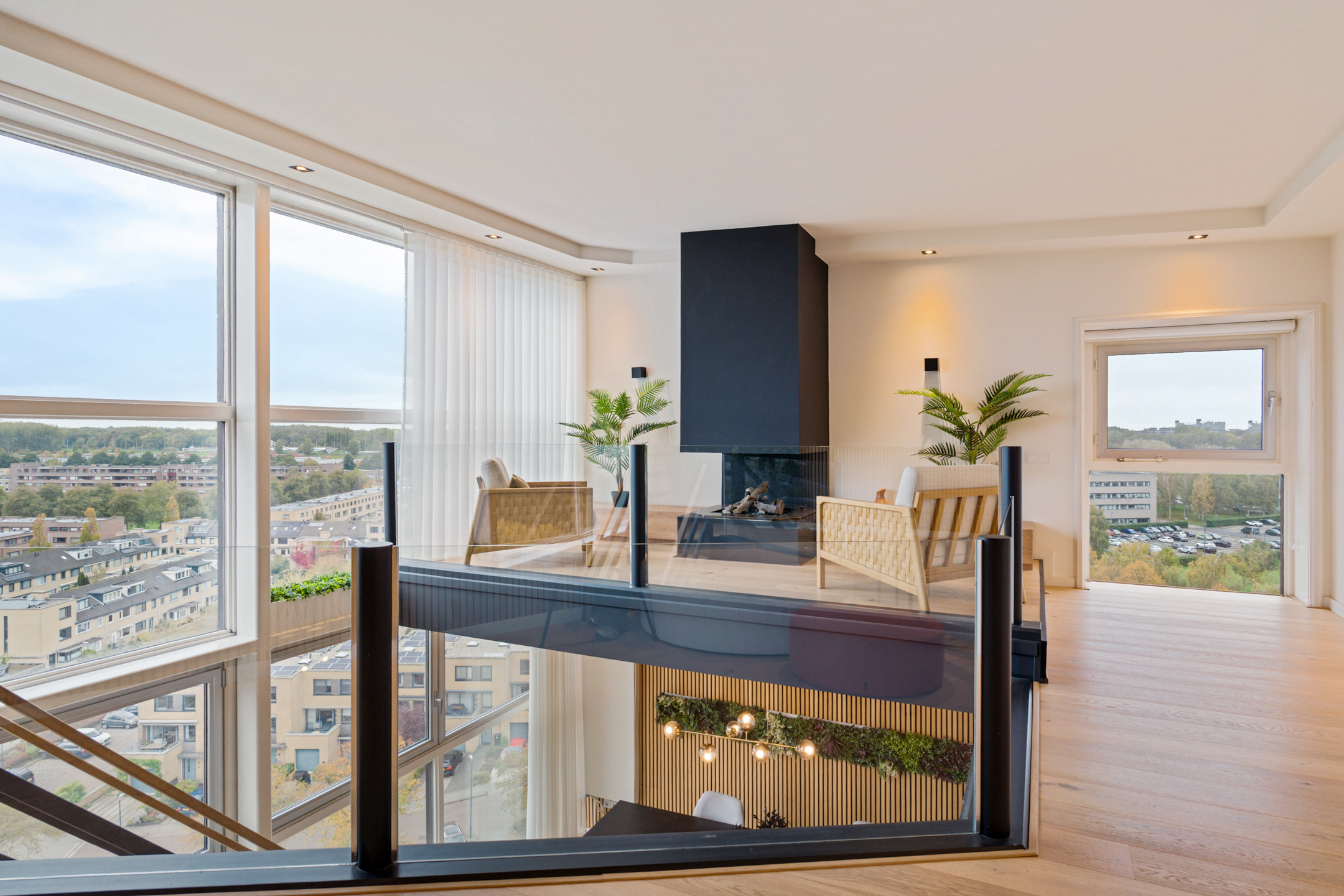 Wonen op hoog niveau krijgt hier een nieuwe betekenis. Dit uitzonderlijk royale en stijlvol afgewerkte dubbele penthouse van circa 217 m² strekt zich uit over de 10e en 11e verdieping. Elk element klopt hier – van de houten wandpanelen en zwarte details tot de manier waarop het licht binnenvalt. En dat uitzicht… dat verveelt nooit. Vanaf elke hoek kijk je uit over Den Haag, Scheveningen en Rotterdam. Met een adembenemende woonkamer met vide, een elegante keuken met kookeiland, twee luxe badkamers, een eigen wellness en een zonnig dakterras is dit een woning die pure klasse uitstraalt.