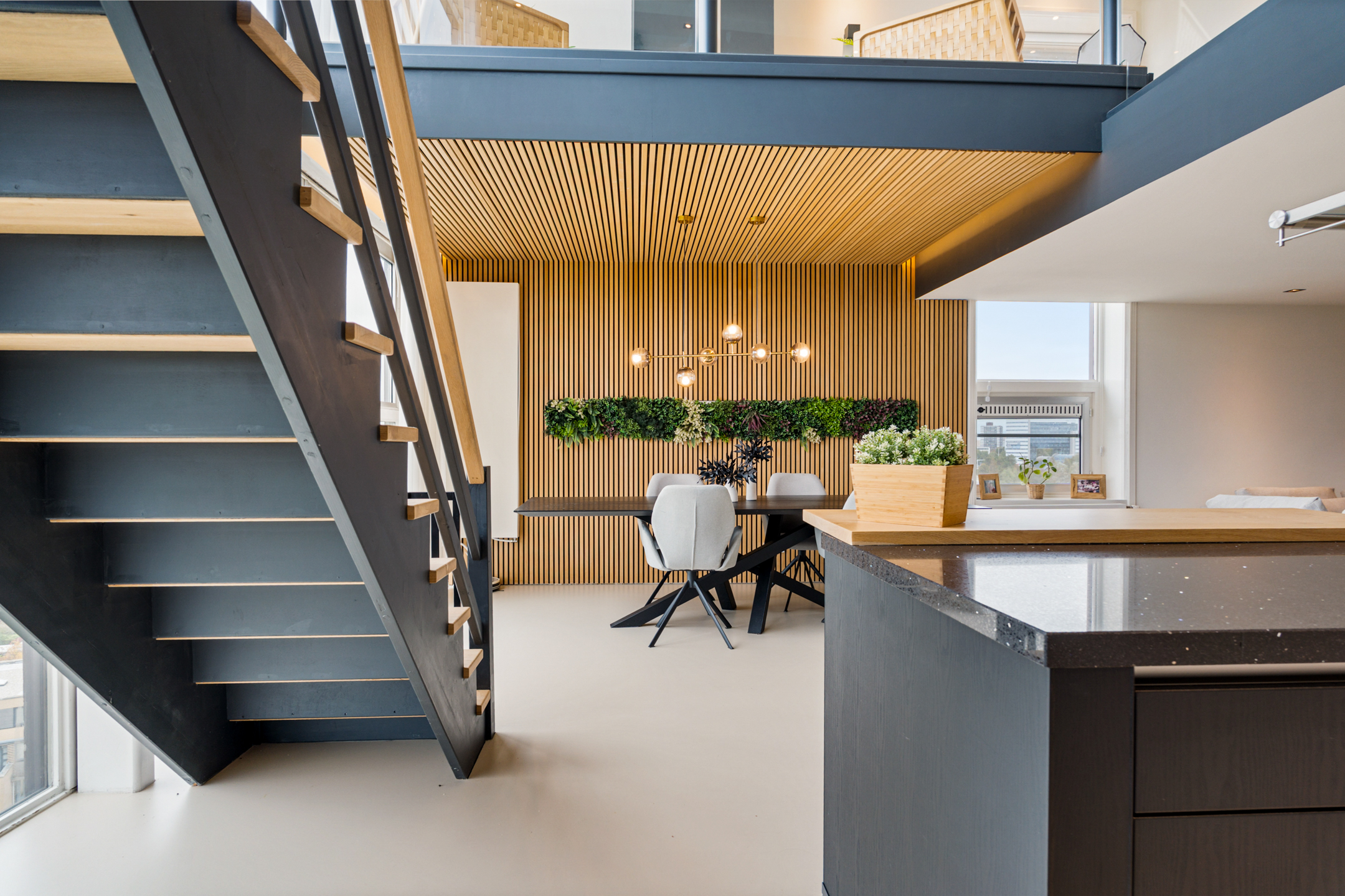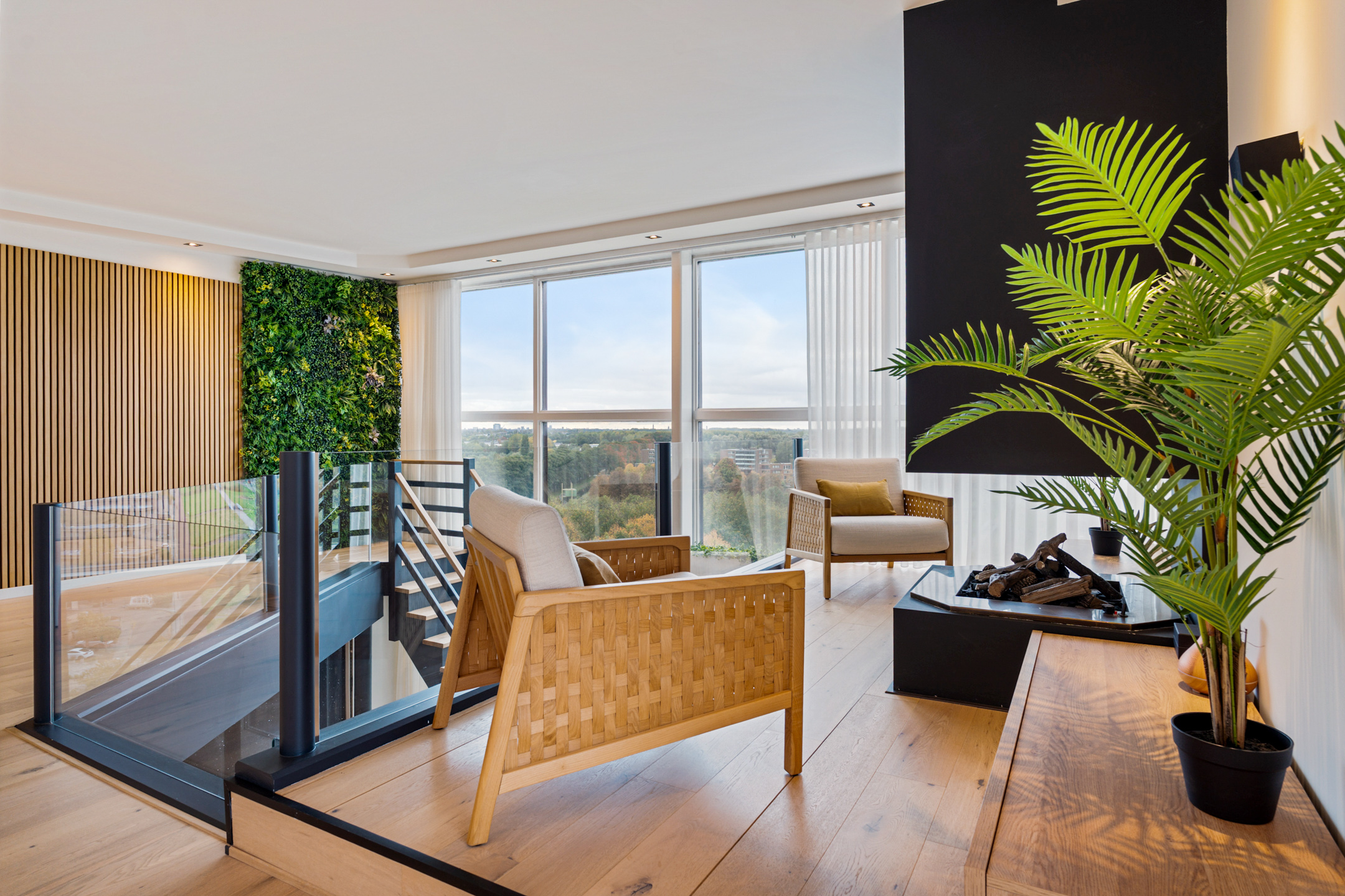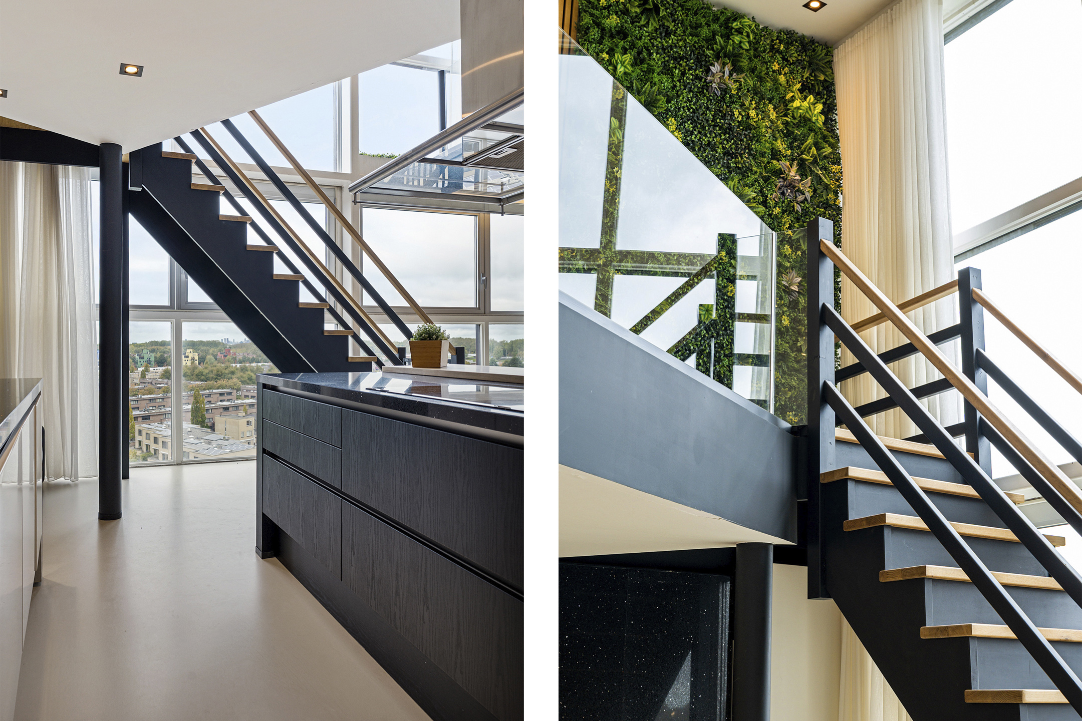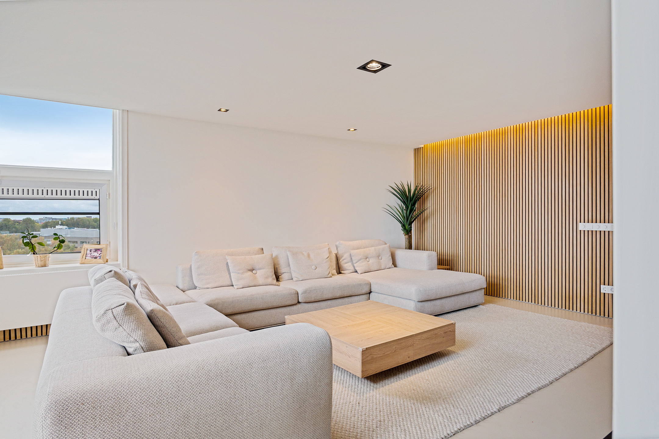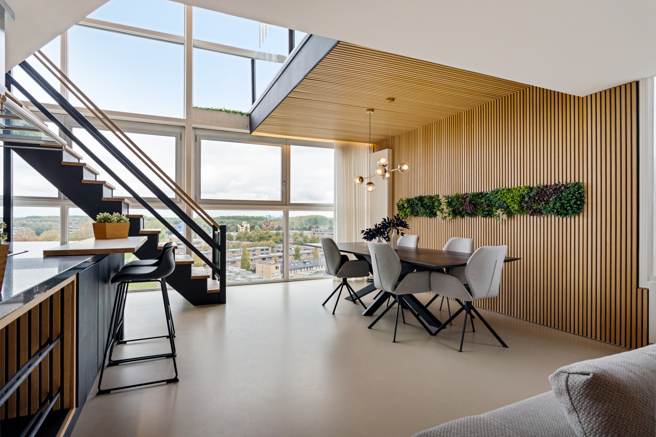 Wonen op hoog niveau krijgt hier een nieuwe betekenis. Dit uitzonderlijk royale en stijlvol afgewerkte dubbele penthouse van circa 217 m² strekt zich uit over de 10e en 11e verdieping. Elk element klopt hier – van de houten wandpanelen en zwarte details tot de manier waarop het licht binnenvalt. En dat uitzicht… dat verveelt nooit. Vanaf elke hoek kijk je uit over Den Haag, Scheveningen en Rotterdam. Met een adembenemende woonkamer met vide, een elegante keuken met kookeiland, twee luxe badkamers, een eigen wellness en een zonnig dakterras is dit een woning die pure klasse uitstraalt.