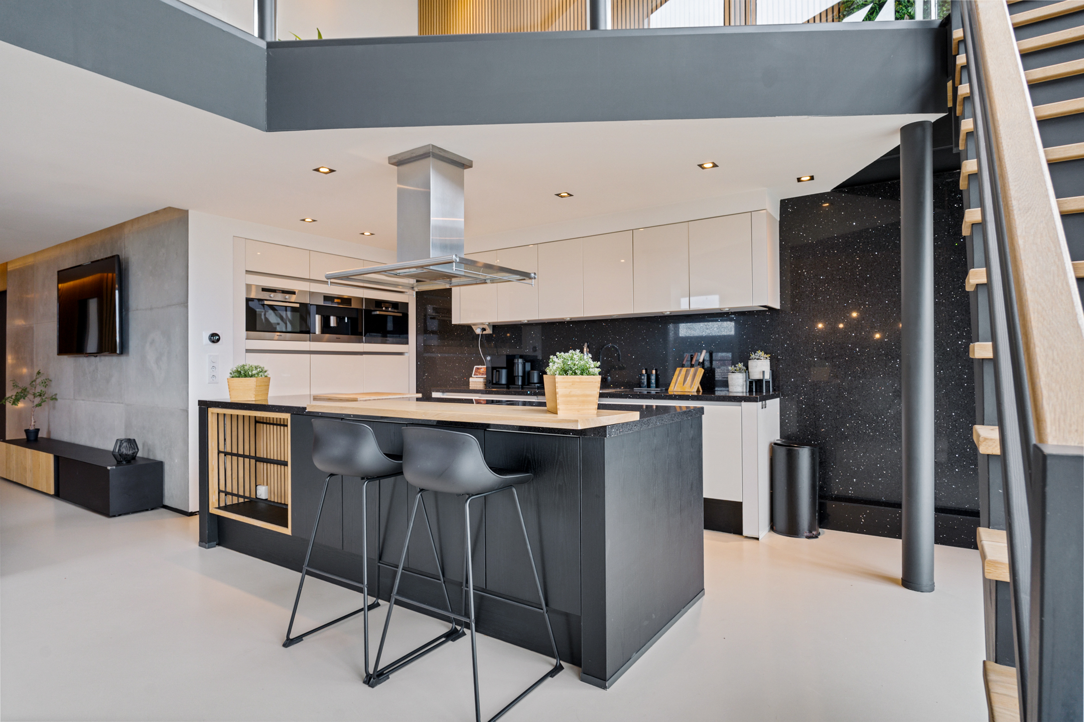 Daarna opent de woning zich in volle glorie. De leefruimte strekt zich voor je uit met een plafondhoge glazen pui die het uitzicht tot leven brengt. De keuken is hier het hart van het huis – een modern statement met een groot kookeiland, granieten werkblad en hoogwaardige inbouwapparatuur. De subtiele herhaling van de houten wandpanelen in het kookeiland creëert een prachtig geheel.