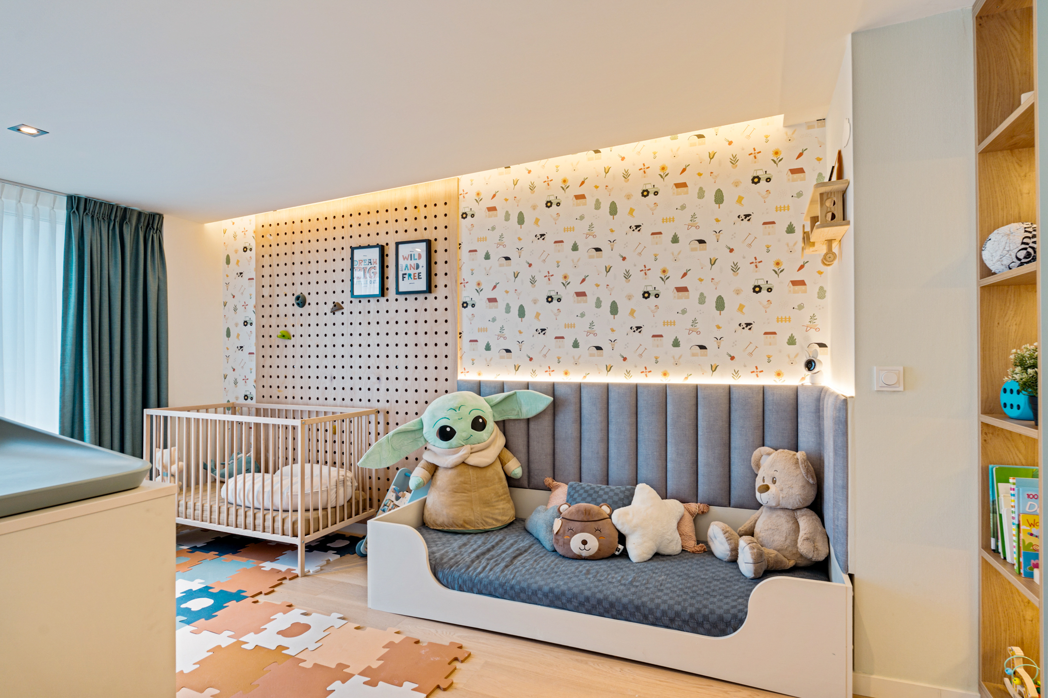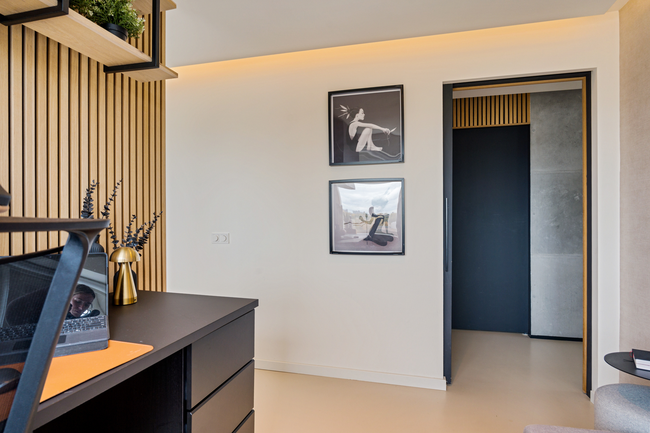 Daarnaast bevindt zich hier een royale kamer van circa 15 m² die momenteel als werkruimte is ingericht, maar eenvoudig kan worden omgevormd tot slaapkamer. Elk detail is hier doordacht; van de verlichting tot de materiaalkeuze.