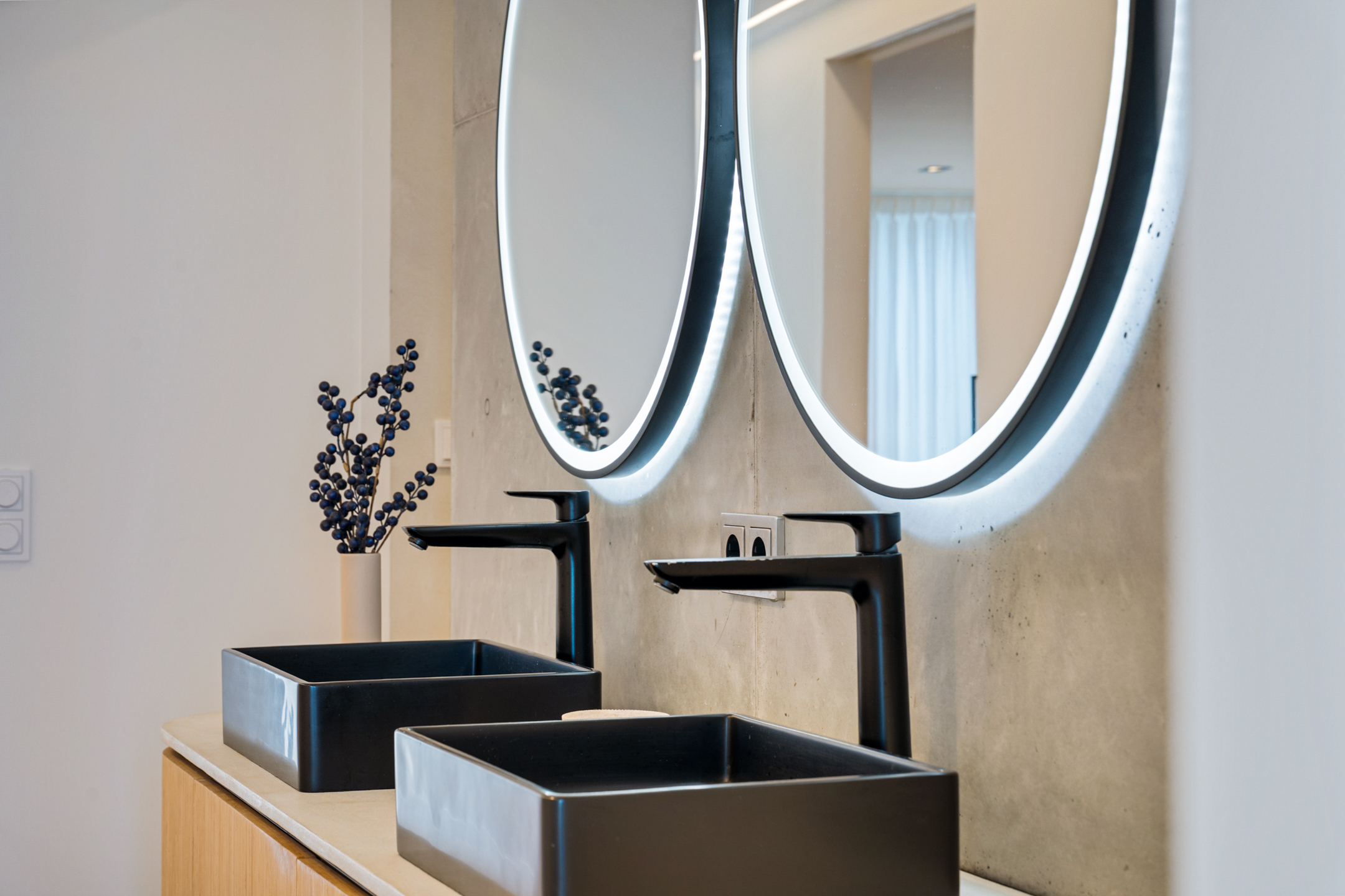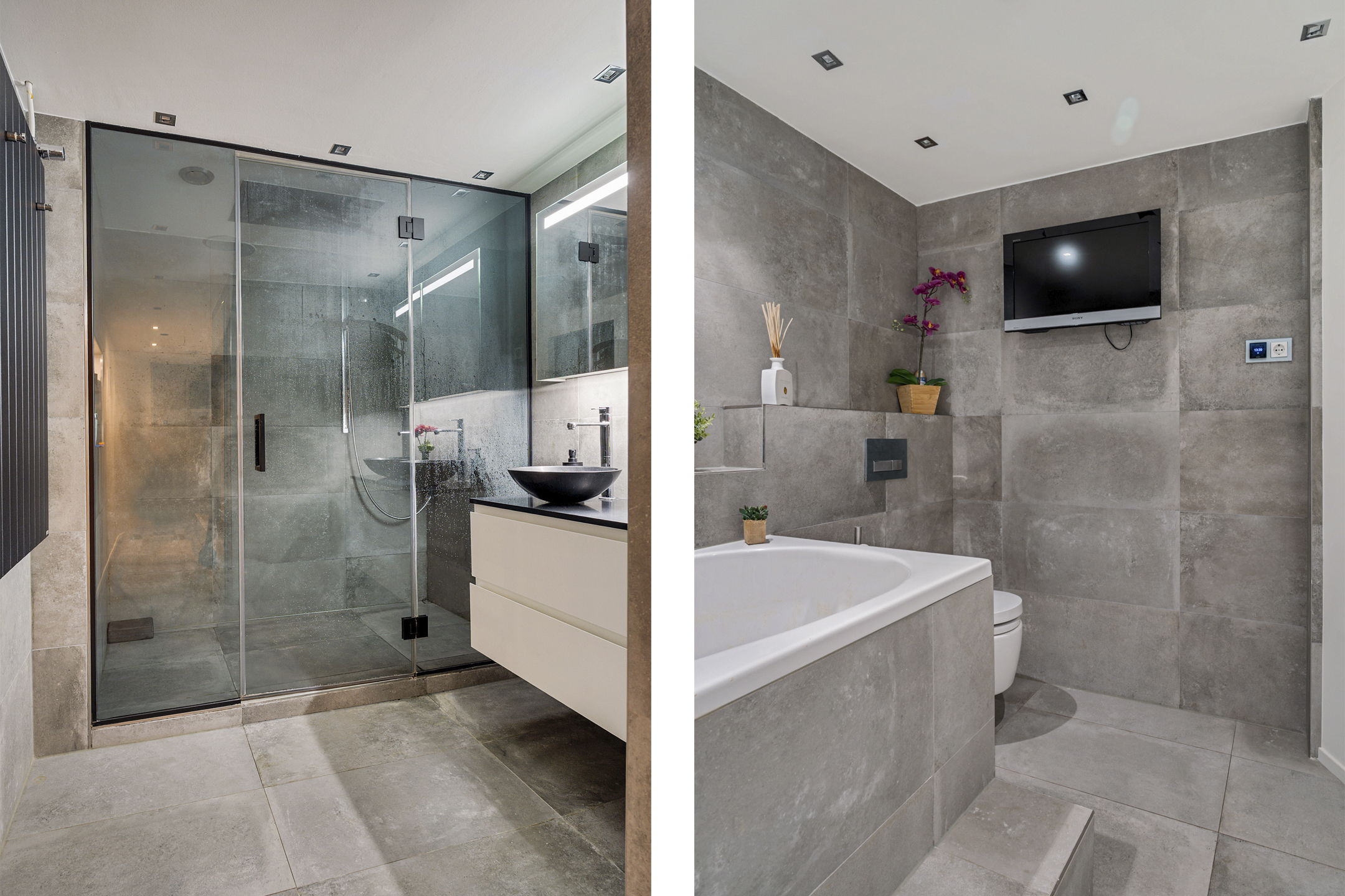 De tweede badkamer straalt dezelfde luxe uit als de rest van de woning. De dubbele inloopdouche met twee regendouches is afgewerkt met hoogwaardige materialen. Tussen badkamer en separaat toilet bevindt zich een stijlvol wastafelmeubel met zwarte kranen – precies afgestemd op het interieur. Ook bevindt zich hier nog een derde slaapkamer.