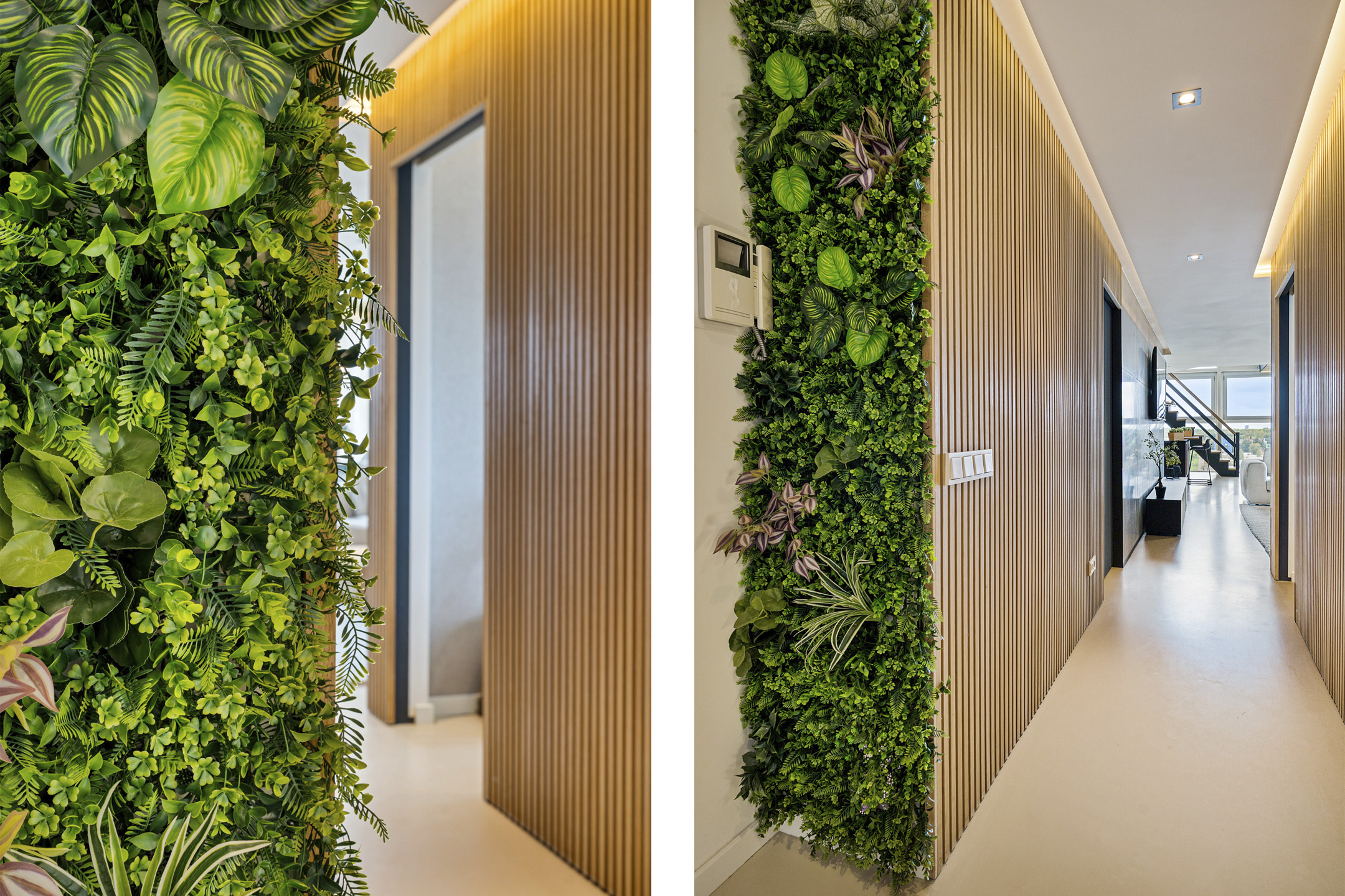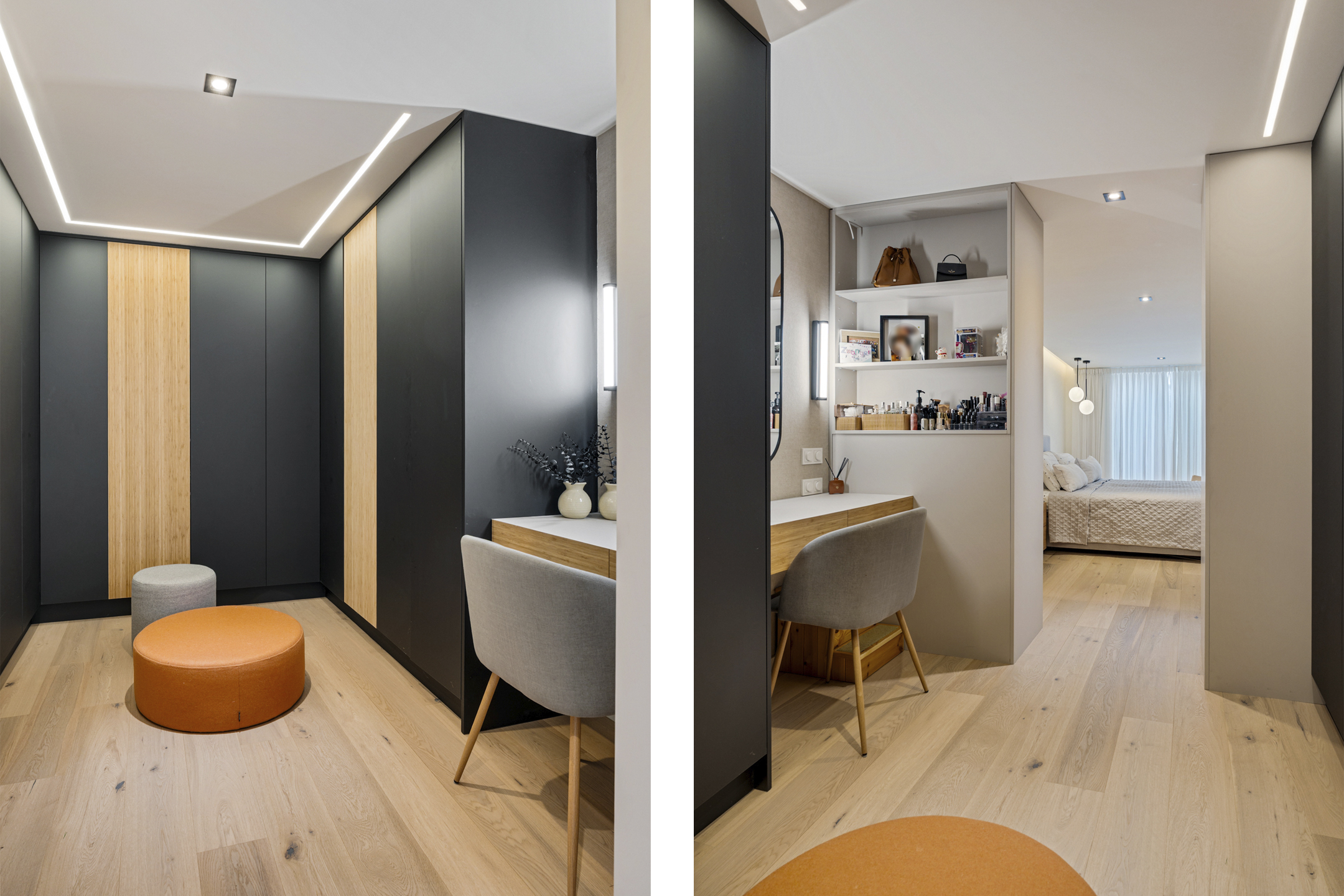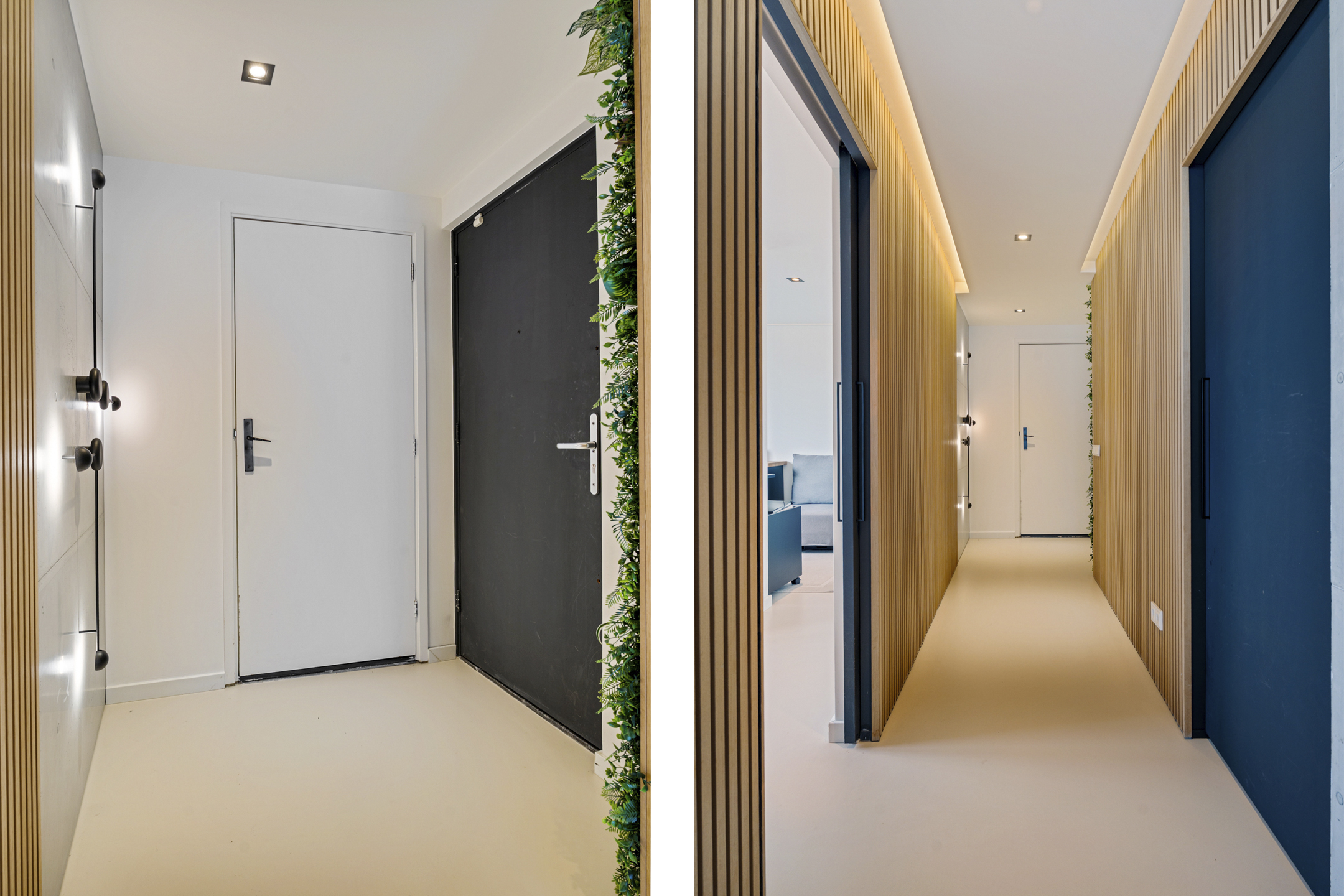 De lift opent direct op de overloop van dit indrukwekkende appartement. De entree is ruim en strak afgewerkt en biedt toegang tot een luxe badkamer met stoomcabine/sauna, whirlpool, dubbele wastafel en toilet – een complete wellnessruimte in huis.