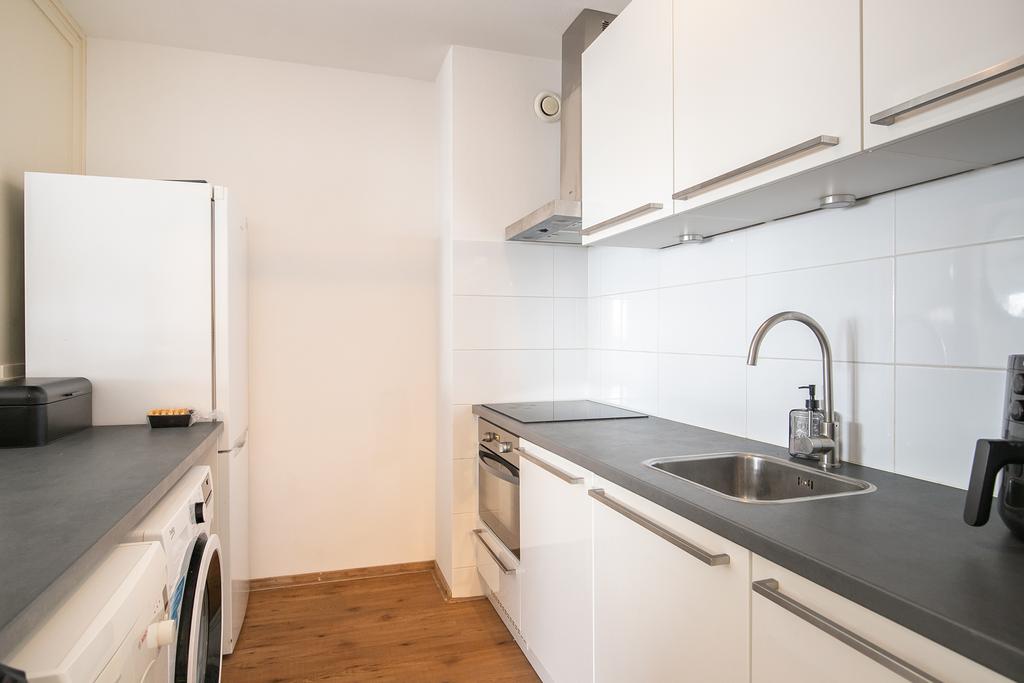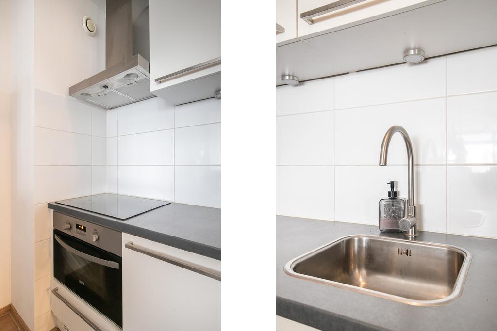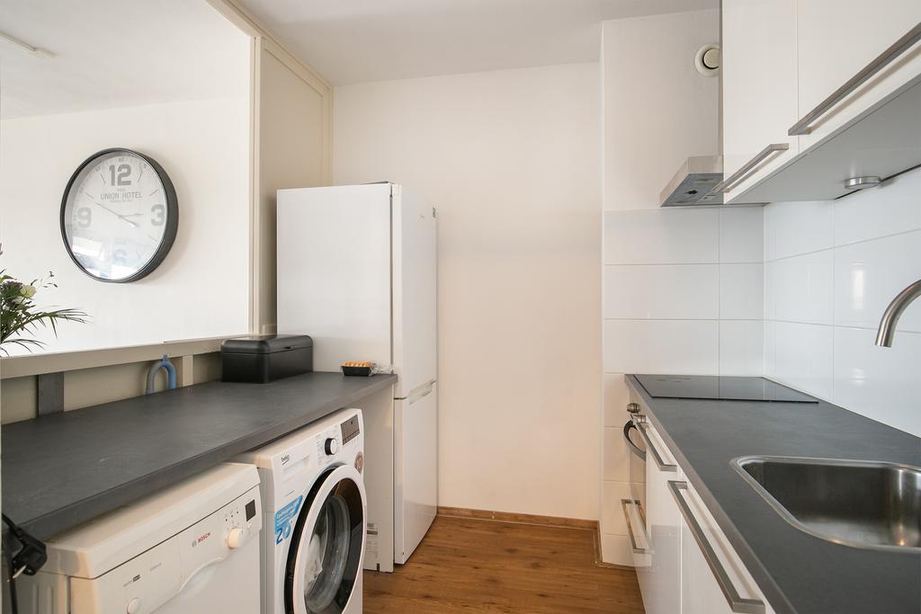Vanuit het woongedeelte is er een doorkijk naar de keuken, hier bevindt zich tevens ook de wasmachineaansluiting. De keuken is in 2016 vernieuwd.