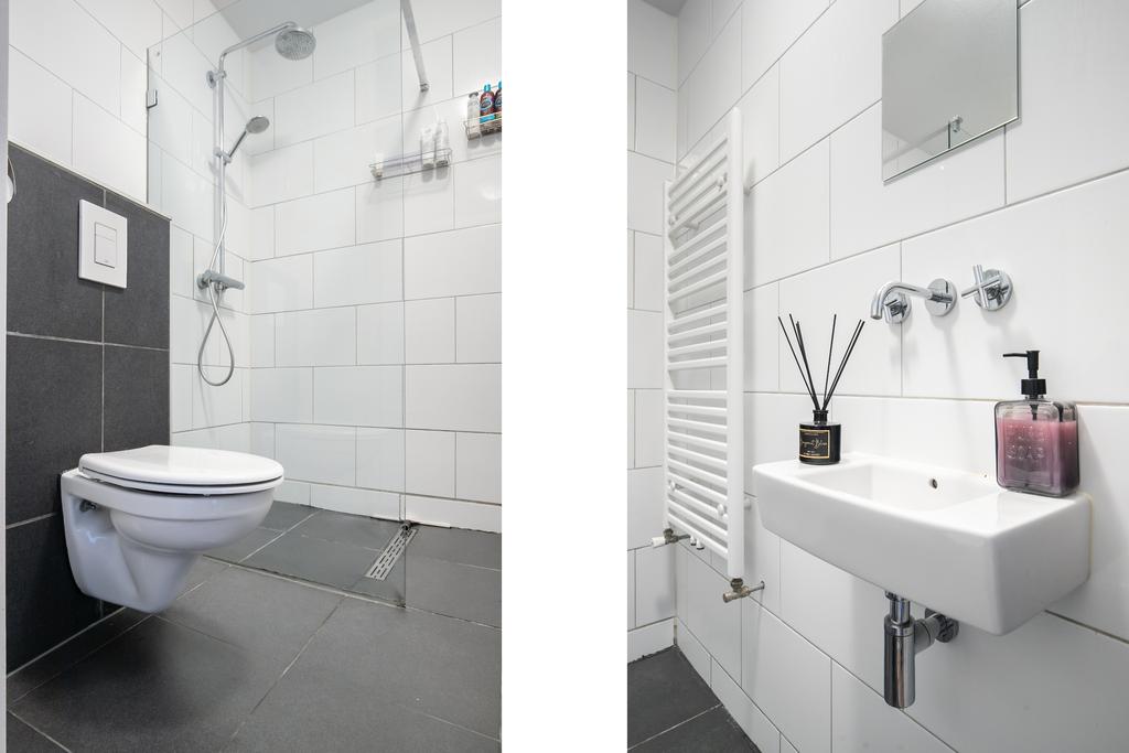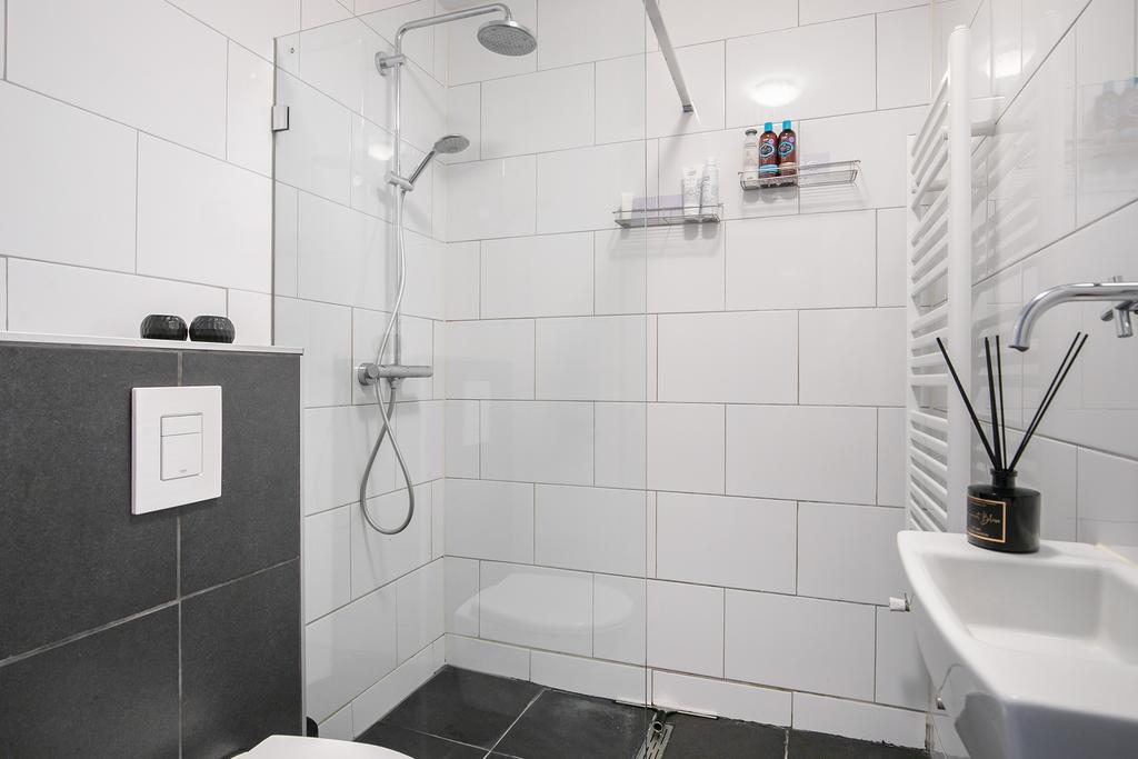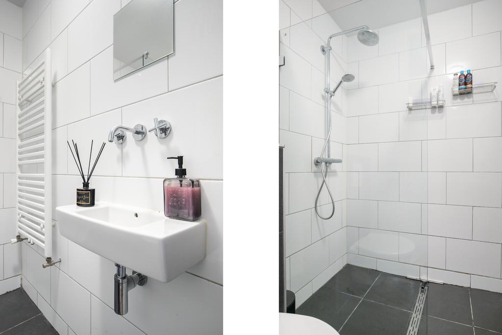 De badkamer heeft een toilet, regendouche met drain en een wastafel met spiegel. Naast de badkamer is er een knusse slaapkamer met inpandige kastruimte.