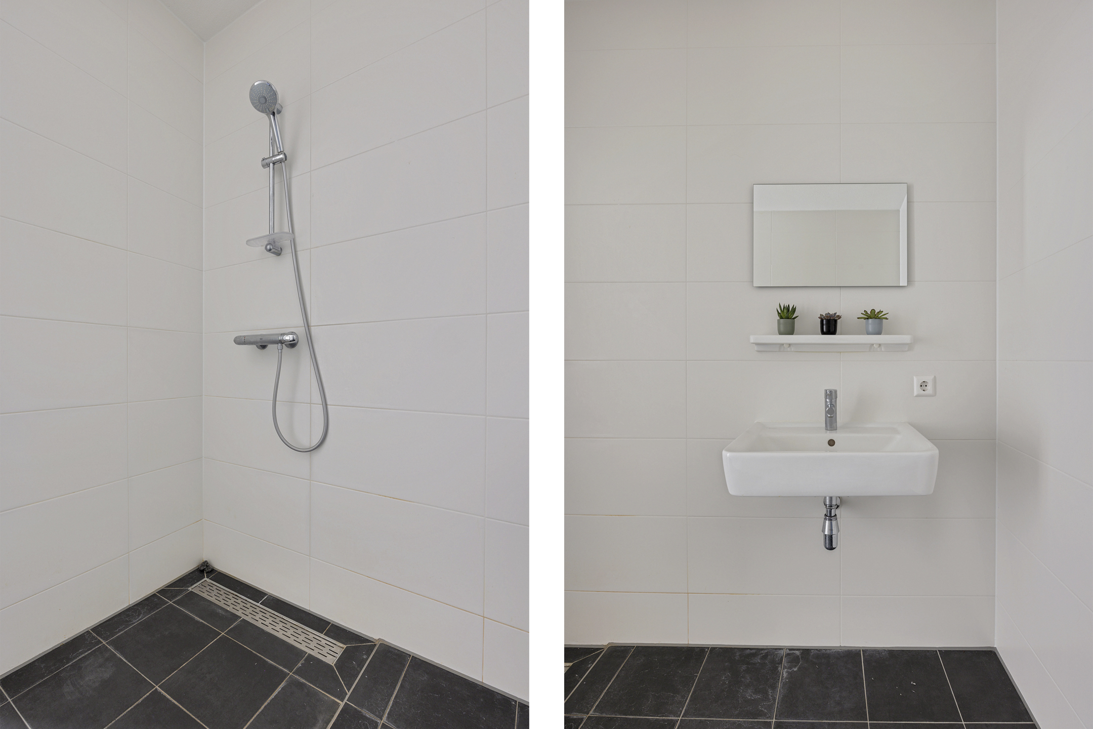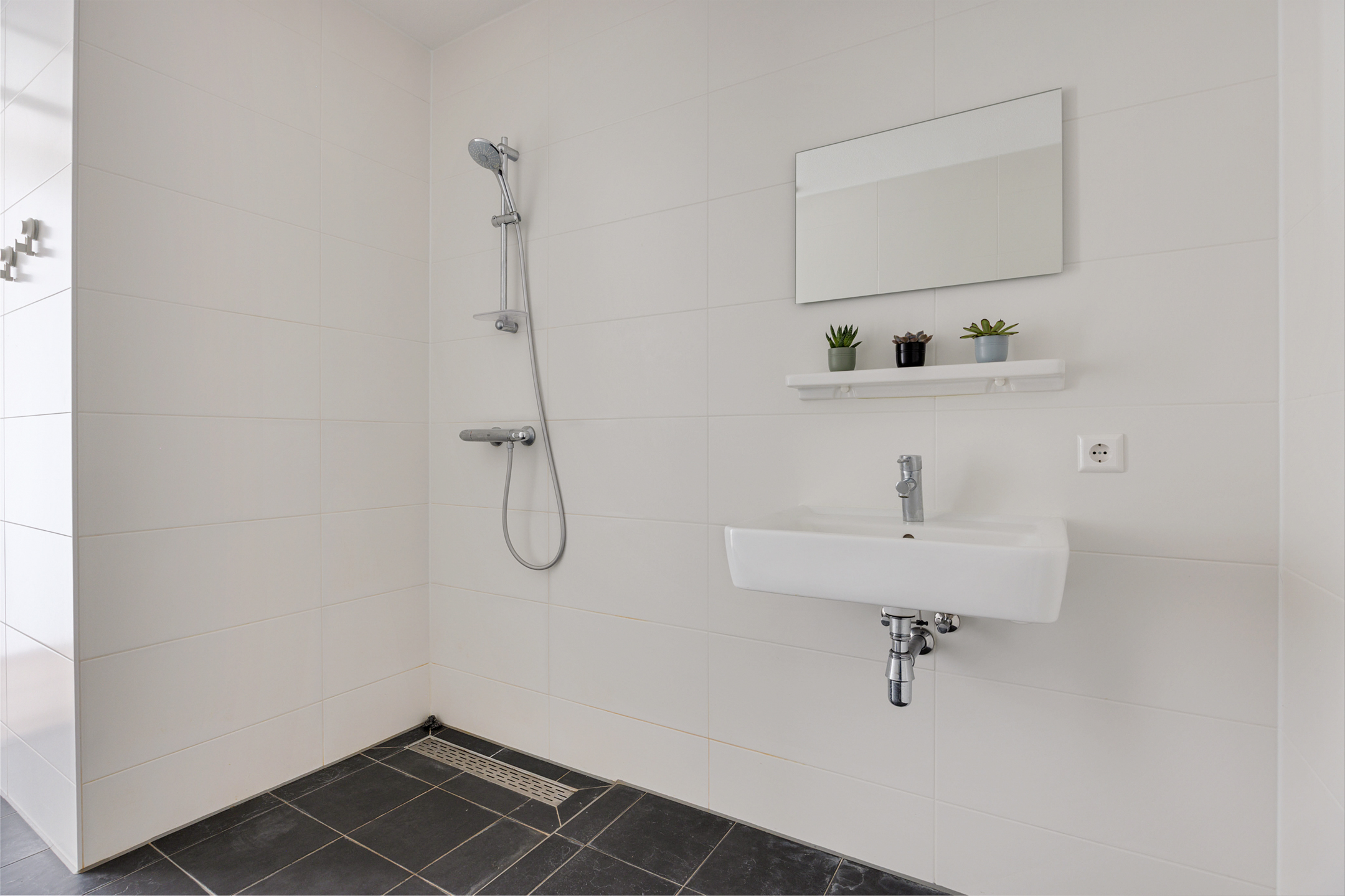 De slaapkamer is ruim opgezet en biedt genoeg plaats voor een groot bed en kastruimte. De moderne badkamer is volledig betegeld en voorzien van een ruime inloopdouche, een wastafel met meubel en spiegel. Daarnaast is er een separaat toilet aanwezig – prettig voor jou en je gasten.