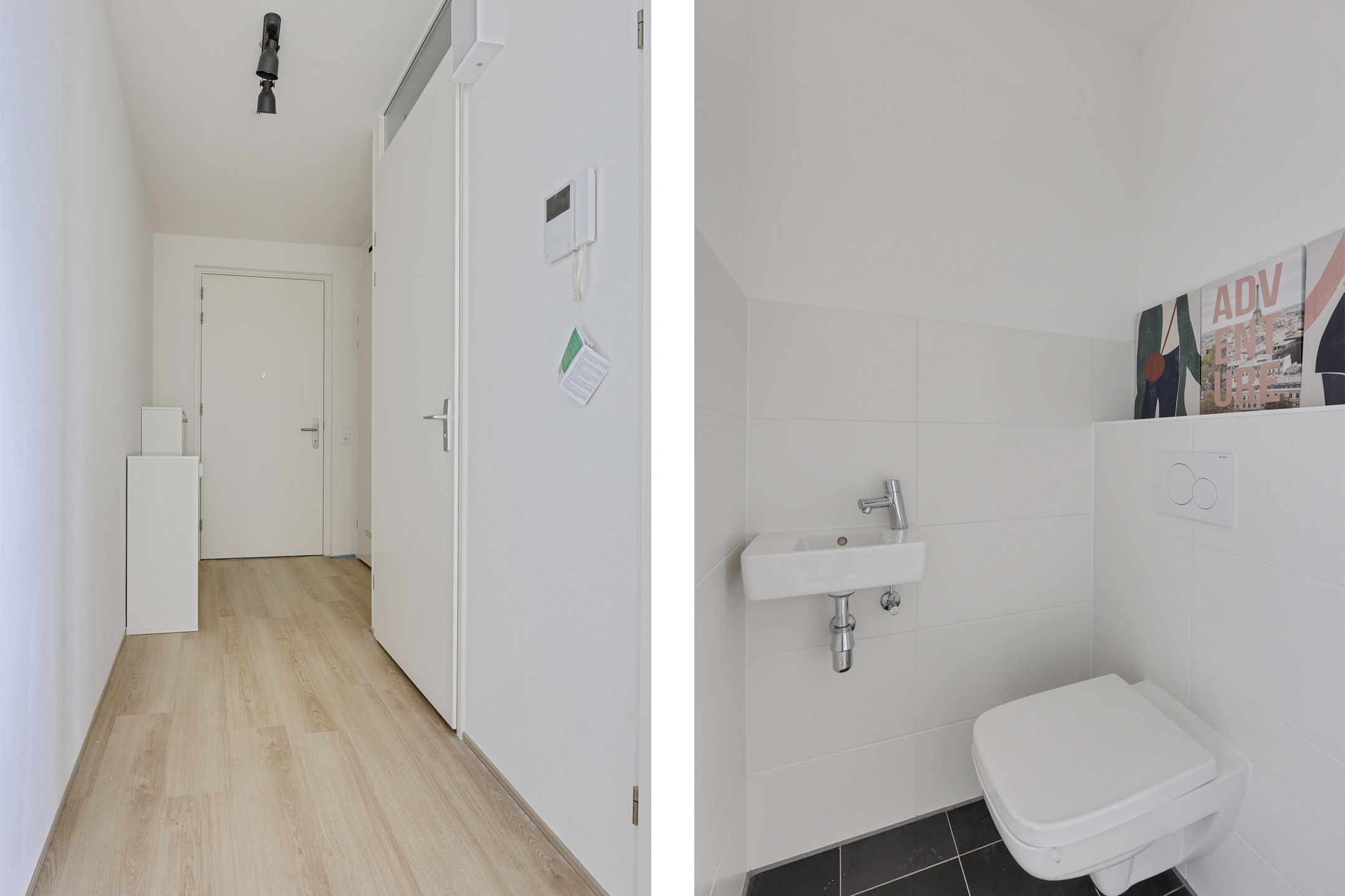 Bij binnenkomst word je verwelkomd in een verzorgde entree met ruimte voor de garderobe. De woonkamer is verrassend ruim en voorzien van grote raampartijen, waardoor het uitzicht over de stad je direct tegemoet komt.