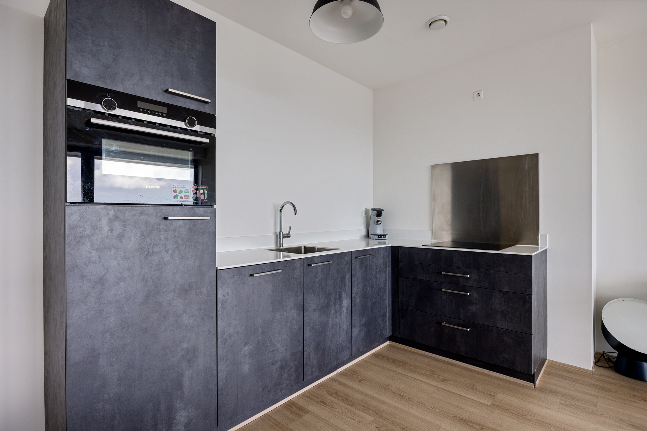 De open keuken is van alle gemakken voorzien: inbouwapparatuur, veel werkruimte en een moderne uitstraling. Een fijne plek om te koken én te genieten.