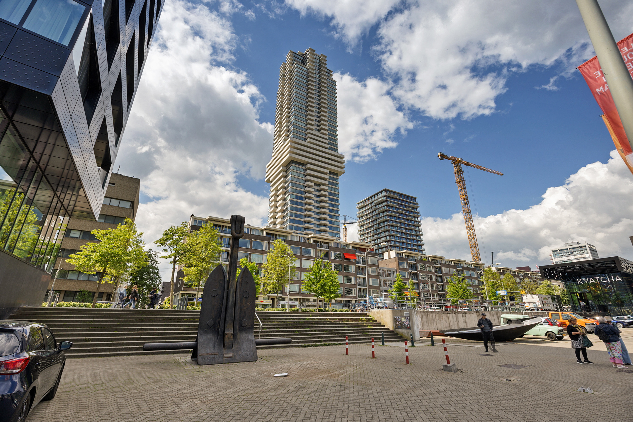 Deze markante witte woontoren van 154 meter hoog is een van de hoogste woongebouwen van Rotterdam. Gelegen tussen de Witte de Withstraat, de Schiedamsedijk en het Vasteland woon je hier op een toplocatie. Alles ligt op loopafstand: gezellige restaurants, de Markthal, de Binnenrotte, metrostation Leuvehaven, musea, de Coolsingel en het bruisende culturele leven van de stad. Een iconische plek om te wonen stijlvol, levendig en centraal.