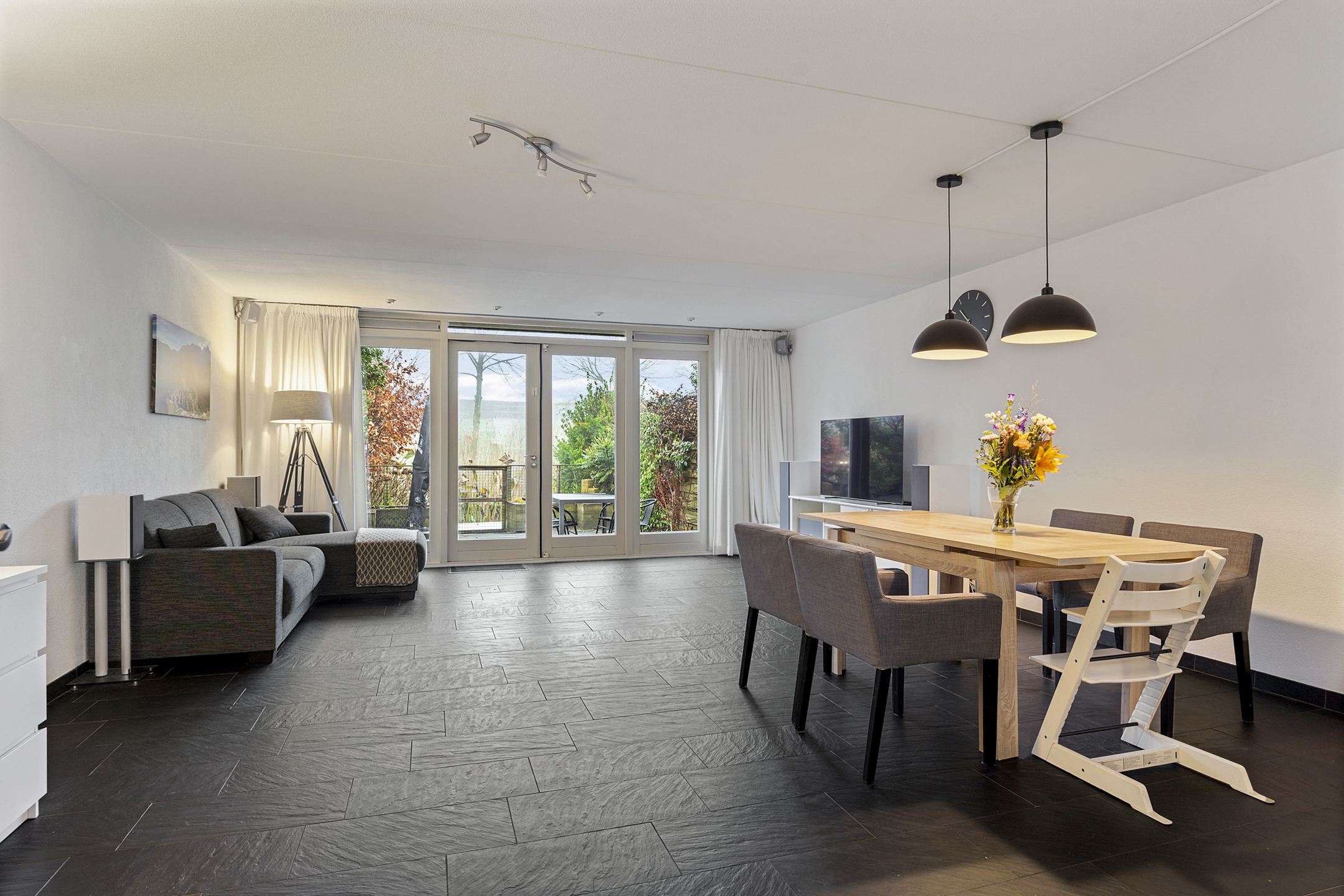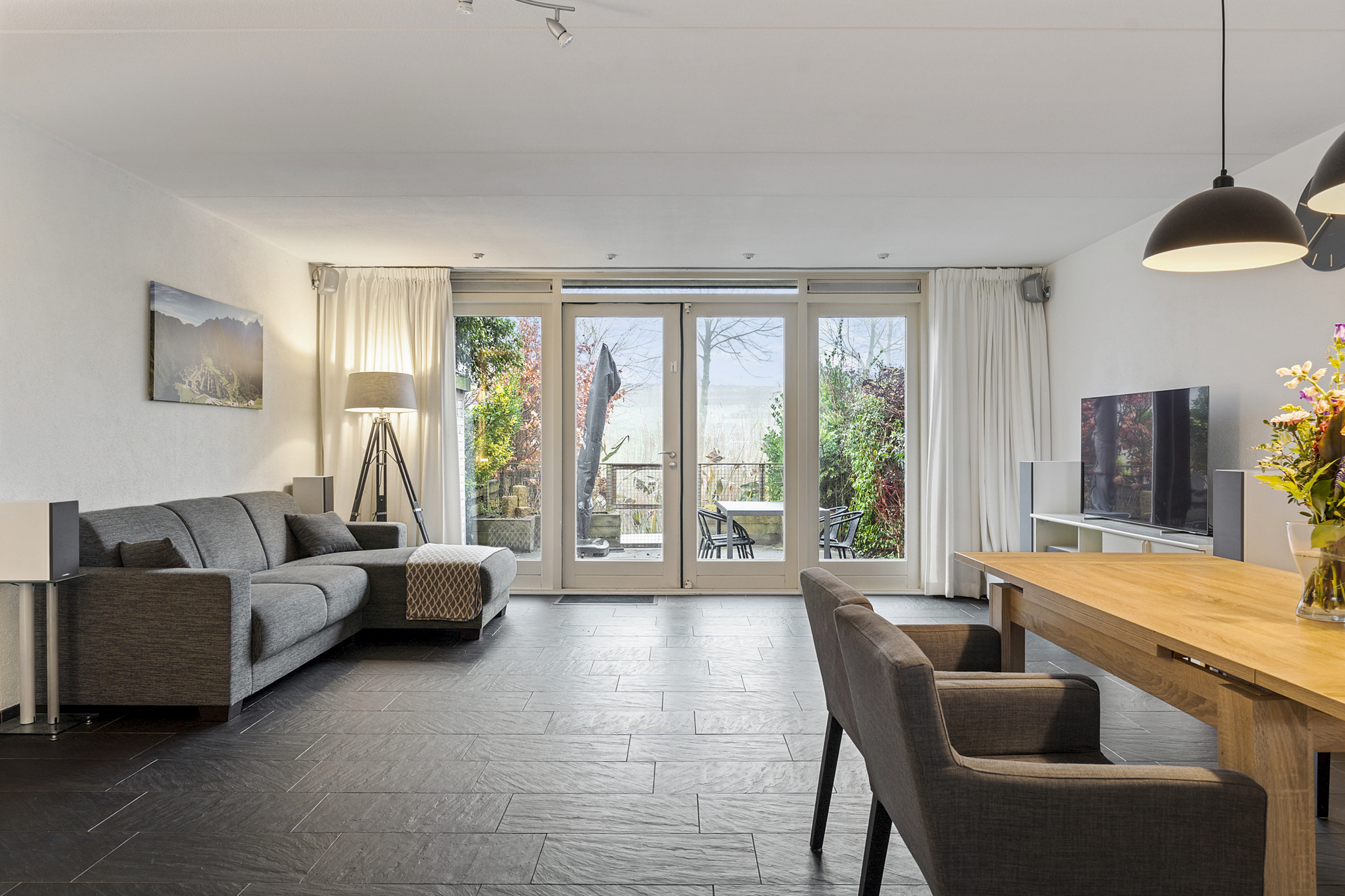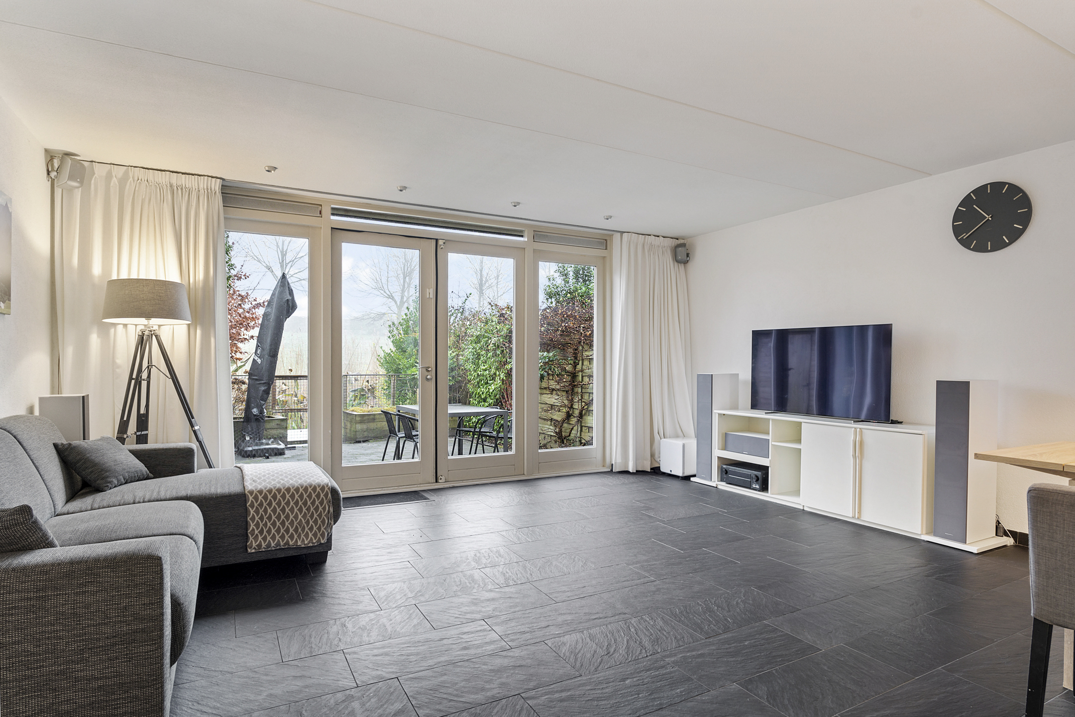 De tuingerichte woonkamer is met 2 meter uitgebouwd en biedt dankzij de royale hardhouten pui met veel glas en openslaande deuren een prettige verbinding met de tuin. Vanuit hier geniet je van vrij uitzicht op het water en het omliggende groen.