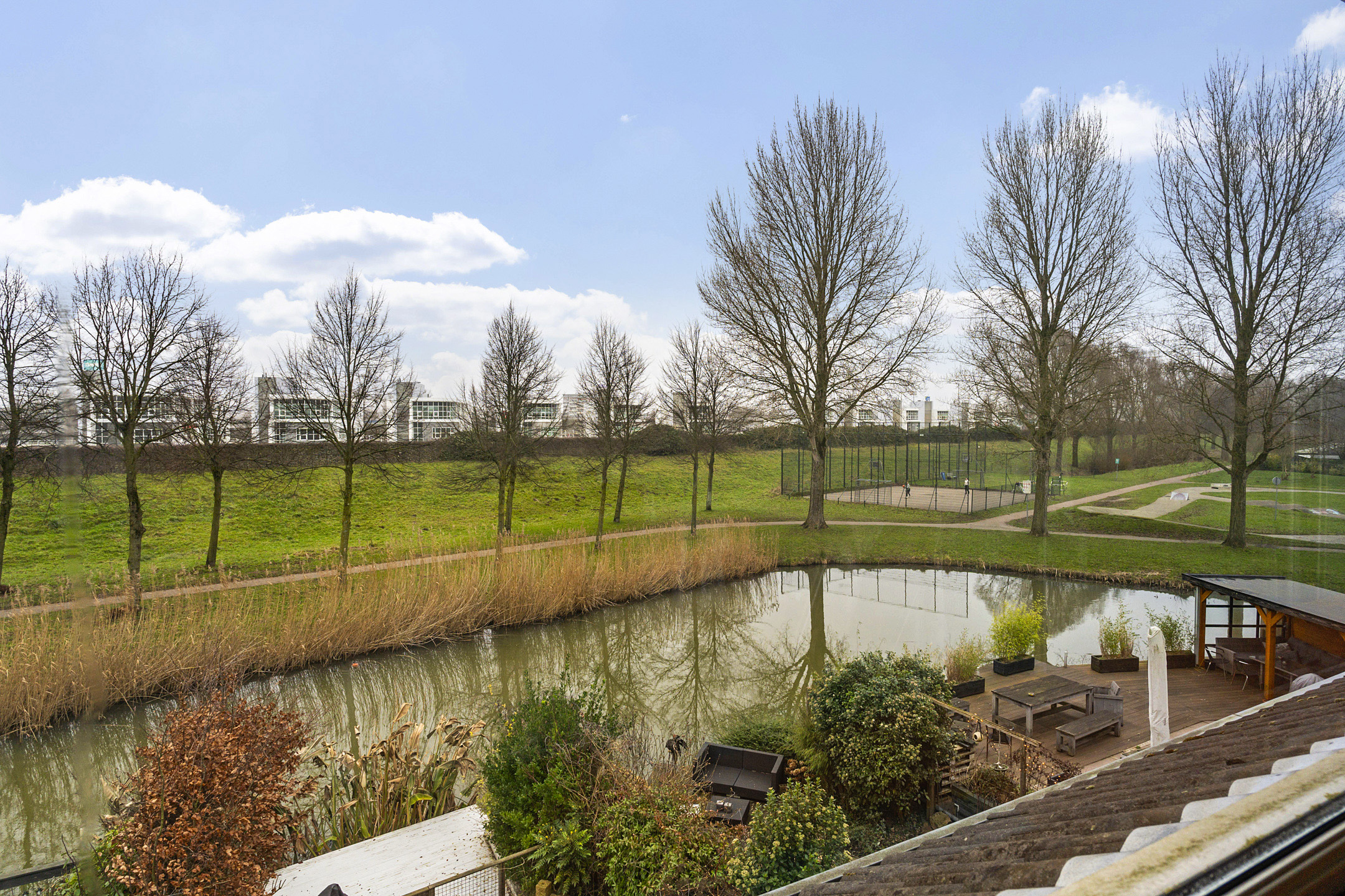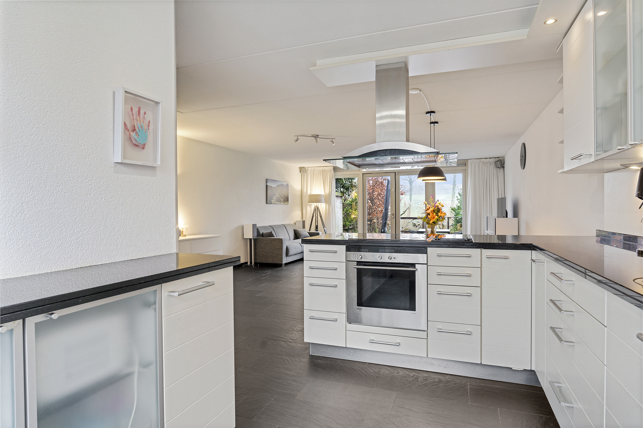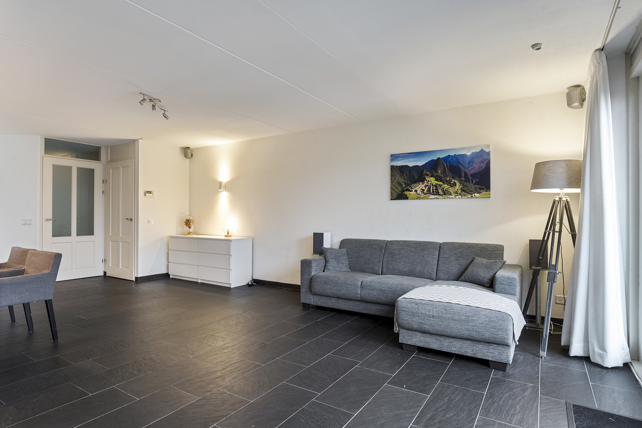 De tuingerichte woonkamer is met 2 meter uitgebouwd en biedt dankzij de royale hardhouten pui met veel glas en openslaande deuren een prettige verbinding met de tuin. Vanuit hier geniet je van vrij uitzicht op het water en het omliggende groen.