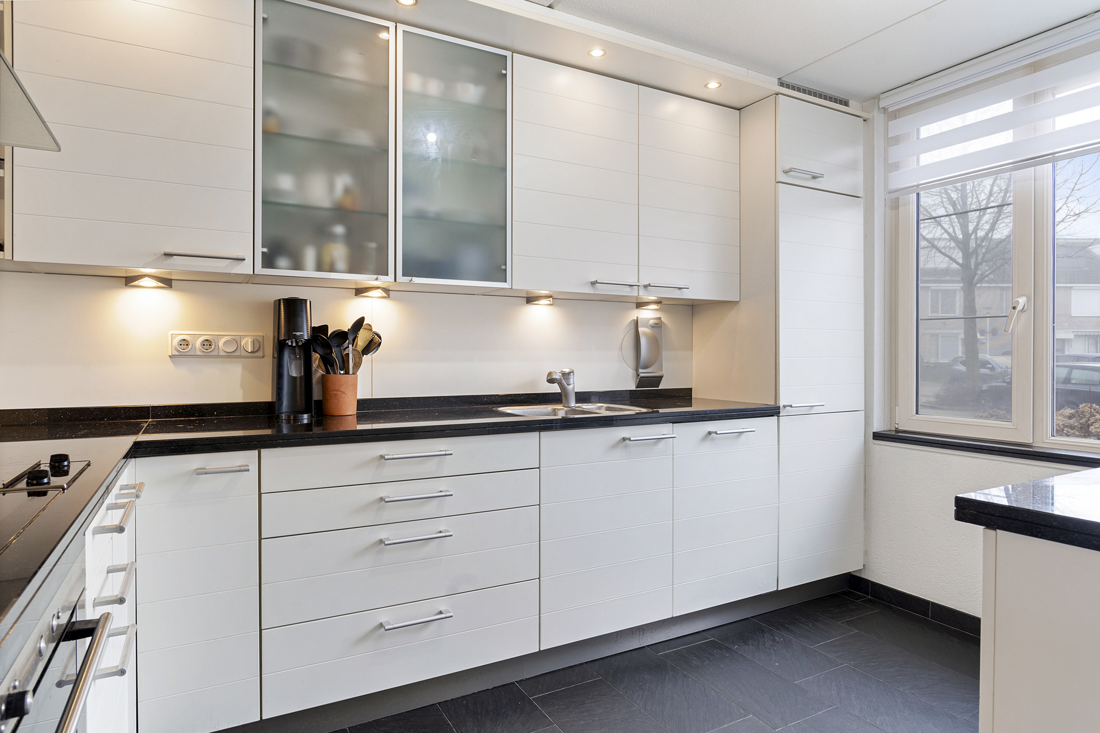 Aan de voorzijde bevindt zich de ruime, lichte keuken met een stijlvolle opstelling inclusief een schiereiland en volop kastruimte. De keuken is volledig uitgerust met een koel-/vriescombinatie, inductiekookplaat, RVS afzuigschouw, grillplaat en een combi-oven. De begane grond is afgewerkt met paneeldeuren, een handige trapkast en een stenen vloer met comfortabele vloerverwarming.