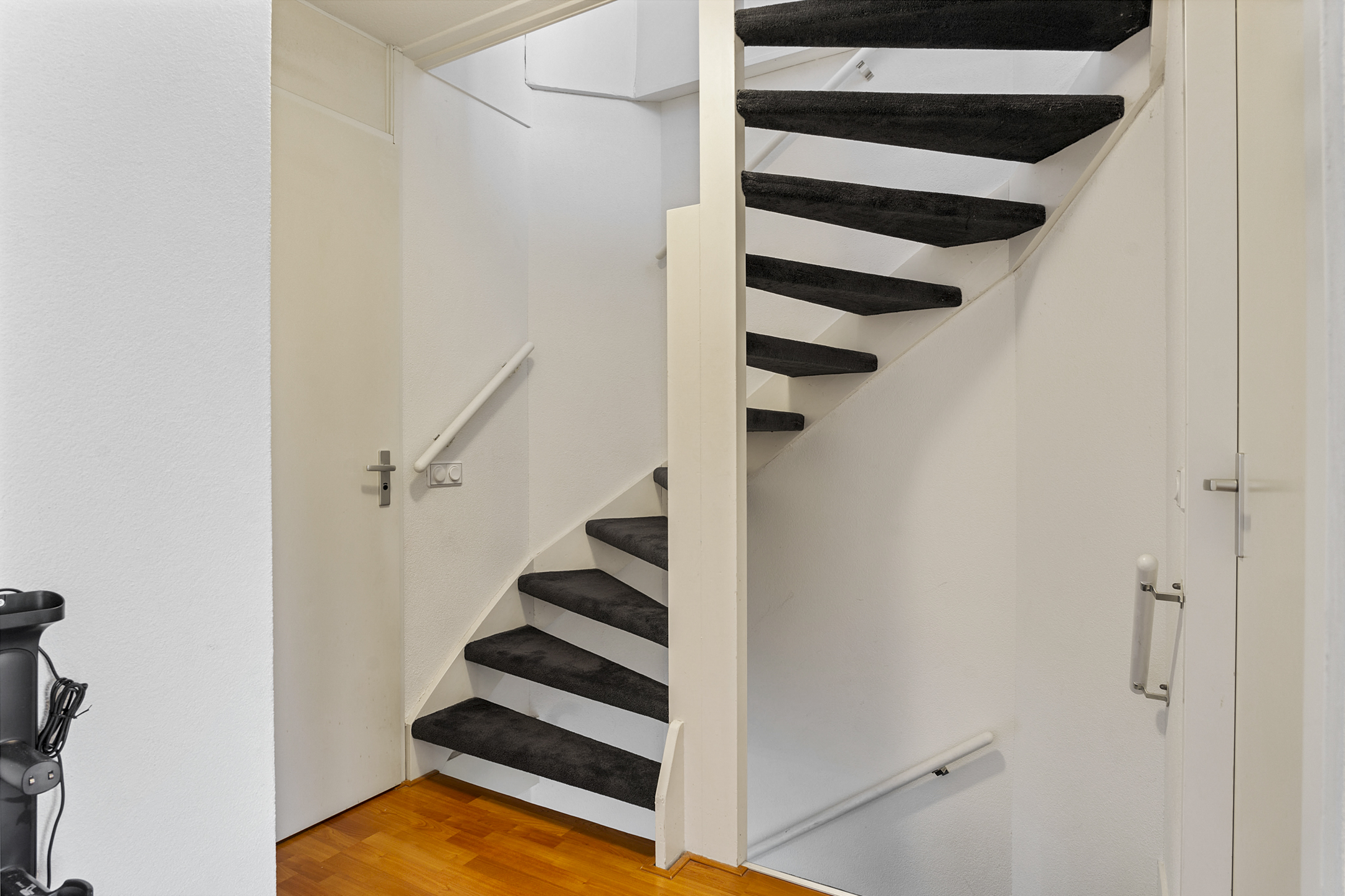 Aan de voorzijde van de woning beschik je over een eigen parkeerplaats en een praktische stenen berging van circa 7,4 m². Bij binnenkomst in de hal vind je de trapopgang, een uitgebreide meterkast met maar liefst 13 groepen en een modern toilet.