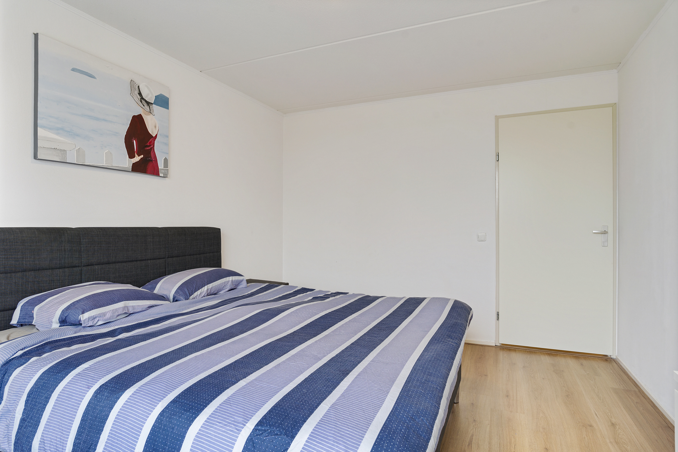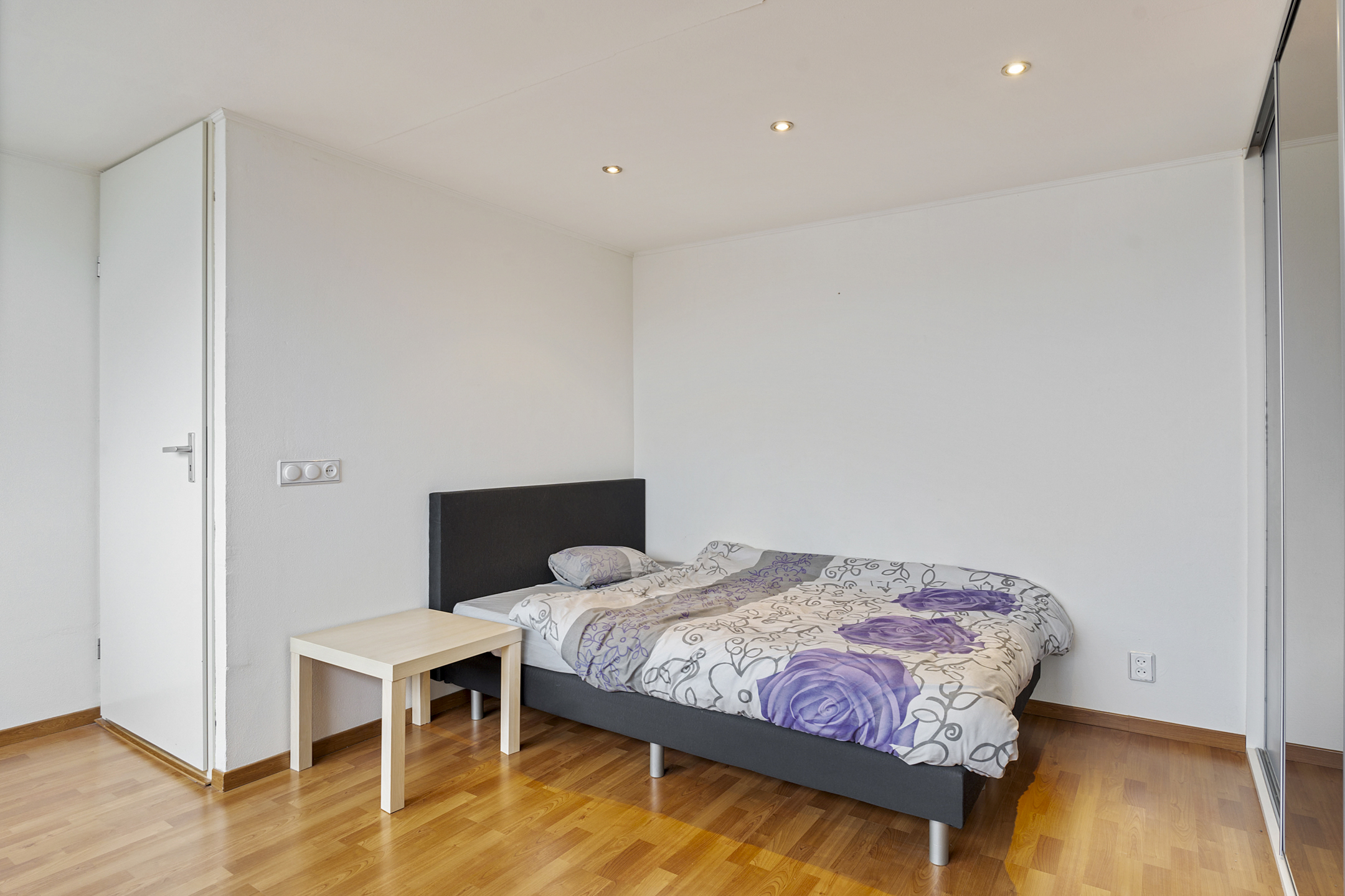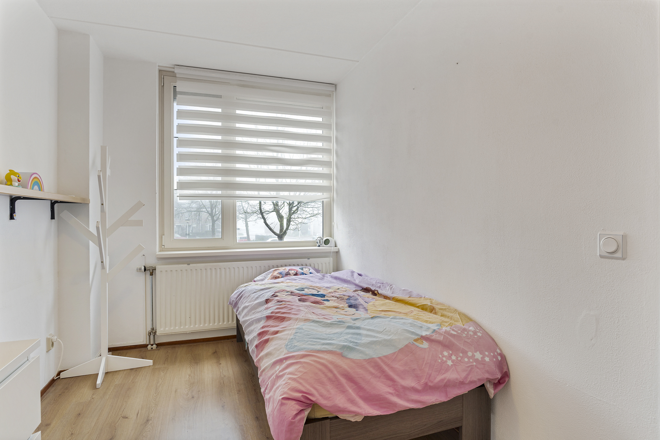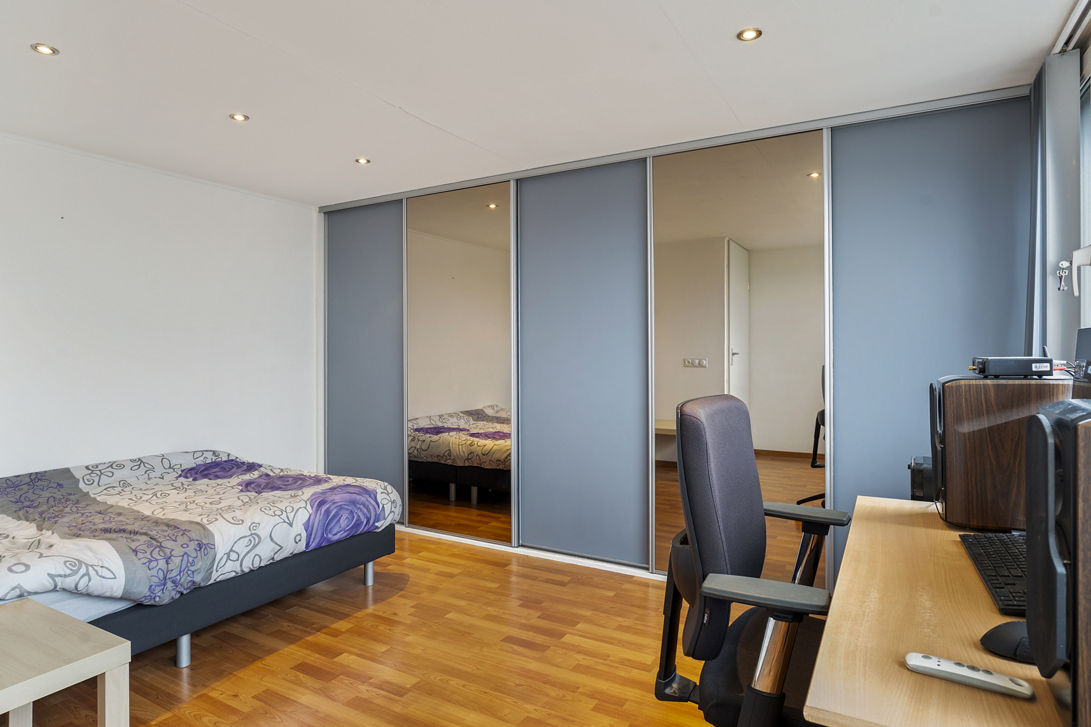 De kamer aan de achterzijde is circa 10 m² groot en beschikt over een praktische kastenwand, de Cv-kast en de wasmachine-aansluiting. De ruime slaapkamer aan de voorzijde, met een oppervlakte van circa 17 m², is voorzien van een kastenwand met schuifdeuren. Achter deze kastenwand bevindt zich een trap die leidt naar de bergvliering, wat extra opbergruimte biedt.