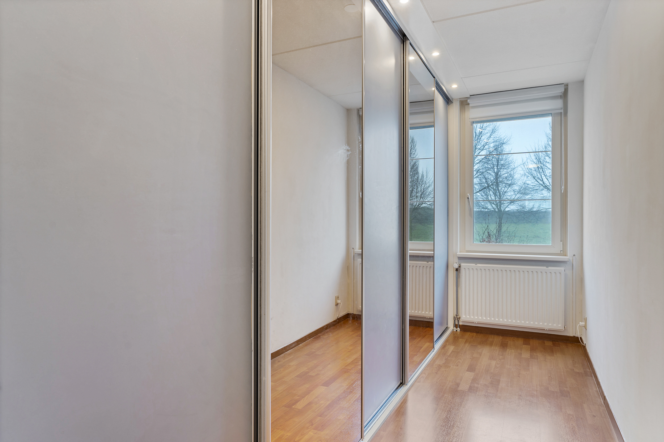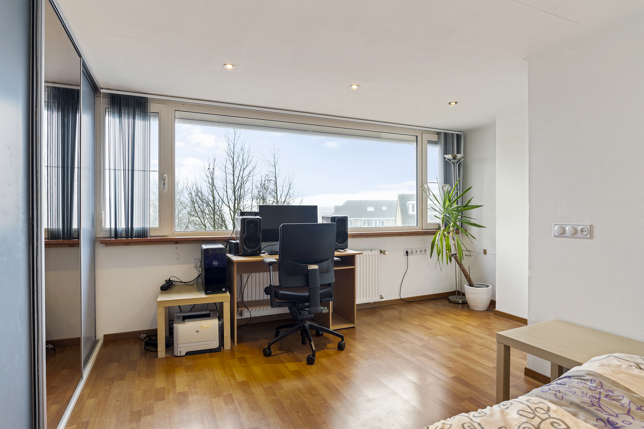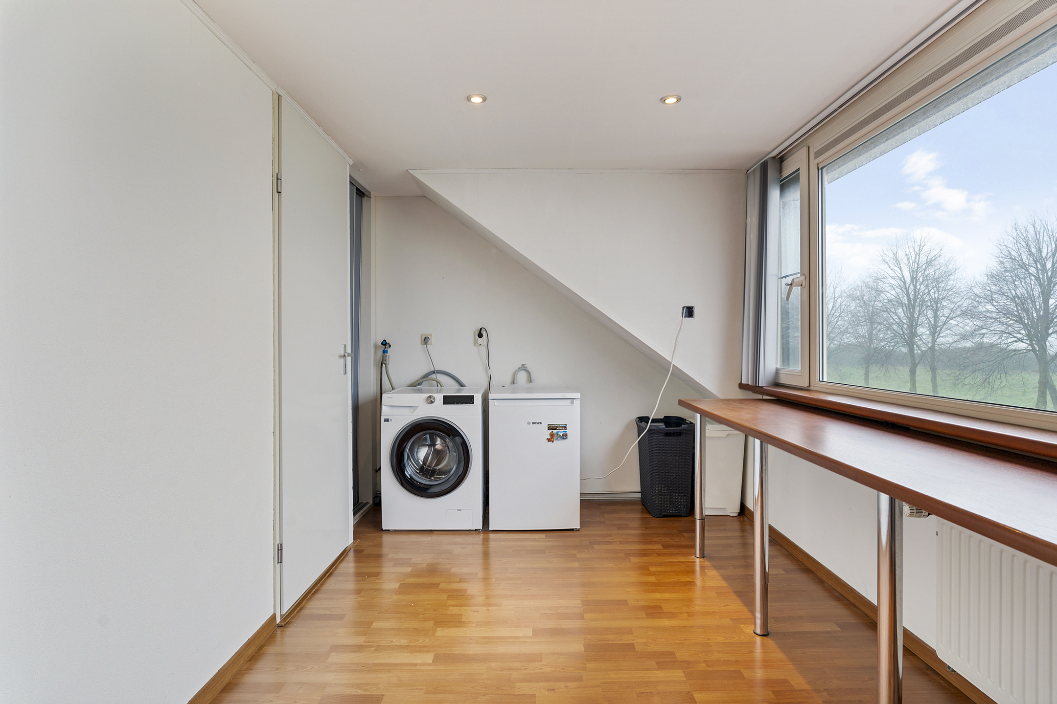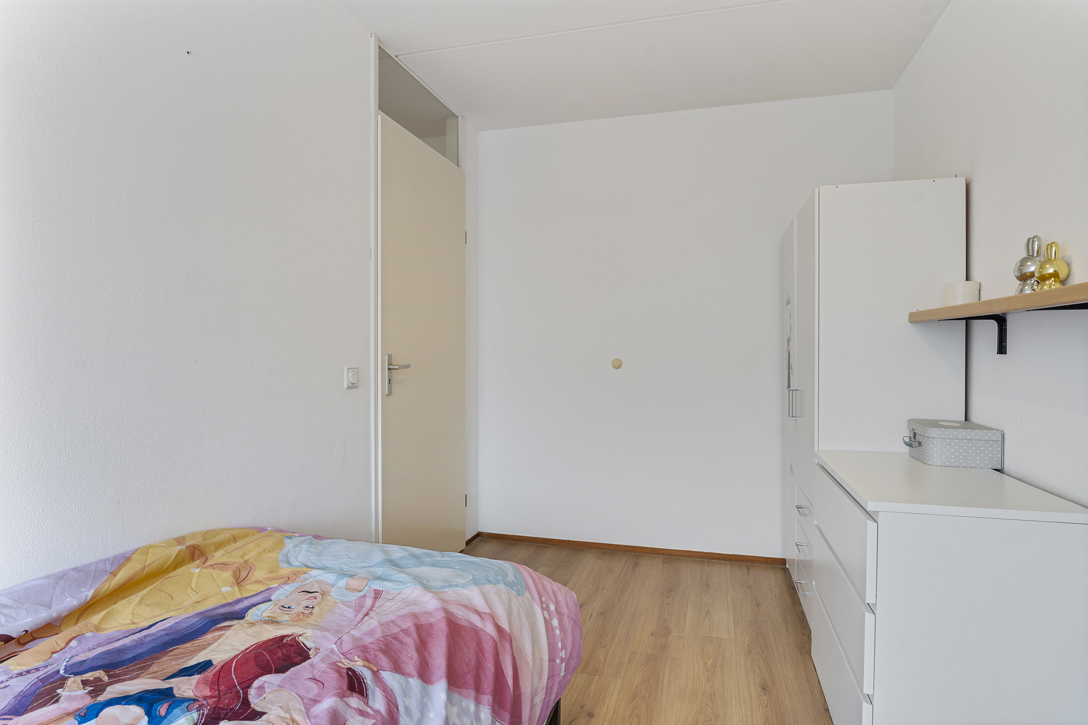 De kamer aan de achterzijde is circa 10 m² groot en beschikt over een praktische kastenwand, de Cv-kast en de wasmachine-aansluiting. De ruime slaapkamer aan de voorzijde, met een oppervlakte van circa 17 m², is voorzien van een kastenwand met schuifdeuren. Achter deze kastenwand bevindt zich een trap die leidt naar de bergvliering, wat extra opbergruimte biedt.