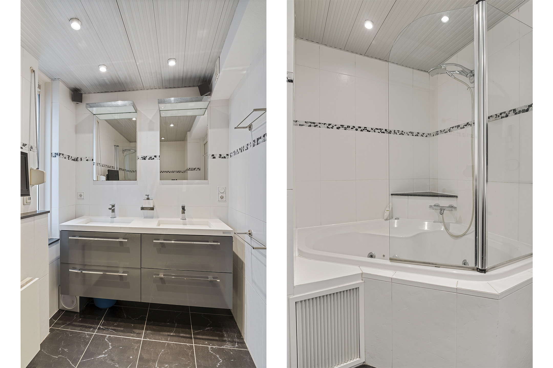De stijlvolle badkamer is van alle gemakken voorzien. Hier vind je een whirlpool-hoekligbad met een douchescherm en een badkamermeubel met een dubbele wastafel.