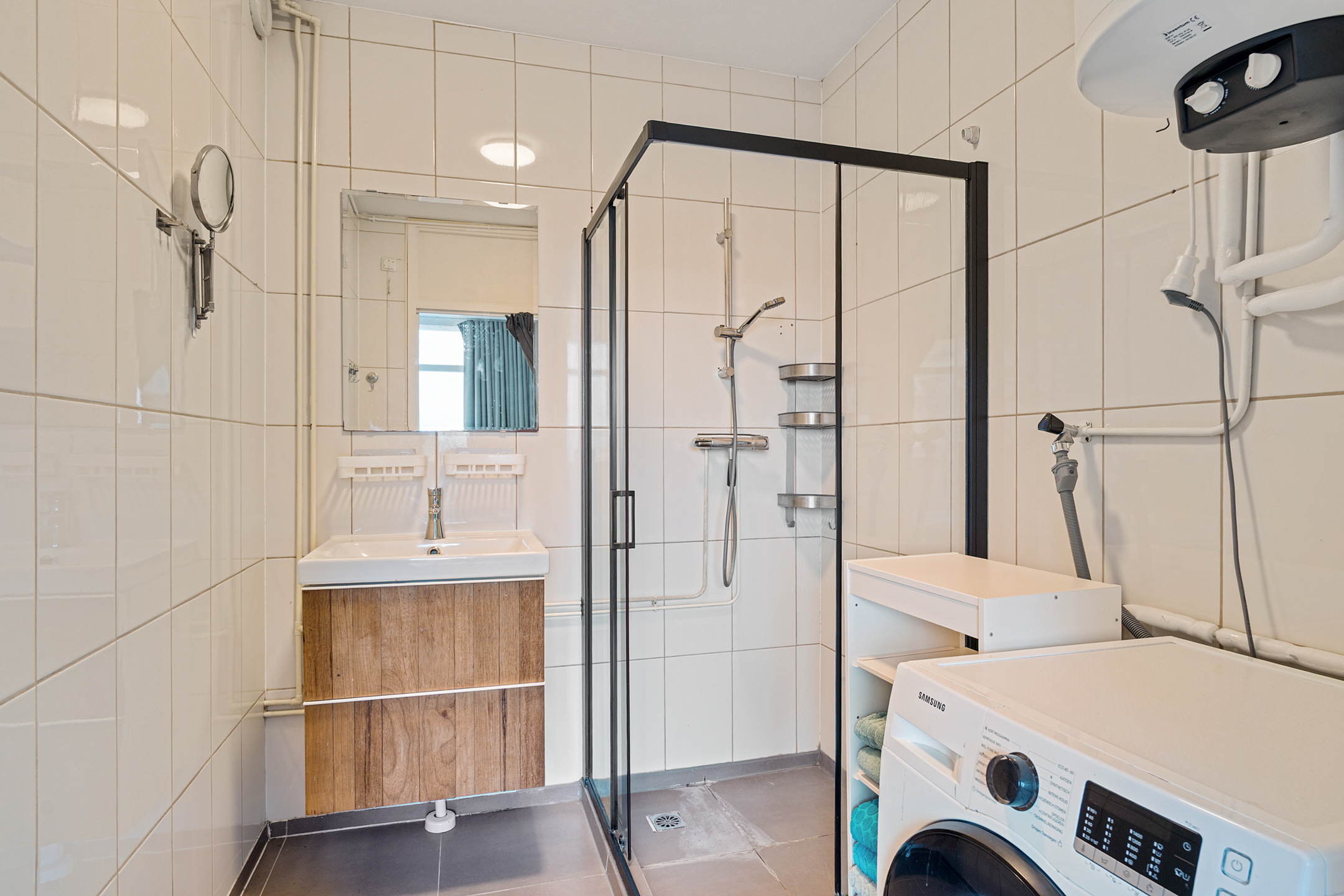 De slaapkamer is ruim en licht en biedt toegang tot de badkamer. Deze is uitgevoerd in een neutrale stijl met lichte wandtegels en bruine vloertegels. Je vindt hier een hoekdouche met glazen schuifwand, een wastafelmeubel, de wasmachineaansluiting en de boiler.