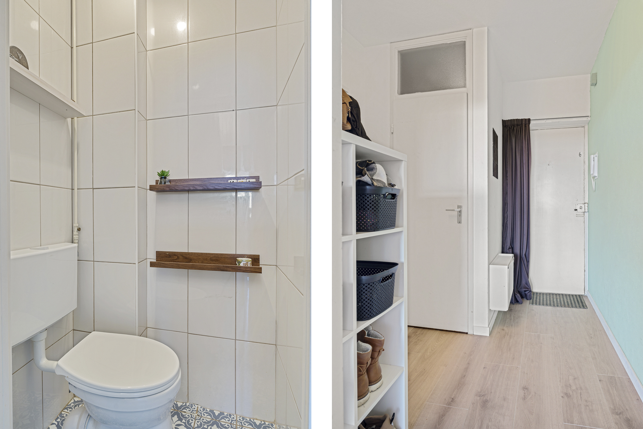 Je komt binnen in de hal met toegang tot de meterkast en het toilet, uitgevoerd in neutrale kleuren. De ruime woonkamer valt op door de brede raampartij die zorgt voor veel daglicht. Vanuit de woonkamer heb je toegang tot het balkon, de keuken en de slaapkamer.