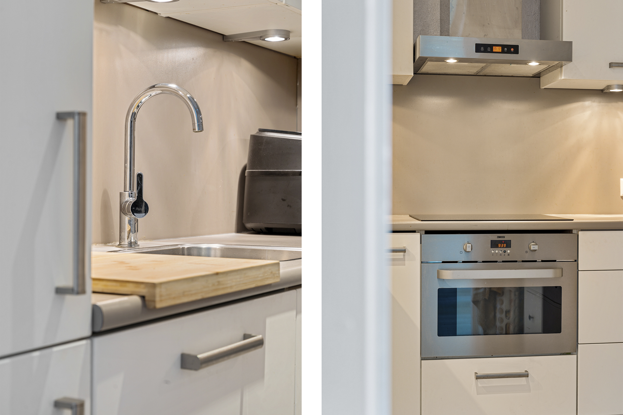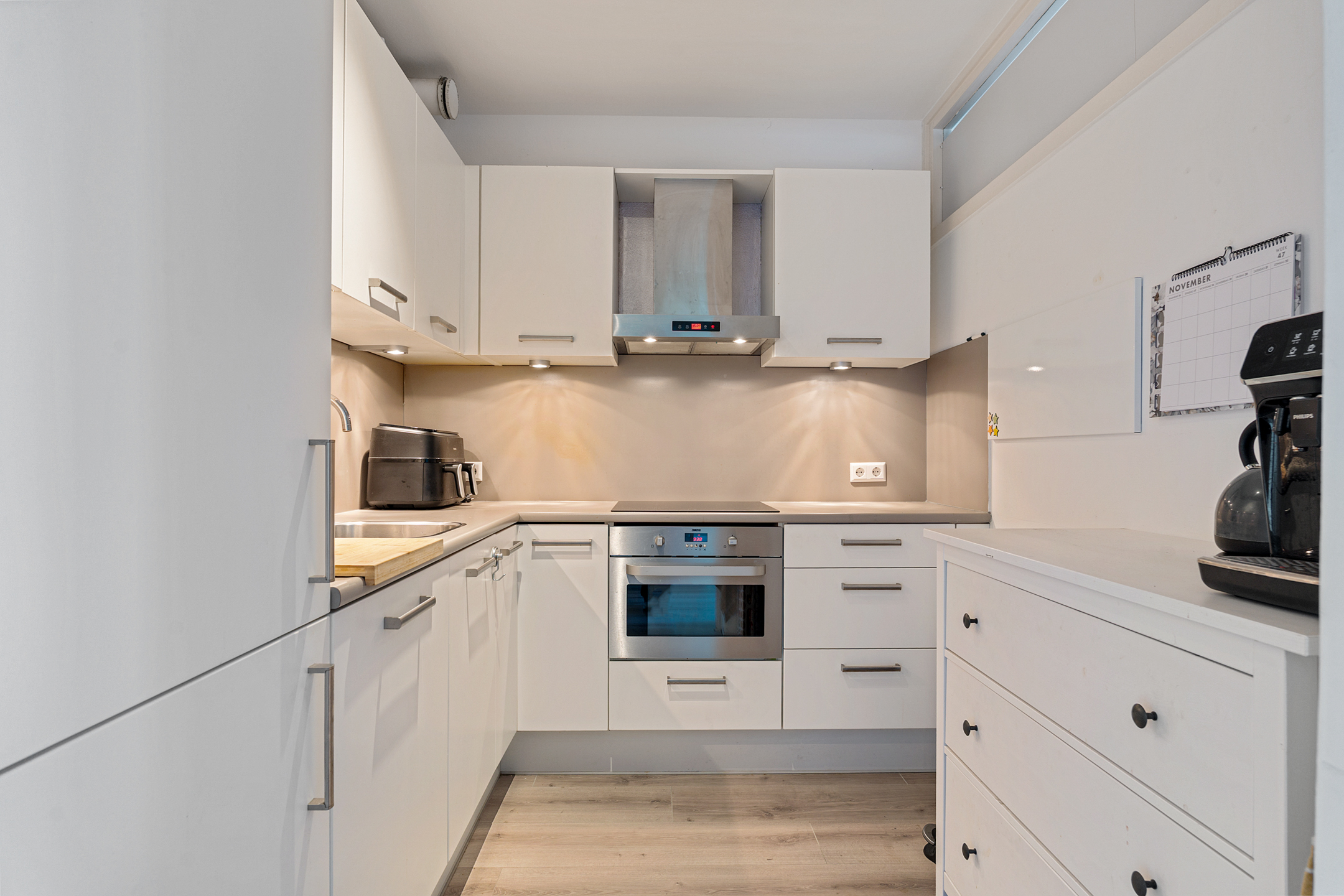 De keuken is half afgesloten, geplaatst in L-opstelling en voorzien van witte fronten, een grijs werkblad en diverse inbouwapparatuur, waaronder een inductiekookplaat, combi-oven, koelkast, vriezer en vaatwasser.