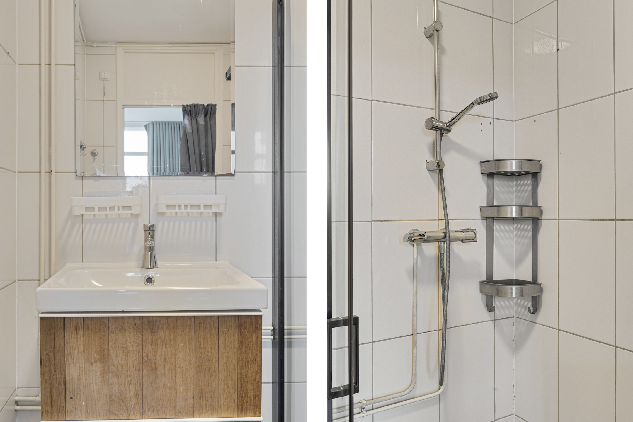 + Neutraal afgewerkte badkamer met douche en wastafelmeubel