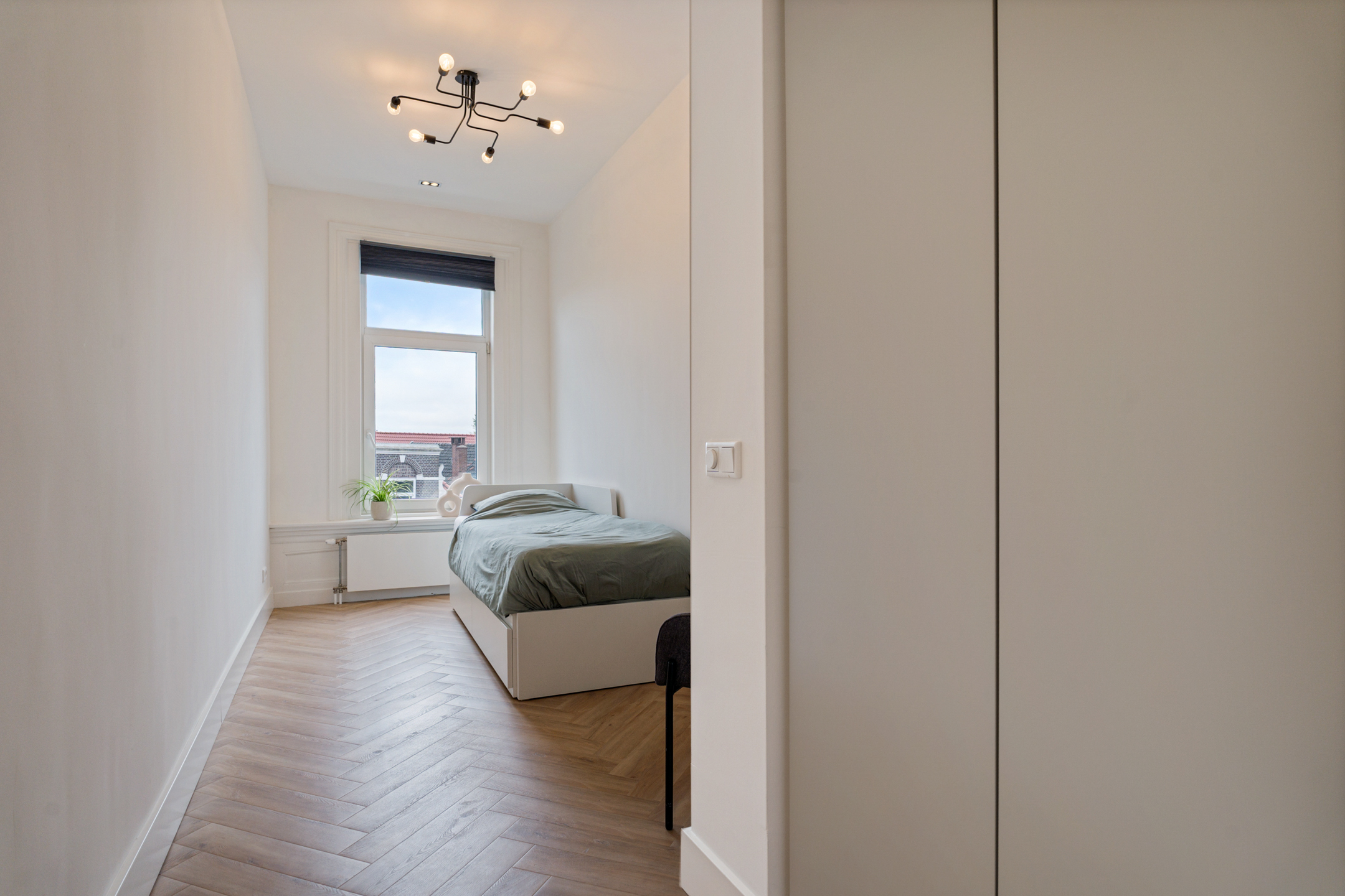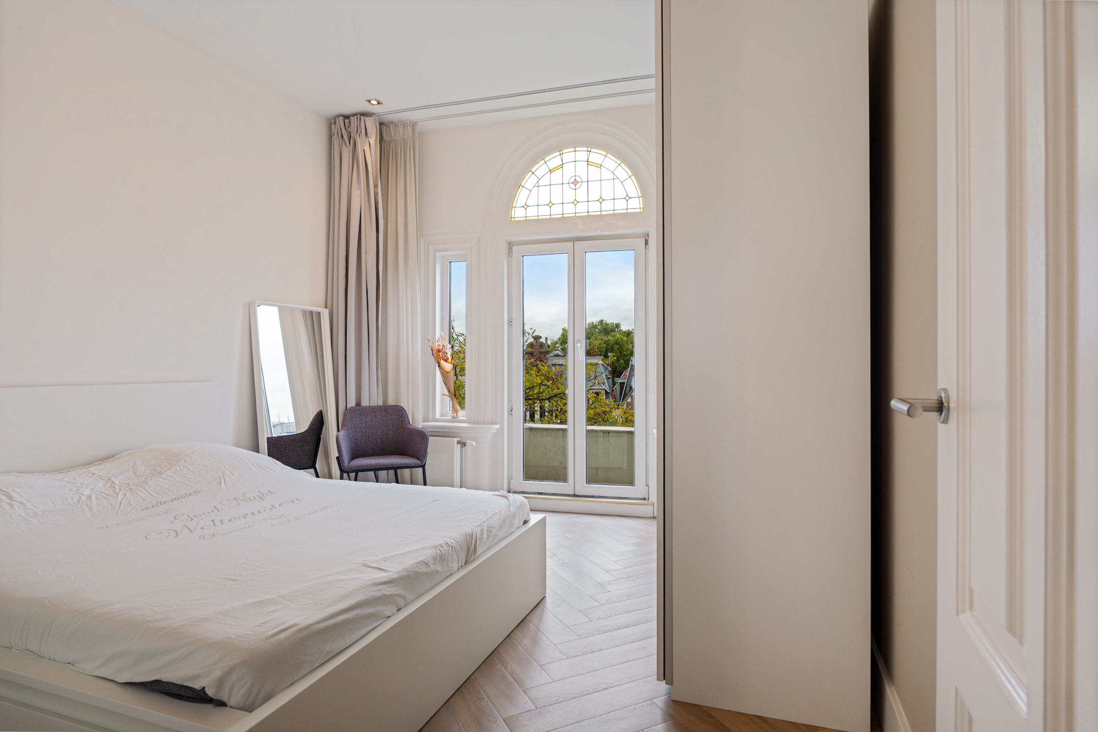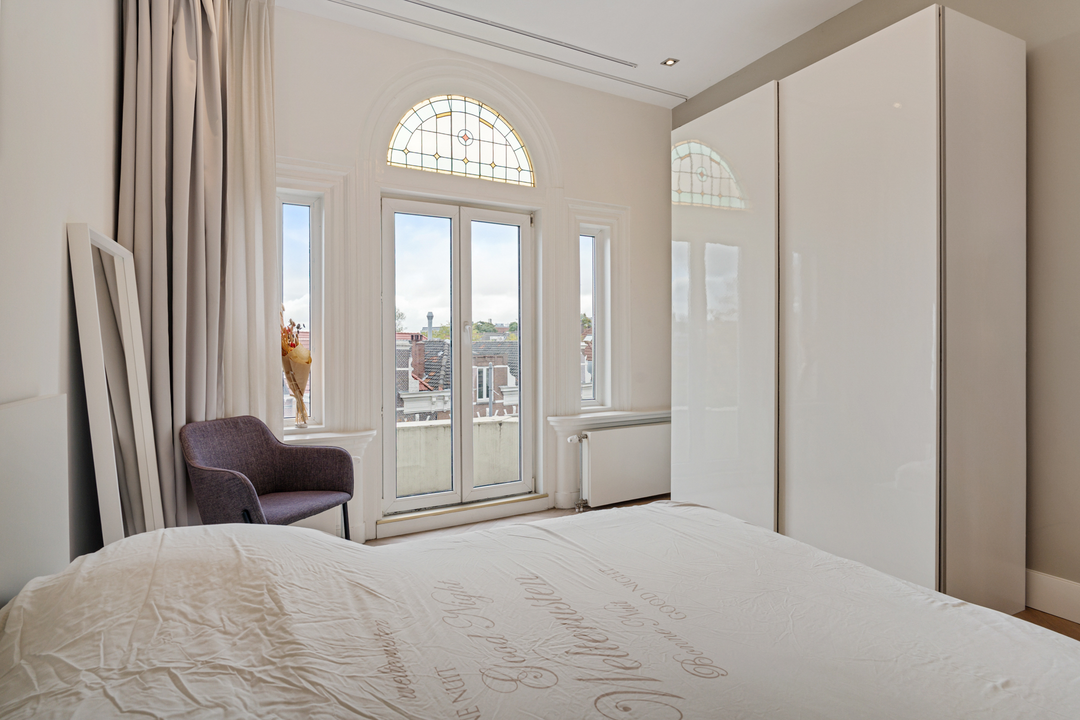 Aan de voorzijde bevinden zich twee slaapkamers, beide met een prettige lichtinval. De ruime hoofdslaapkamer heeft een eigen balkon en een karakteristiek glas-in-lood bovenraam dat zorgt voor extra sfeer. De tweede kamer is ingericht als slaap- of werkkamer en beschikt over een inloopkastgedeelte.