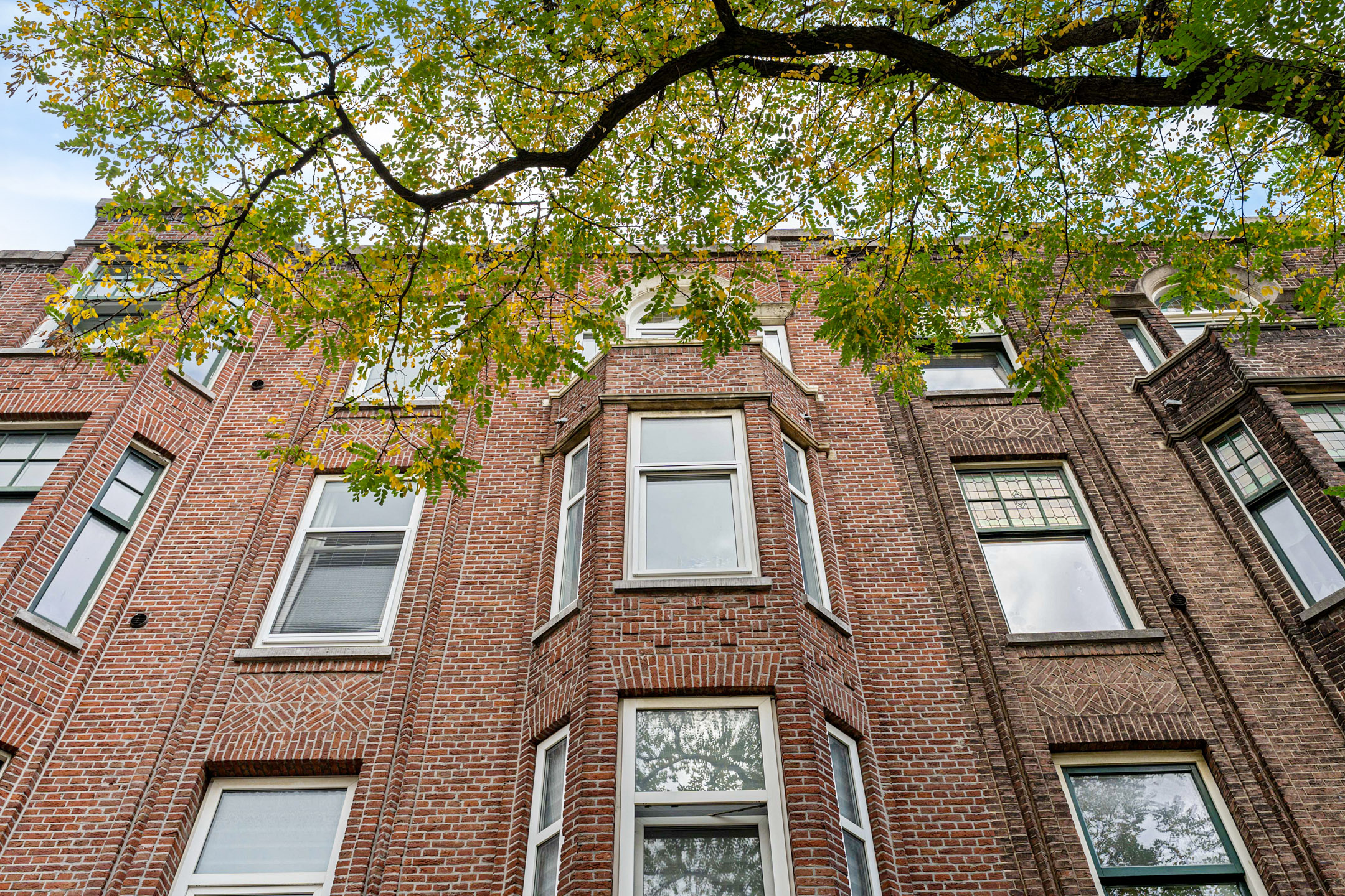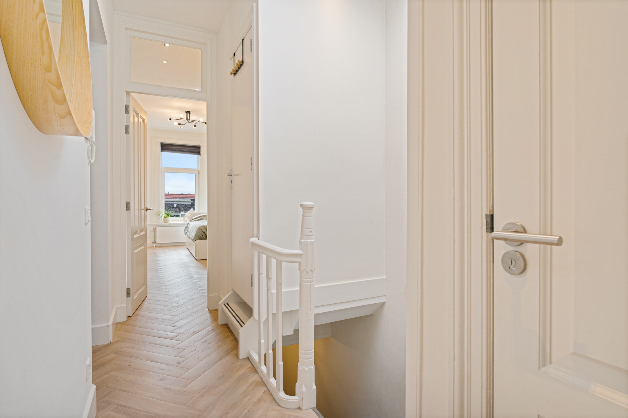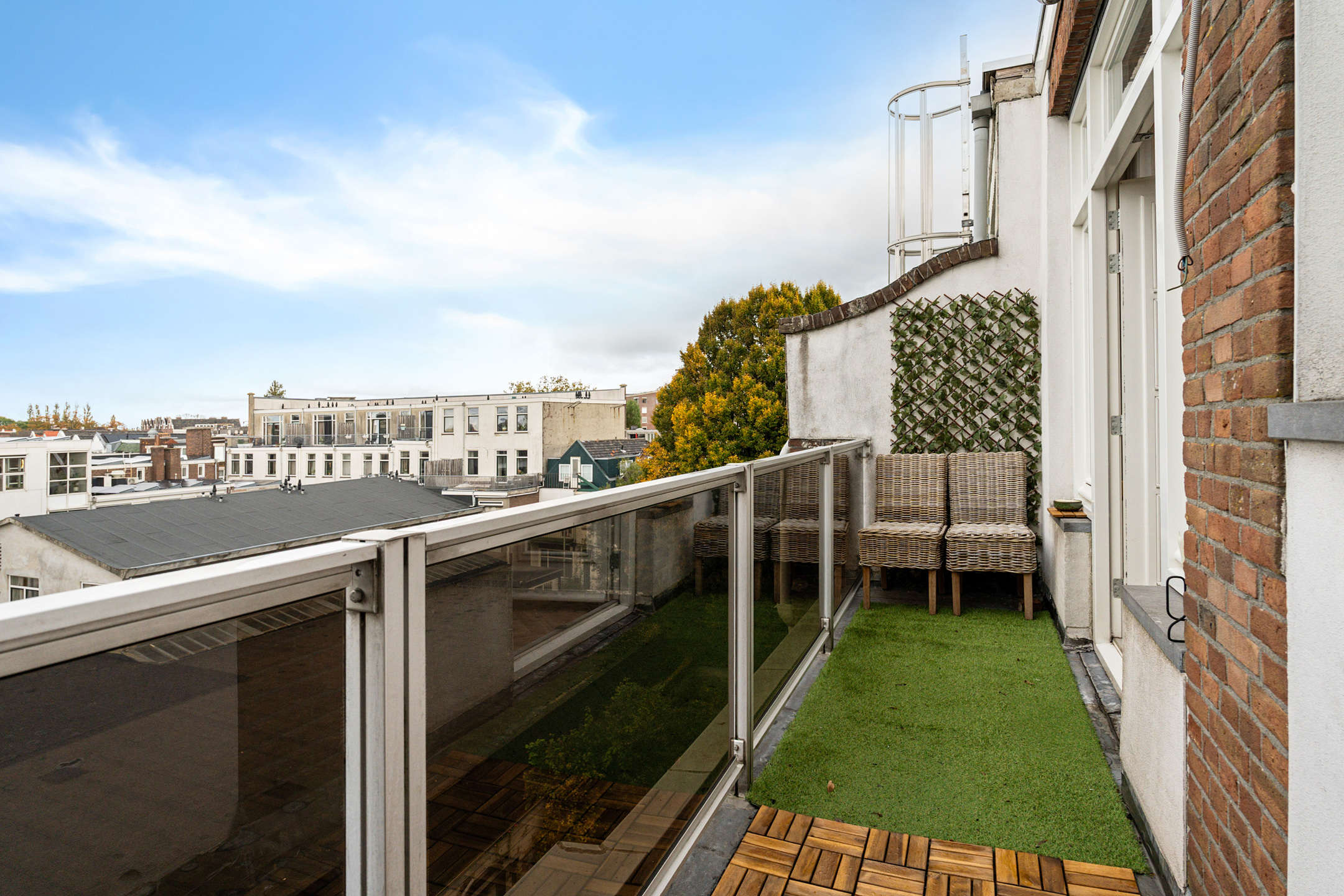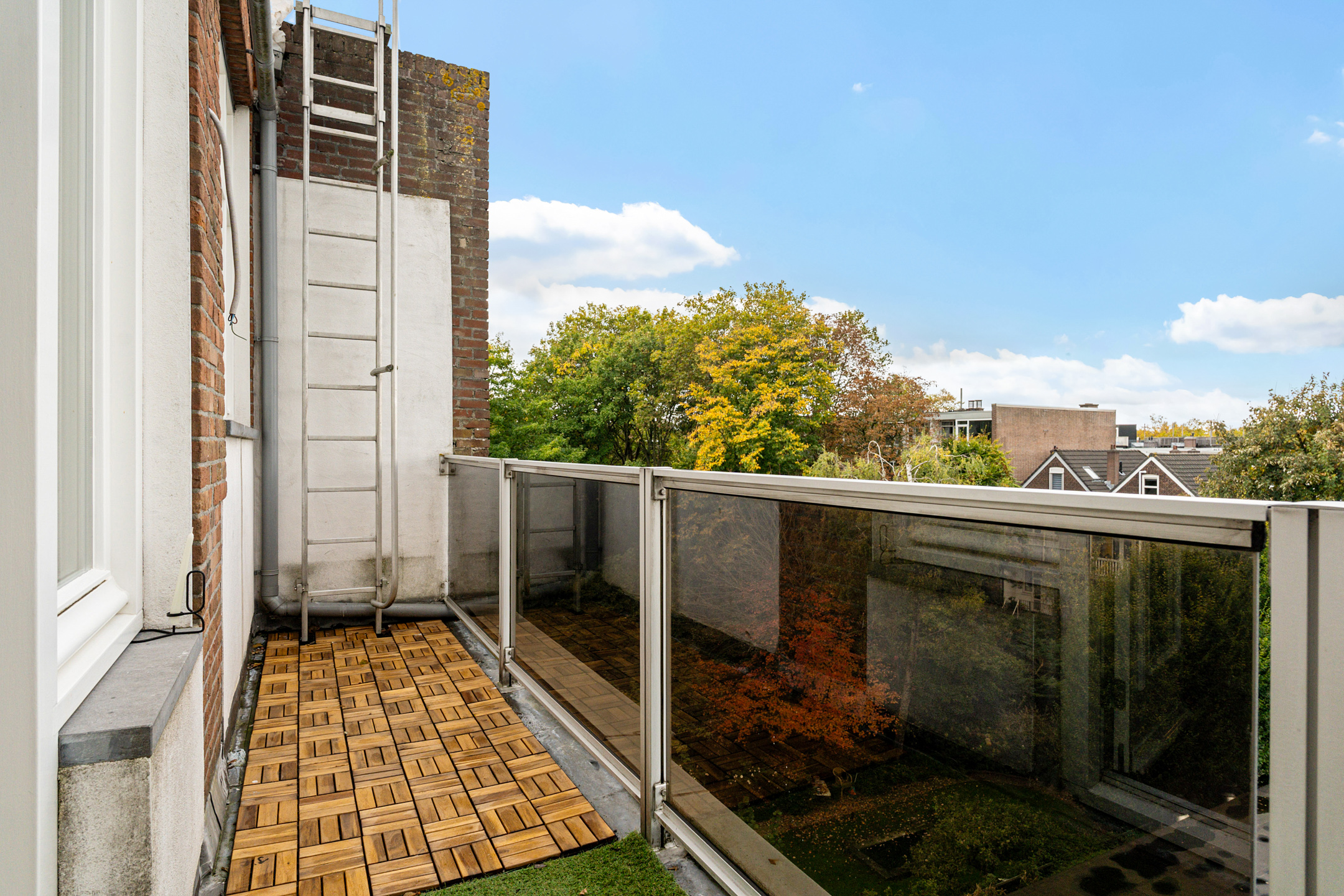 Aan de voorzijde bevinden zich twee slaapkamers, beide met een prettige lichtinval. De ruime hoofdslaapkamer heeft een eigen balkon en een karakteristiek glas-in-lood bovenraam dat zorgt voor extra sfeer. De tweede kamer is ingericht als slaap- of werkkamer en beschikt over een inloopkastgedeelte.