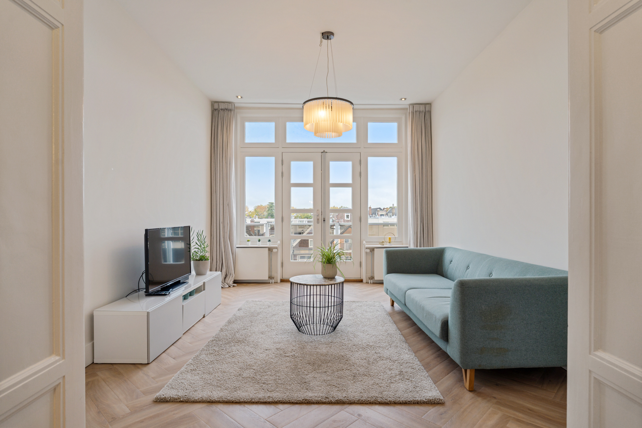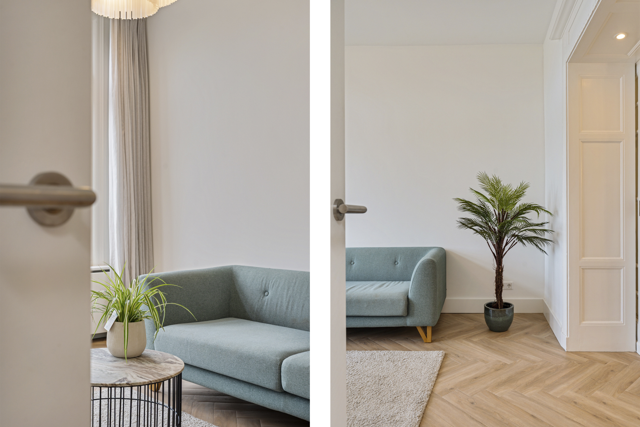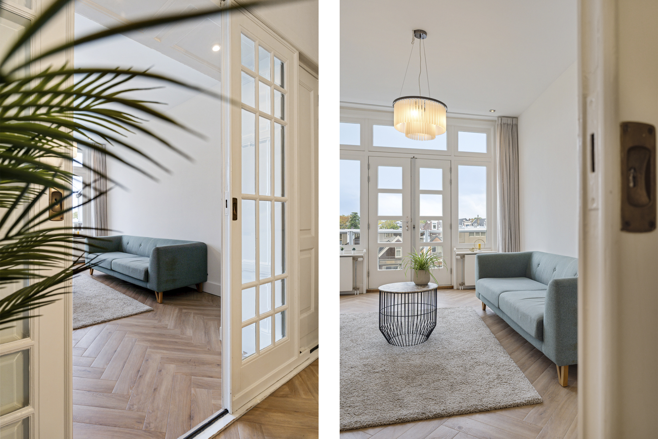 De woonkamer aan de achterzijde straalt sfeer en elegantie uit. De visgraatvloer, hoge plafonds, strakke wanden en klassieke kozijnen vormen samen een tijdloos geheel. De openslaande deuren met bovenramen laten veel licht binnen en bieden toegang tot het balkon op het noordwesten, waar je kunt genieten van de middag- en avondzon en een vrij uitzicht over de stad.