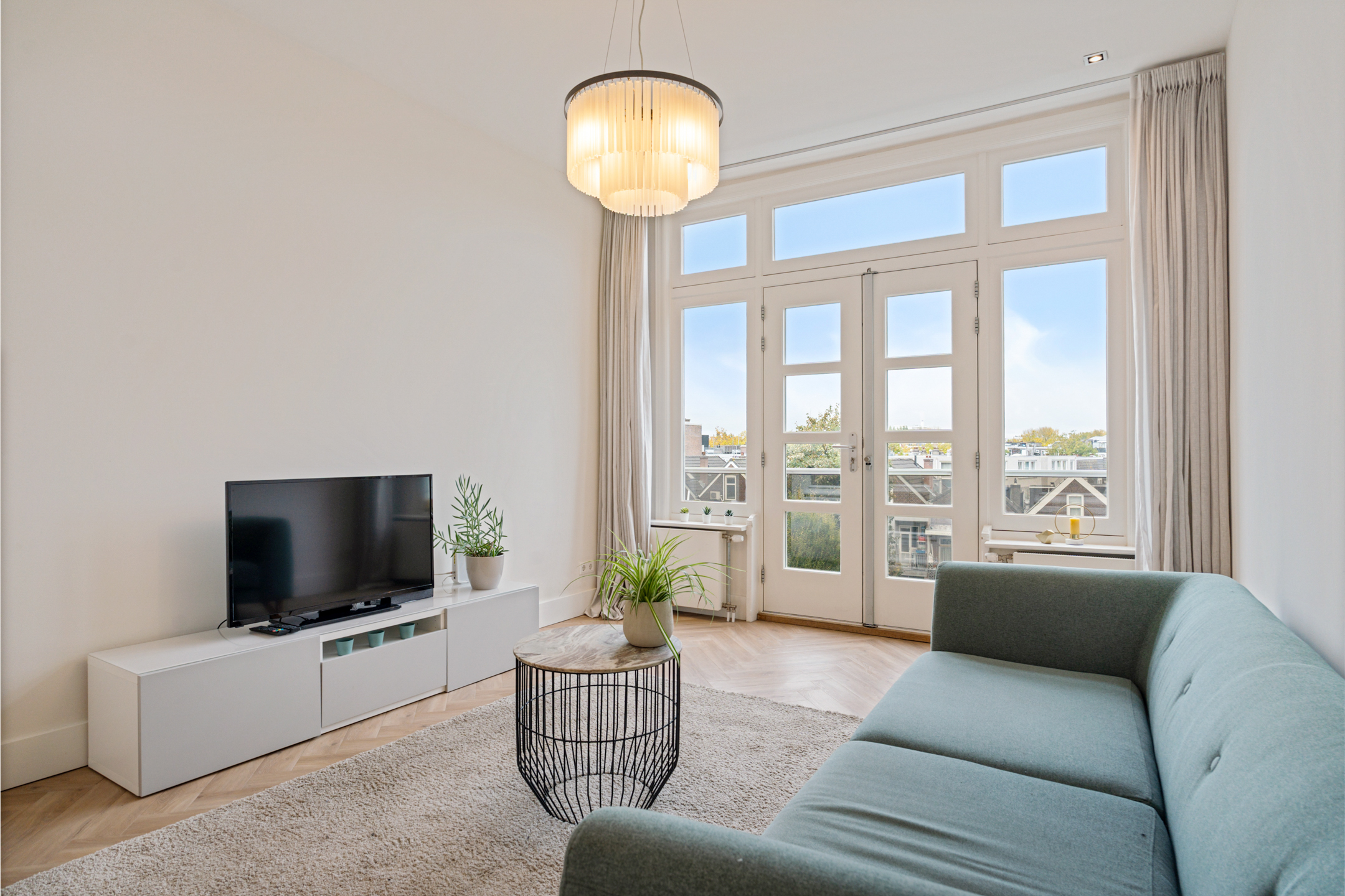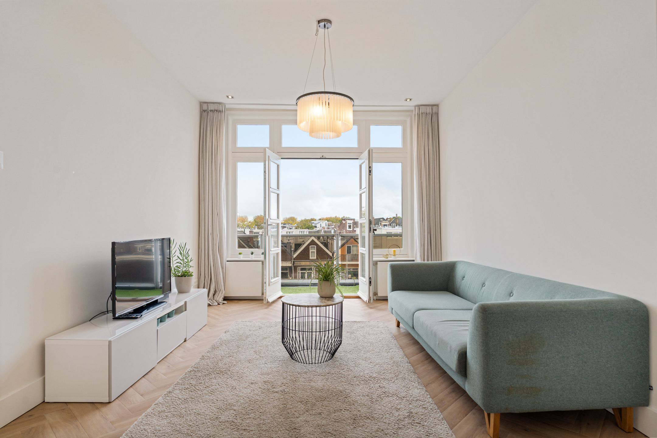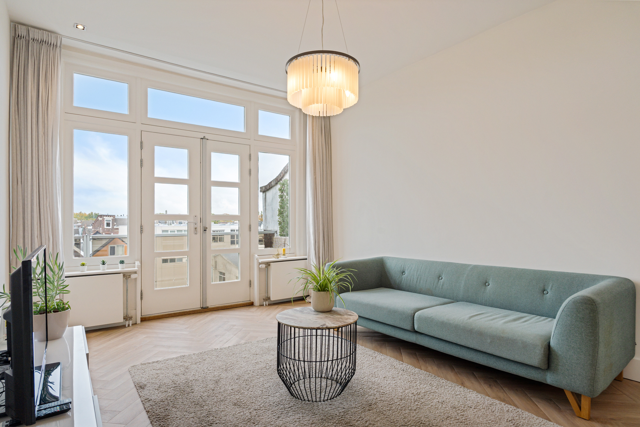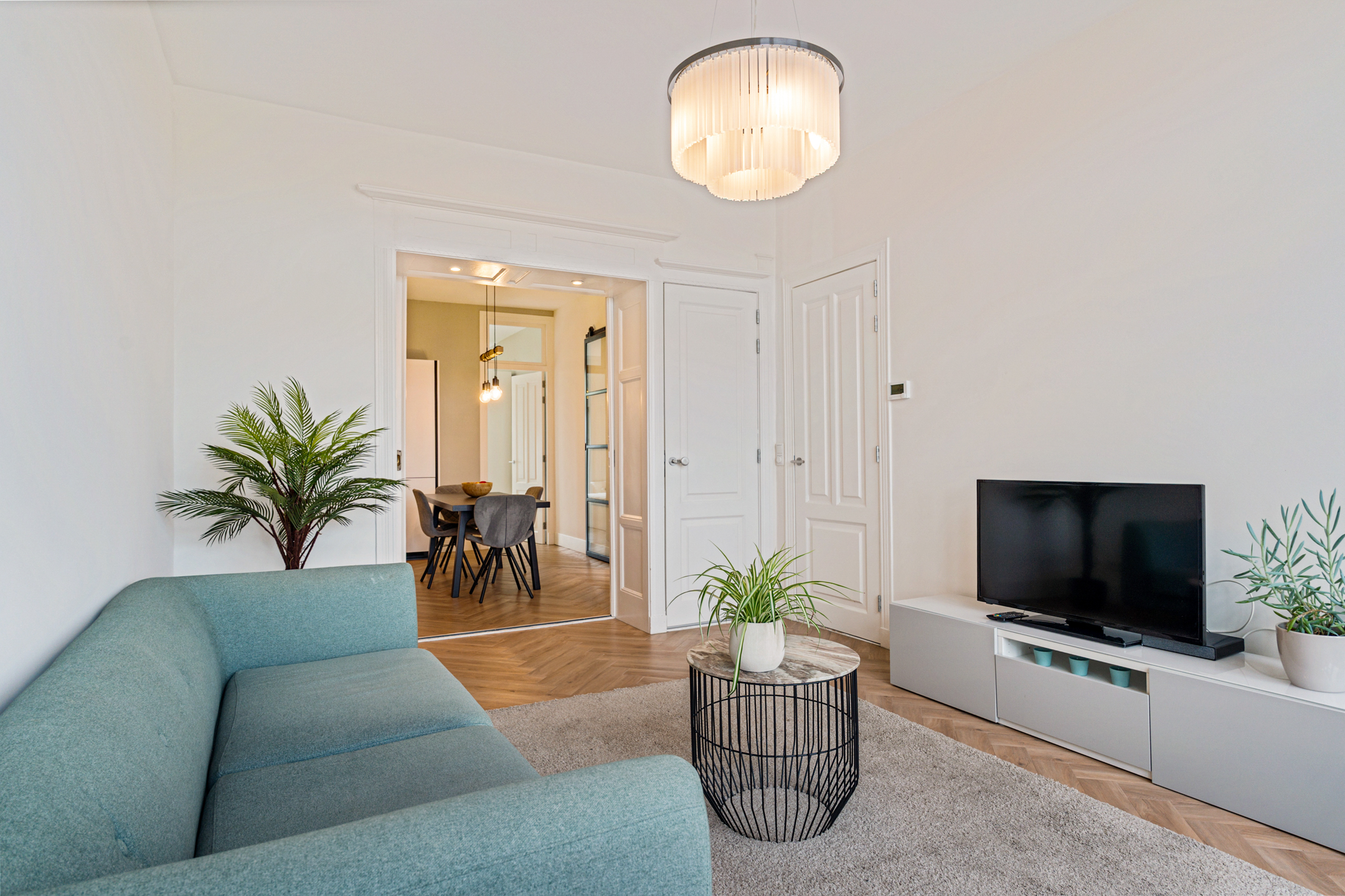 De woonkamer aan de achterzijde straalt sfeer en elegantie uit. De visgraatvloer, hoge plafonds, strakke wanden en klassieke kozijnen vormen samen een tijdloos geheel. De openslaande deuren met bovenramen laten veel licht binnen en bieden toegang tot het balkon op het noordwesten, waar je kunt genieten van de middag- en avondzon en een vrij uitzicht over de stad.