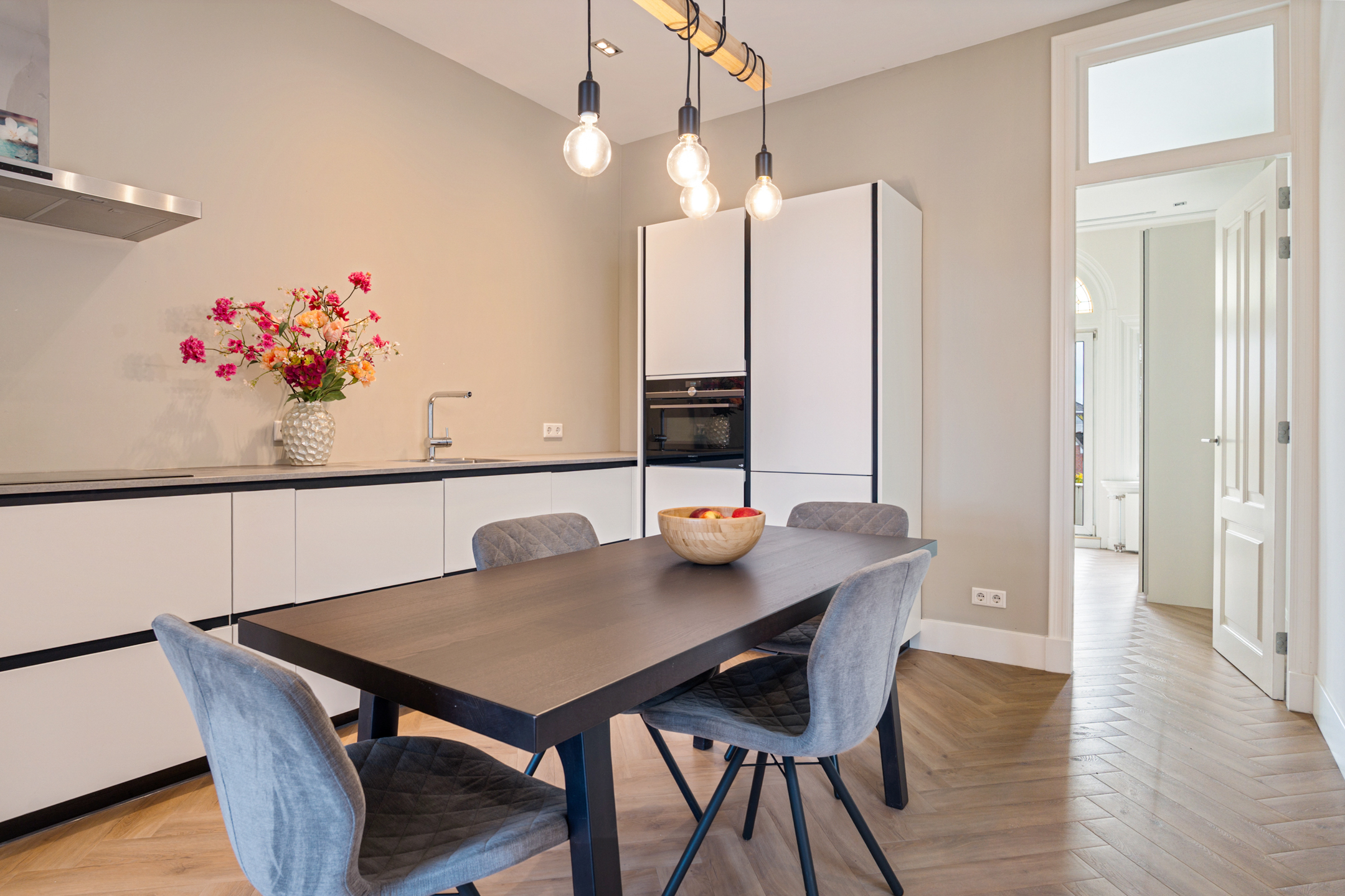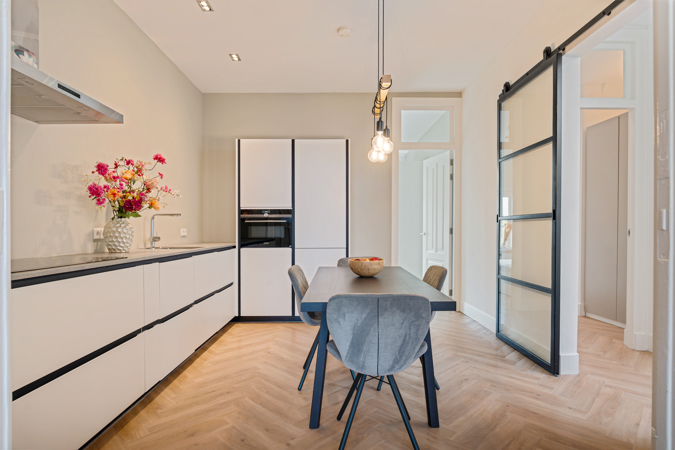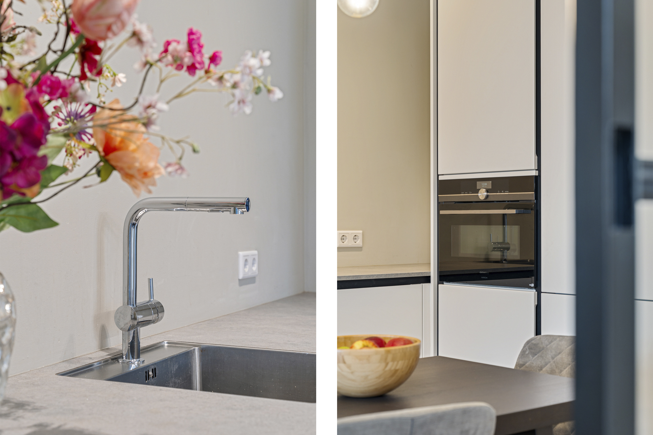 Centraal in de woning ligt de moderne keuken, stijlvol afgewerkt in eigentijdse kleuren en voorzien van hoogwaardige inbouwapparatuur: een inductiekookplaat, combi-oven, vaatwasser, koelkast en vriezer. De en suite schuifdeuren met glas zorgen voor een karaktervolle overgang tussen keuken en woonkamer, terwijl de ruimte open en licht blijft.
