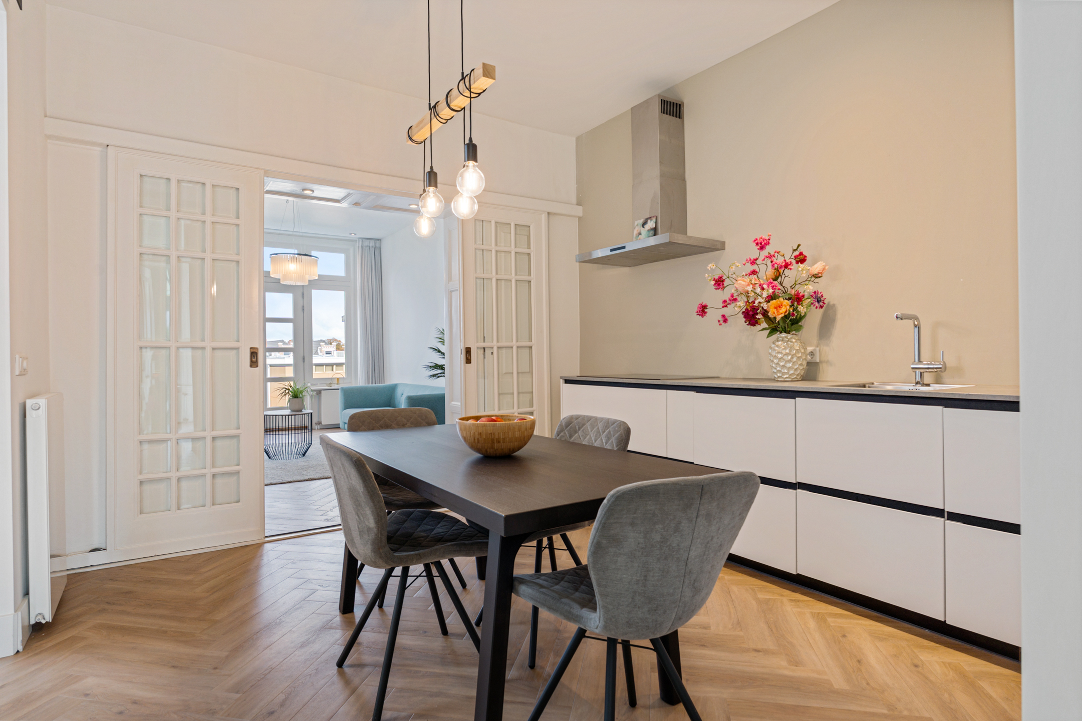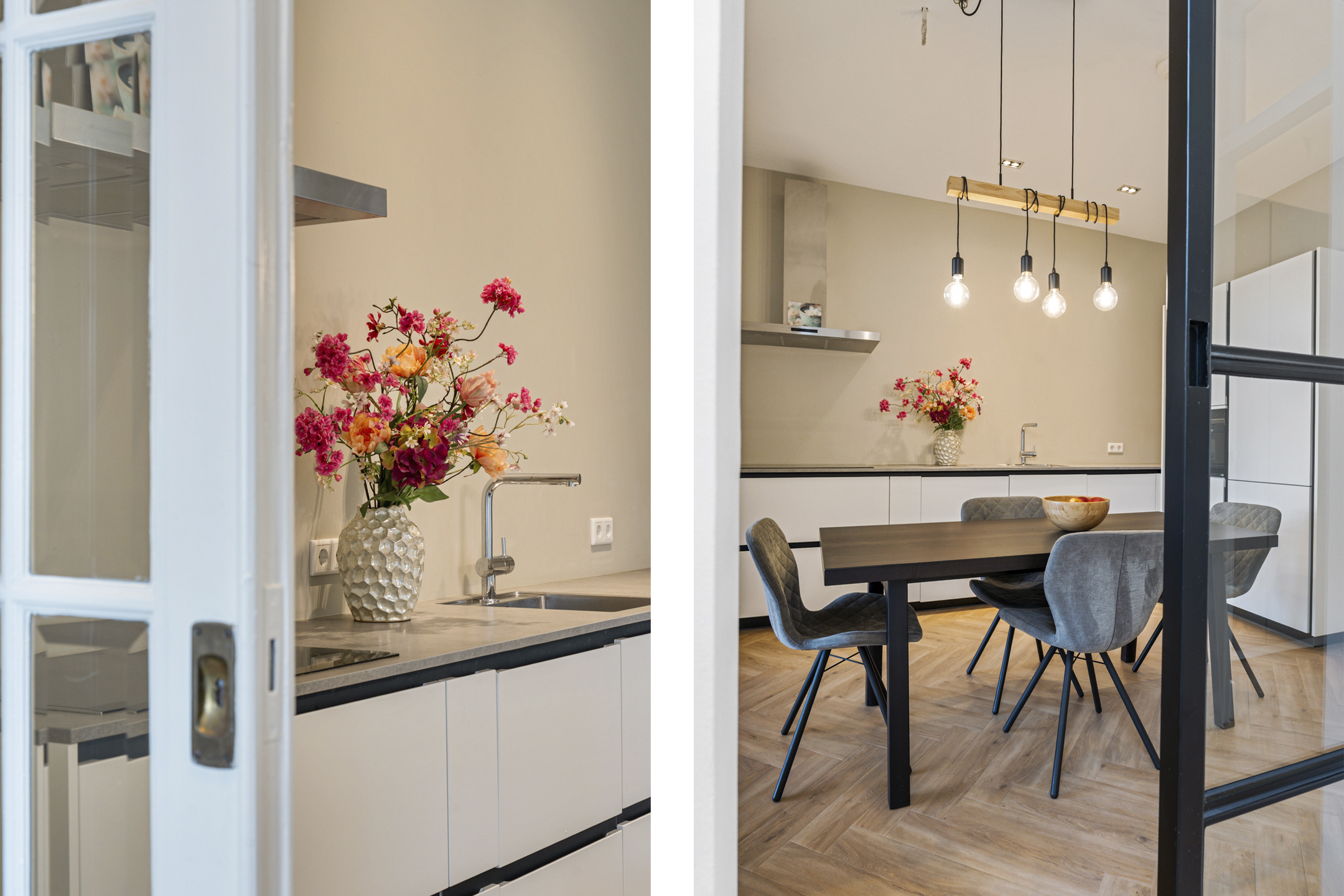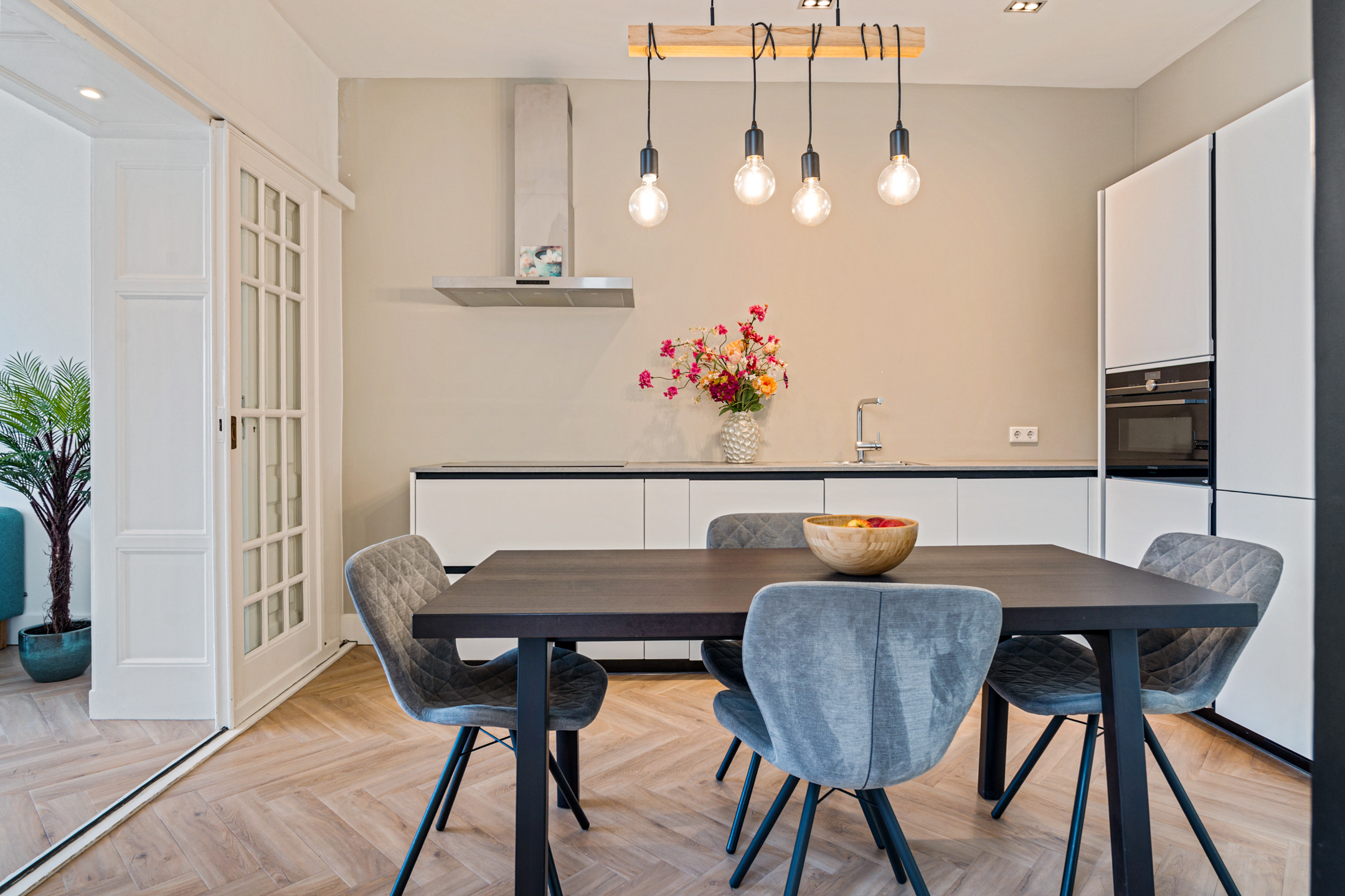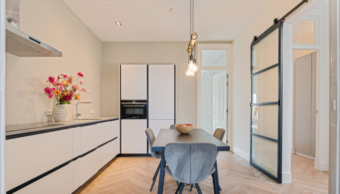 Centraal in de woning ligt de moderne keuken, stijlvol afgewerkt in eigentijdse kleuren en voorzien van hoogwaardige inbouwapparatuur: een inductiekookplaat, combi-oven, vaatwasser, koelkast en vriezer. De en suite schuifdeuren met glas zorgen voor een karaktervolle overgang tussen keuken en woonkamer, terwijl de ruimte open en licht blijft.