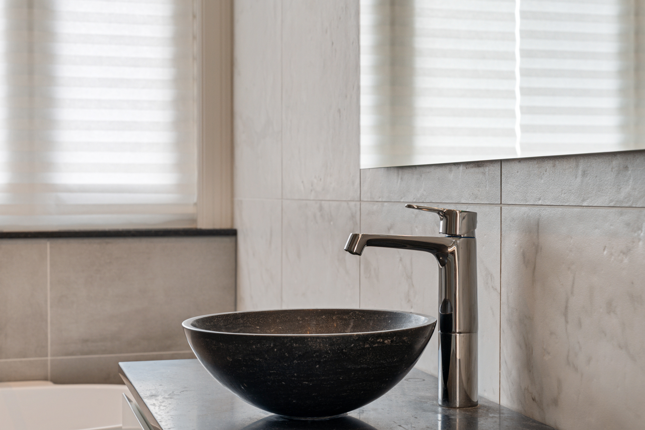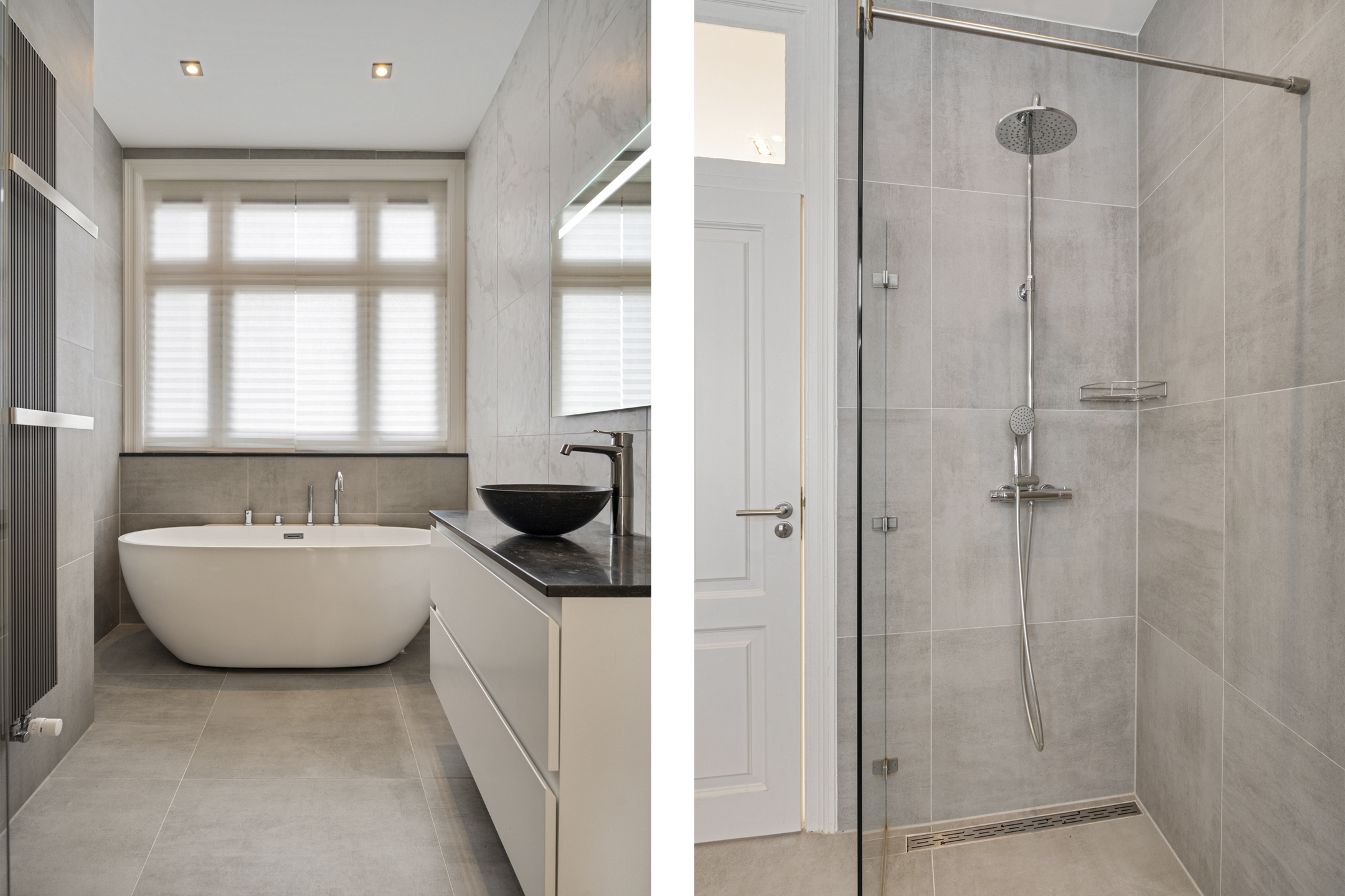 De luxe badkamer is uitgevoerd in moderne grijstinten en vormt een oase van rust. Je vindt hier een vrijstaand bad, ruime inloopdouche met regendouche, elegant wastafelmeubel met natuurstenen waskom, verwarmde spiegel en stijlvolle verlichting. Alles is tot in detail afgewerkt met hoogwaardige materialen en de badkamer beschikt over elektrische vloerverwarming.
